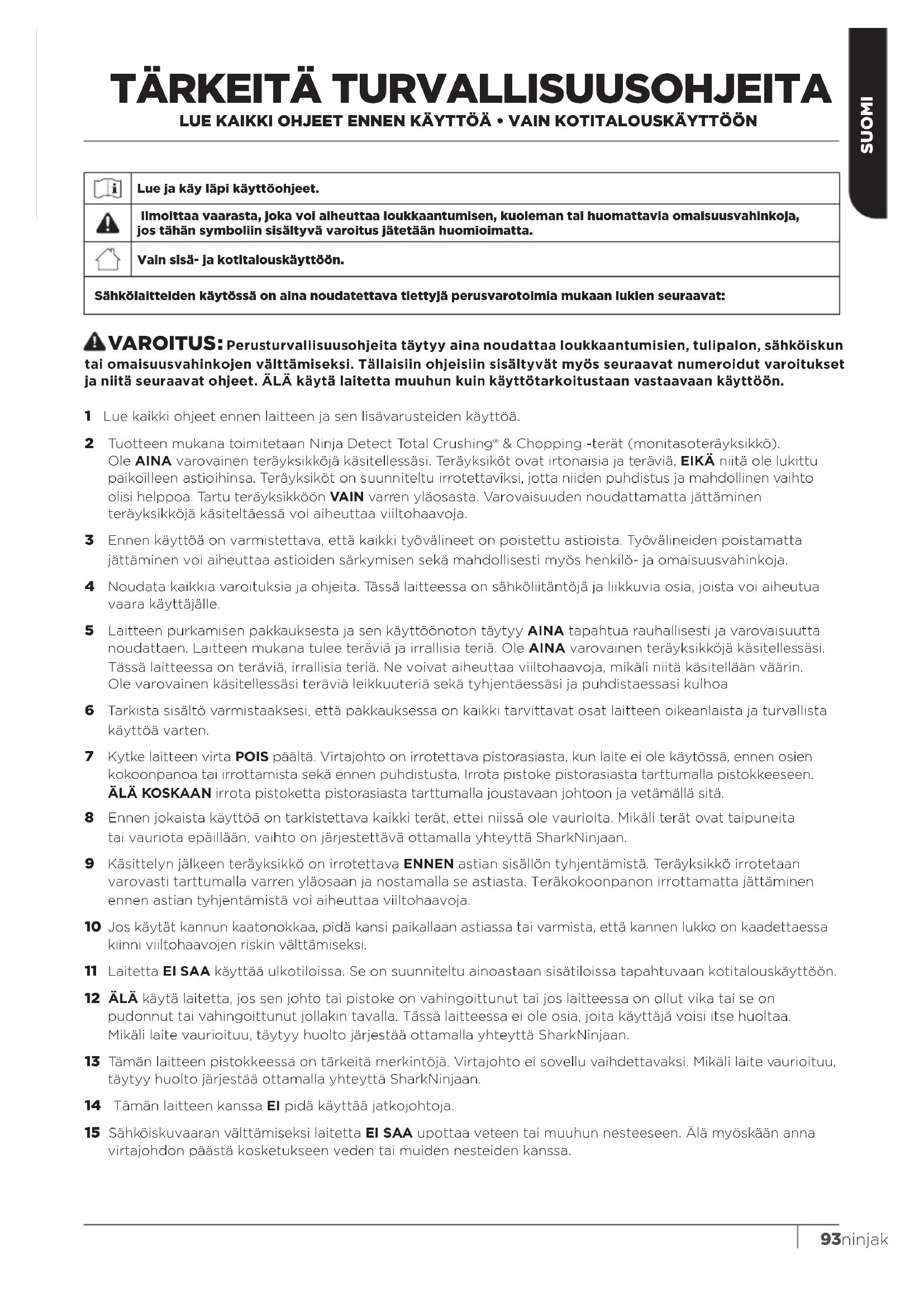 www.registeryourninja.eu Skannaa QR-koodi mobiililaitteella 921 Lue kaikki ohjeet ennen laitteen ja sen lisävarusteiden käyttöä. 2 Tuotteen mukana toimitetaan Ninja Detect Total Crushing® & Chopping -terät (monitasoteräyksikkö). Ole AINA varovainen teräyksikköjä käsitellessäsi. Teräyksiköt ovat irtonaisia ja teräviä, EIKÄ niitä ole lukittu paikoilleen astioihinsa. Teräyksiköt on suunniteltu irrotettaviksi, jotta niiden puhdistus ja mahdollinen vaihto olisi helppoa. Tartu teräyksikköön VAIN varren yläosasta. Varovaisuuden noudattamatta jättäminen teräyksikköjä käsiteltäessä voi aiheuttaa viiltohaavoja. 3 Ennen käyttöä on varmistettava, että kaikki työvälineet on poistettu astioista. Työvälineiden poistamatta jättäminen voi aiheuttaa astioiden särkymisen sekä mahdollisesti myös henkilö- ja omaisuusvahinkoja. 4 Noudata kaikkia varoituksia ja ohjeita. Tässä laitteessa on sähköliitäntöjä ja liikkuvia osia, joista voi aiheutua vaara käyttäjälle. 5 Laitteen purkamisen pakkauksesta ja sen käyttöönoton täytyy AINA tapahtua rauhallisesti ja varovaisuutta noudattaen. Laitteen mukana tulee teräviä ja irrallisia teriä. Ole AINA varovainen teräyksikköjä käsitellessäsi. Tässä laitteessa on teräviä, irrallisia teriä. Ne voivat aiheuttaa viiltohaavoja, mikäli niitä käsitellään väärin. Ole varovainen käsitellessäsi teräviä leikkuuteriä sekä tyhjentäessäsi ja puhdistaessasi kulhoa 6 Tarkista sisältö varmistaaksesi, että pakkauksessa on kaikki tarvittavat osat laitteen oikeanlaista ja turvallista käyttöä varten. 7 Kytke laitteen virta POIS päältä. Virtajohto on irrotettava pistorasiasta, kun laite ei ole käytössä, ennen osien kokoonpanoa tai irrottamista sekä ennen puhdistusta. Irrota pistoke pistorasiasta tarttumalla pistokkeeseen. ÄLÄ KOSKAAN irrota pistoketta pistorasiasta tarttumalla joustavaan johtoon ja vetämällä sitä. 8 Ennen jokaista käyttöä on tarkistettava kaikki terät, ettei niissä ole vaurioita. Mikäli terät ovat taipuneita tai vauriota epäillään, vaihto on järjestettävä ottamalla yhteyttä SharkNinjaan. 9 Käsittelyn jälkeen teräyksikkö on irrotettava ENNEN astian sisällön tyhjentämistä. Teräyksikkö irrotetaan varovasti tarttumalla varren yläosaan ja nostamalla se astiasta. Teräkokoonpanon irrottamatta jättäminen ennen astian tyhjentämistä voi aiheuttaa viiltohaavoja. 10 Jos käytät kannun kaatonokkaa, pidä kansi paikallaan astiassa tai varmista, että kannen lukko on kaadettaessa kiinni viiltohaavojen riskin välttämiseksi. 11 Laitetta EI SAA käyttää ulkotiloissa. Se on suunniteltu ainoastaan sisätiloissa tapahtuvaan kotitalouskäyttöön. 12 ÄLÄ käytä laitetta, jos sen johto tai pistoke on vahingoittunut tai jos laitteessa on ollut vika tai se on pudonnut tai vahingoittunut jollakin tavalla. Tässä laitteessa ei ole osia, joita käyttäjä voisi itse huoltaa. Mikäli laite vaurioituu, täytyy huolto järjestää ottamalla yhteyttä SharkNinjaan. 13 Tämän laitteen pistokkeessa on tärkeitä merkintöjä. Virtajohto ei sovellu vaihdettavaksi. Mikäli laite vaurioituu, täytyy huolto järjestää ottamalla yhteyttä SharkNinjaan. 14 Tämän laitteen kanssa EI pidä käyttää jatkojohtoja. 15 Sähköiskuvaaran välttämiseksi laitetta EI SAA upottaa veteen tai muuhun nesteeseen. Älä myöskään anna virtajohdon päästä kosketukseen veden tai muiden nesteiden kanssa. VAROITUS: Perusturvallisuusohjeita täytyy aina noudattaa loukkaantumisien, tulipalon, sähköiskun tai omaisuusvahinkojen välttämiseksi. Tällaisiin ohjeisiin sisältyvät myös seuraavat numeroidut varoitukset ja niitä seuraavat ohjeet. ÄLÄ käytä laitetta muuhun kuin käyttötarkoitustaan vastaavaan käyttöön. Lue ja käy läpi käyttöohjeet. Ilmoittaa vaarasta, joka voi aiheuttaa loukkaantumisen, kuoleman tai huomattavia omaisuusvahinkoja, jos tähän symboliin sisältyvä varoitus jätetään huomioimatta.Vain sisä- ja kotitalouskäyttöön. Sähkölaitteiden käytössä on aina noudatettava tiettyjä perusvarotoimia mukaan lukien seuraavat: