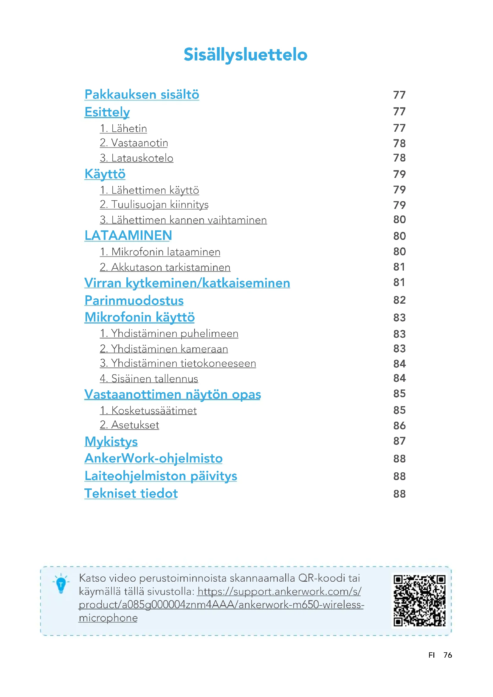 Mykistys AnkerWork-ohjelmisto Laiteohjelmiston päivitys Tekniset tiedot Katso video perustoiminnoista skannaamalla QR-koodi tai käymällä tällä sivustolla: https://support.ankerwork.com/s/ product/a085g000004znm4AAA/ankerwork-m650-wireless- microphone Sisällysluettelo