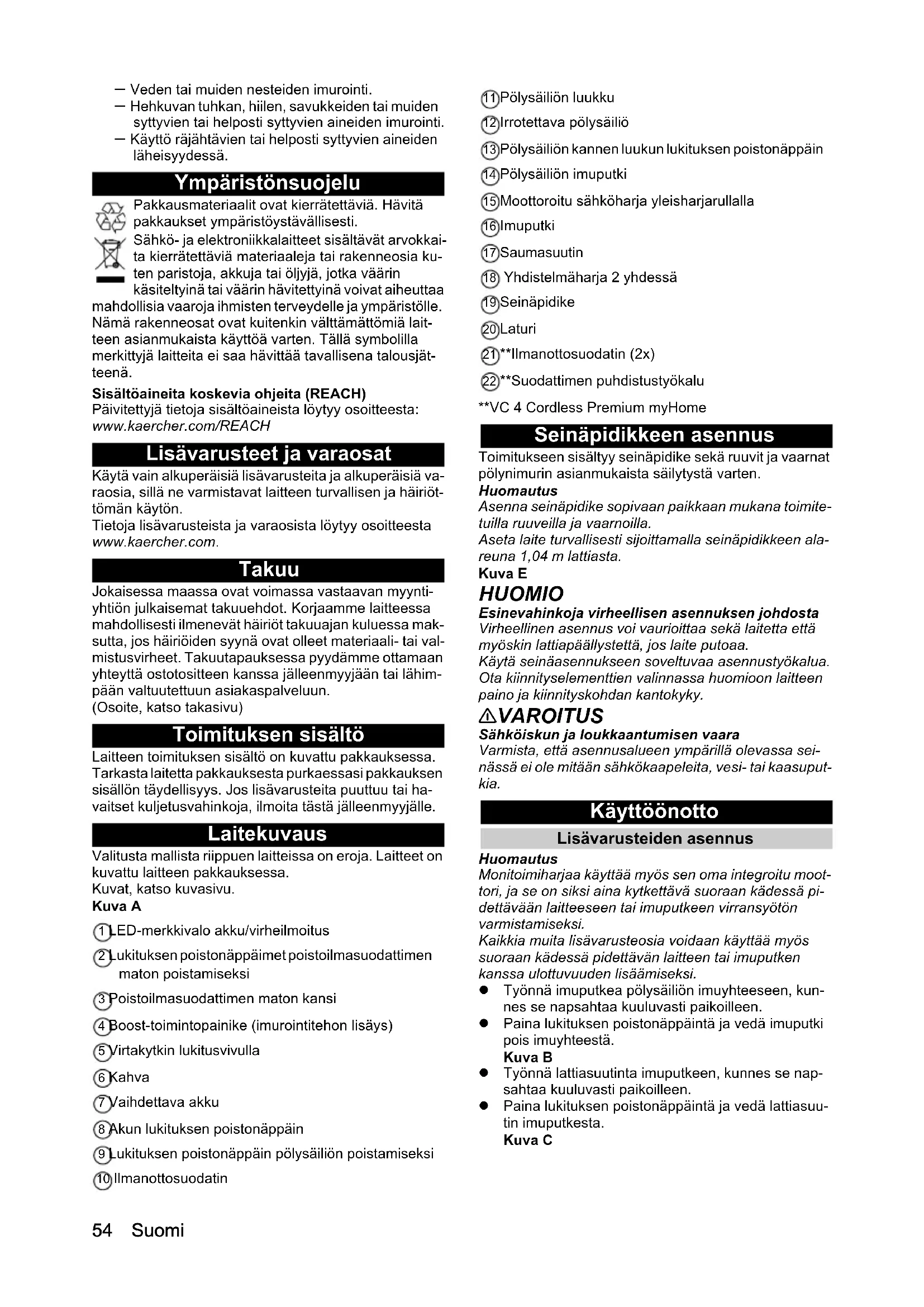 - Tekniset tiedot Suomi – Veden tai muiden nesteiden imurointi. – Hehkuvan tuhkan, hiilen, savukkeiden tai muiden syttyvien tai helposti syttyvien aineiden imurointi. – Käyttö räjähtävien tai helposti syttyvien aineiden läheisyydessä. Ympäristönsuojelu Pakkausmateriaalit ovat kierrätettäviä. Hävitä pakkaukset ympäristöystävällisesti. Sähkö- ja elektroniikkalaitteet sisältävät arvokkai- ta kierrätettäviä materiaaleja tai rakenneosia ku- ten paristoja, akkuja tai öljyjä, jotka väärin käsiteltyinä tai väärin hävitettyinä voivat aiheuttaa mahdollisia vaaroja ihmisten terveydelle ja ympäristölle. Nämä rakenneosat ovat kuitenkin välttämättömiä lait- teen asianmukaista käyttöä varten. Tällä symbolilla merkittyjä laitteita ei saa hävittää tavallisena talousjät- teenä. Sisältöaineita koskevia ohjeita (REACH) Päivitettyjä tietoja sisältöaineista löytyy osoitteesta: www.kaercher.com/REACH Lisävarusteet ja varaosat Käytä vain alkuperäisiä lisävarusteita ja alkuperäisiä va- raosia, sillä ne varmistavat laitteen turvallisen ja häiriöt- tömän käytön. Tietoja lisävarusteista ja varaosista löytyy osoitteesta www.kaercher.com. Takuu Jokaisessa maassa ovat voimassa vastaavan myynti- yhtiön julkaisemat takuuehdot. Korjaamme laitteessa mahdollisesti ilmenevät häiriöt takuuajan kuluessa mak- sutta, jos häiriöiden syynä ovat olleet materiaali- tai val- mistusvirheet. Takuutapauksessa pyydämme ottamaan yhteyttä ostotositteen kanssa jälleenmyyjään tai lähim- pään valtuutettuun asiakaspalveluun. (Osoite, katso takasivu) Toimituksen sisältö Laitteen toimituksen sisältö on kuvattu pakkauksessa. Tarkasta laitetta pakkauksesta purkaessasi pakkauksen sisällön täydellisyys. Jos lisävarusteita puuttuu tai ha- vaitset kuljetusvahinkoja, ilmoita tästä jälleenmyyjälle. Laitekuvaus Valitusta mallista riippuen laitteissa on eroja. Laitteet on kuvattu laitteen pakkauksessa. Kuvat, katso kuvasivu. Kuva A 1 LED-merkkivalo akku/virheilmoitus 2 Lukituksen poistonäppäimet poistoilmasuodattimen maton poistamiseksi 3 Poistoilmasuodattimen maton kansi 4 Boost-toimintopainike (imurointitehon lisäys) 5 Virtakytkin lukitusvivulla 6 Kahva 7 Vaihdettava akku 8 Akun lukituksen poistonäppäin 9 Lukituksen poistonäppäin pölysäiliön poistamiseksi 10 Ilmanottosuodatin 11 Pölysäiliön luukku 12 Irrotettava pölysäiliö 13 Pölysäiliön kannen luukun lukituksen poistonäppäin 14 Pölysäiliön imuputki 15 Moottoroitu sähköharja yleisharjarullalla 16 Imuputki 17 Saumasuutin 18 Yhdistelmäharja 2 yhdessä 19 Seinäpidike 20 Laturi 21 **Ilmanottosuodatin (2x) 22 **Suodattimen puhdistustyökalu **VC 4 Cordless Premium myHome Seinäpidikkeen asennus Toimitukseen sisältyy seinäpidike sekä ruuvit ja vaarnat pölynimurin asianmukaista säilytystä varten. Huomautus Asenna seinäpidike sopivaan paikkaan mukana toimite- tuilla ruuveilla ja vaarnoilla. Aseta laite turvallisesti sijoittamalla seinäpidikkeen ala- reuna 1,04 m lattiasta. Kuva E HUOMIO Esinevahinkoja virheellisen asennuksen johdosta Virheellinen asennus voi vaurioittaa sekä laitetta että myöskin lattiapäällystettä, jos laite putoaa. Käytä seinäasennukseen soveltuvaa asennustyökalua. Ota kiinnityselementtien valinnassa huomioon laitteen paino ja kiinnityskohdan kantokyky. 몇 VAROITUS Sähköiskun ja loukkaantumisen vaara Varmista, että asennusalueen ympärillä olevassa sei- nässä ei ole mitään sähkökaapeleita, vesi- tai kaasuput- kia. Käyttöönotto Lisävarusteiden asennus Huomautus Monitoimiharjaa käyttää myös sen oma integroitu moot- tori, ja se on siksi aina kytkettävä suoraan kädessä pi- dettävään laitteeseen tai imuputkeen virransyötön varmistamiseksi. Kaikkia muita lisävarusteosia voidaan käyttää myös suoraan kädessä pidettävän laitteen tai imuputken kanssa ulottuvuuden lisäämiseksi. Työnnä imuputkea pölysäiliön imuyhteeseen, kun- nes se napsahtaa kuuluvasti paikoilleen. Paina lukituksen poistonäppäintä ja vedä imuputki pois imuyhteestä. Kuva B Työnnä lattiasuutinta imuputkeen, kunnes se nap- sahtaa kuuluvasti paikoilleen. Paina lukituksen poistonäppäintä ja vedä lattiasuu- tin imuputkesta. Kuva CSuomi 55 Työnnä lisäarvikkeet, kuten rakosuulake pölysäiliön tai imuputken imuyhteeseen, kunnes ne napsahta- vat napsahtaa kuuluvasti paikoilleen. Kuva D Akun lataaminen Huomautus Laite toimitetaan ilman ladattua akkua. Lataa akku täy- teen ennen ensimmäistä käyttökertaa. Noudata akkuimurien mukana toimitettuja turvallisuus- ohjeita. p. 5854
