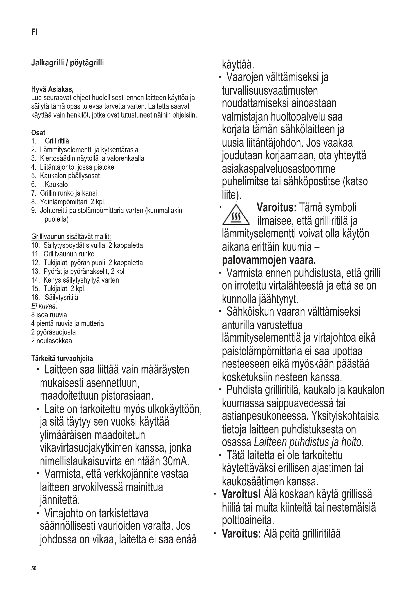 Varoitus: Tämä symboli ilmaisee, että grilliritilä ja lämmityselementti voivat olla käytön aikana erittäin kuumia – palovammojen vaara. ∙ Varmista ennen puhdistusta, että grilli on irrotettu virtalähteestä ja että se on kunnolla jäähtynyt. ∙ Sähköiskun vaaran välttämiseksi anturilla varustettua lämmityselementtiä ja virtajohtoa eikä paistolämpömittaria ei saa upottaa nesteeseen eikä myöskään päästää kosketuksiin nesteen kanssa. ∙ Puhdista grilliritilä, kaukalo ja kaukalon kuumassa saippuavedessä tai astianpesukoneessa. Yksityiskohtaisia tietoja laitteen puhdistuksesta on osassa Laitteen puhdistus ja hoito. ∙ Tätä laitetta ei ole tarkoitettu käytettäväksi erillisen ajastimen tai kaukosäätimen kanssa. ∙ Varoitus! Älä koskaan käytä grillissä hiiliä tai muita kiinteitä tai nestemäisiä polttoaineita. ∙ Varoitus: Älä peitä grilliritilää FI51 142 x 208 mm alumiinikelmulla, barbecueastioilla tai muilla esineillä, sillä siitä aiheutuva kuumuus voi vahingoittaa grilliä. ∙ Kaukaloon voidaan lisätä enintään 2,0 l vettä. ∙ Tämä laite on tarkoitettu kotitalouskäyttöön tai vastaavaan, kuten - ruokalat, toimistot ja muut kaupalliset ympäristöt, - maatalousyritykset, - hotellien, motellien jne. ja vastaavien yritysten asiakkaat, - aamiaisen ja majoituksen tarjoavat majatalot. ∙ Tätä laitetta saavat käyttää lapset (vähintään 8-vuotiaat) sekä henkilöt, joilla on fyysisesti, aistillisesti tai henkisesti rajoittunut toimintakyky tai joilla on puuttuvat tai vajavaiset tiedot laitteen toiminnasta, mikäli heitä valvotaan tai ohjataan laitteen käytössä ja he ymmärtävät täysin kaikki käyttöön liittyvät vaarat ja turvatoimenpiteet. ∙ Lasten ei saa antaa leikkiä laitteella. ∙ Lasten ei saa antaa tehdä laitteen puhdistus- tai huoltotoimenpiteitä, elleivät he ole aikuisen valvonnassa sekä vähintään 8 vuotta vanhoja. ∙ Laite ja sen liitäntäjohto täytyy aina pitää alle 8-vuotiaiden ulottumattomissa. ∙ Varoitus: Pidä lapset poissa pakkausmateriaalien luota potentiaalisen vaaratilanteen esim. tukehtumisvaaran vuoksi. ∙ Ennen käyttöä laite ja mahdolliset lisäosat tulee tarkistaa vaurioiden varalta. Jos laite putoaa kovalle alustalle, sitä ei saa enää käyttää: näkymättömätkin vauriot voivat aiheuttaa vaaratilanteita laitetta käytettäessä. ∙ Käytön aikana grillin on oltava tulenkestävällä, roiskeet ja tahrautumisen kestävällä työtasolla. Rasvaista tai nestepitoista ruokaa valmistettaessa ei aina ole mahdollista välttää roiskumista. ∙ Älä aseta grilliä seinän viereen tai nurkkaan ja varmista, ettei sen lähellä ole tulenarkoja materiaaleja. ∙ Muista, että varsinkin rasvainen ja nestepitoinen ruoka voi syttyä palamaan; täytä sen takia kaukaloon aina vettä ennen käyttöä. Älä kytke grilliä sähköverkkoon ennen kuin olet lisännyt kaukaloon veden. Vesi jäähdyttää kaukaloa, vähentää savunmuodostusta ja lisäksi helpottaa puhdistamista. ∙ Valvo jatkuvasti veden pinnan tasoa. Lisää vettä hyvissä ajoin ja varmista, ettei se joudu kosketuksiin lämmityselementin kanssa. Varoitus: Kytke grillin liitäntäjohto irti verkkovirrasta ennen kuin lisäät vettä. ∙ Tarkista aina ennen grillin käyttöä, että lämmityselementti on asennettu oikein runkoon ja kaukaloon. ∙ Grilliä ei saa jättää toimintaan ilman valvontaa. ∙ Älä anna liitäntäjohdon koskea laitteen kuumia osia. ∙ Reititä virtajohto niin, ettei kukaan voi kompastua siihen. ∙ Irrota pistoke pistorasiasta aina - ennen veden lisäämistä kaukaloon, - käytön jälkeen, - jos laitteessa ilmenee vikaa, - ennen laitteen puhdistusta. ∙ Jatkojohdon tai johtokelan käyttö aiheuttaa tehon heikkenemistä ja mahdollisesti myöhemmin lämmönmuodostusta johtoon. Siitä syystä johto on vedettävä kokonaan esiin ennen käyttöä. Varmista, että johto on tarkoitettu ulkokäyttöön ja eritellylle teholle (katso arvokilpi). ∙ Grillivaunua ei saa siirtää sivupöydästä työntämällä. Poista ensin sivupöytä ja ota aina kiinni rungosta. ∙ Älä käytä grillivaunua tavaroiden kuljetukseen. ∙ Älä koskaan liikuta grilliä käytön aikana. ∙ Poista vesi käytön jälkeen. ∙ Huomio! Anna grillin aina jäähtyä täydellisesti ennen kuin siirrät, puhdistat, peität tai laitat sen säilytykseen. ∙ Huomio! Jos grilliä ei käytetä, lämmityselementti on kytkentärasioineen irrotettava grillistä ja sitä on säilytettävä sisällä kosteudelta suojattuna. ∙ Muita grillin osia ei saa säilyttää ulkona tai sellaisissa suojaamattomissa paikoissa, missä ne altistuvat säätilan vaikutuksille. ∙ Grilliä saa käyttää vain mukana tulevan ydinlämpömittarin tai SEVERIN-mittarin tuotenumero ZB 8126 kanssa. ∙ Valmistaja ei ole vastuussa mahdollisista vaurioista, jos ne johtuvat laitteen väärinkäytöstä tai käyttöohjeiden laiminlyömisestä. ∙ Tämä tuote on kaikkien voimassa olevien CE-merkintöjä koskevien direktiivien mukainen.52 142 x 208 mm Ennen ensimmäistä käyttöä ∙ Poista laitteesta pakkausmateriaali ja tarrat. ∙ Puhdista grilliritilä, kaukalo ja kaukalon päällysosat kuumassa saippuavedessä; pyyhi ne sitten kauttaaltaan kuiviksi. ∙ Kokoa laite luvussa Laitteen valmistelu olevan kuvauksen mukaisesti. ∙ Anna grillin lämmetä noin 10 minuutin ajan maksimiteholla ilman ruokia (katso Grillauksen tehostusalue). Näin laitteesta poistuu haju, jota ilmenee tavallisesti ensimmäisen käytön yhteydessä. Laitteesta voi tulla jonkin verran savua; sen takia täytyy varmistaa riittävä tuuletus avaamalla ikkuna tai parvekkeen ovi; myös liesituuletinta voidaan käyttää. Grillin kokoaminen ∙ Kokoa grilli kaaviokuvien mukaisesti: ∙ Aseta kaukalo grillin runkoon. ∙ Asenna kaukalon päällysosat niin, että kukin päällysosa peittää neljä ulkonemaa. ∙ Asenna lämmityselementti ja kytkentärasia kaukaloon. Laite sisältä