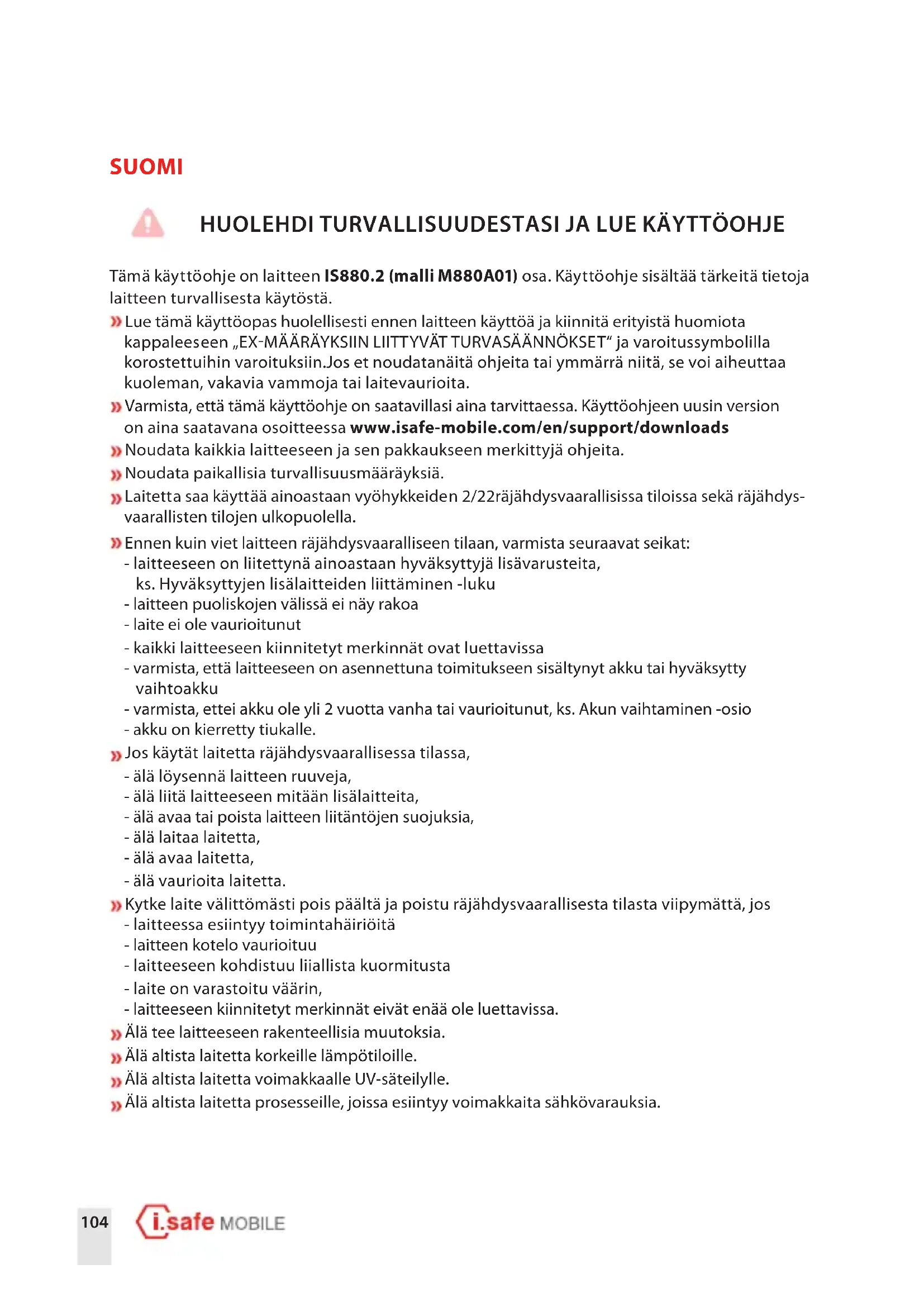 MARCAS COMERCIALES i.safeMOBILEGmbH y el logo de i.safeMOBILEGmbH son marcas de i.safeMOBILEGmbH. Incluye la aplicación de Google™ y la aplicación Google Chrome™. Google y Google Chrome son marcas de Google LLC. Android es una marca de Google LLC. Todas las demás marcas comerciales y derechos de autor son propiedad de sus respectivos dueños.104 SUOMI HUOLEHDI TURVALLISUUDESTASI JA LUE KÄYTTÖOHJE Tämä käyttöohje on laitteen IS880.2 (malli M880A01) osa. Käyttöohje sisältää tärkeitä tietoja laitteen turvallisesta käytöstä. Lue tämä käyttöopas huolellisesti ennen laitteen käyttöä ja kiinnitä erityistä huomiota kappaleeseen „EXMÄÄRÄYKSIIN LIITTYVÄT TURVASÄÄNNÖKSET“ ja varoitussymbolilla korostettuihin varoituksiin.Jos et noudatanäitä ohjeita tai ymmärrä niitä, se voi aiheuttaa kuoleman, vakavia vammoja tai laitevaurioita. Varmista, että tämä käyttöohje on saatavillasi aina tarvittaessa. Käyttöohjeen uusin version on aina saatavana osoitteessa www.isafe-mobile.com/en/support/downloads Noudata kaikkia laitteeseen ja sen pakkaukseen merkittyjä ohjeita. Noudata paikallisia turvallisuusmääräyksiä. Laitetta saa käyttää ainoastaan vyöhykkeiden 2/22räjähdysvaarallisissa tiloissa sekä räjähdys- vaarallisten tilojen ulkopuolella. Ennen kuin viet laitteen räjähdysvaaralliseen tilaan, varmista seuraavat seikat: - laitteeseen on liitettynä ainoastaan hyväksyttyjä lisävarusteita, ks. Hyväksyttyjen lisälaitteiden liittäminen -luku - laitteen puoliskojen välissä ei näy rakoa - laite ei ole vaurioitunut - kaikki laitteeseen kiinnitetyt merkinnät ovat luettavissa - varmista, että laitteeseen on asennettuna toimitukseen sisältynyt akku tai hyväksytty vaihtoakku - varmista, ettei akku ole yli 2vuotta vanha tai vaurioitunut, ks. Akun vaihtaminen -osio - akku on kierretty tiukalle. Jos käytät laitetta räjähdysvaarallisessa tilassa, - älä löysennä laitteen ruuveja, - älä liitä laitteeseen mitään lisälaitteita, - älä avaa tai poista laitteen liitäntöjen suojuksia, - älä laitaa laitetta, - älä avaa laitetta, - älä vaurioita laitetta. Kytke laite välittömästi pois päältä ja poistu räjähdysvaarallisesta tilasta viipymättä, jos - laitteessa esiintyy toimintahäiriöitä - laitteen kotelo vaurioituu - laitteeseen kohdistuu liiallista kuormitusta - laite on varastoitu väärin, - laitteeseen kiinnitetyt merkinnät eivät enää ole luettavissa. Älä tee laitteeseen rakenteellisia muutoksia. Älä altista laitetta korkeille lämpötiloille. Älä altista laitetta voimakkaalle UV-säteilylle. Älä altista laitetta prosesseille, joissa esiintyy voimakkaita sähkövarauksia.FI