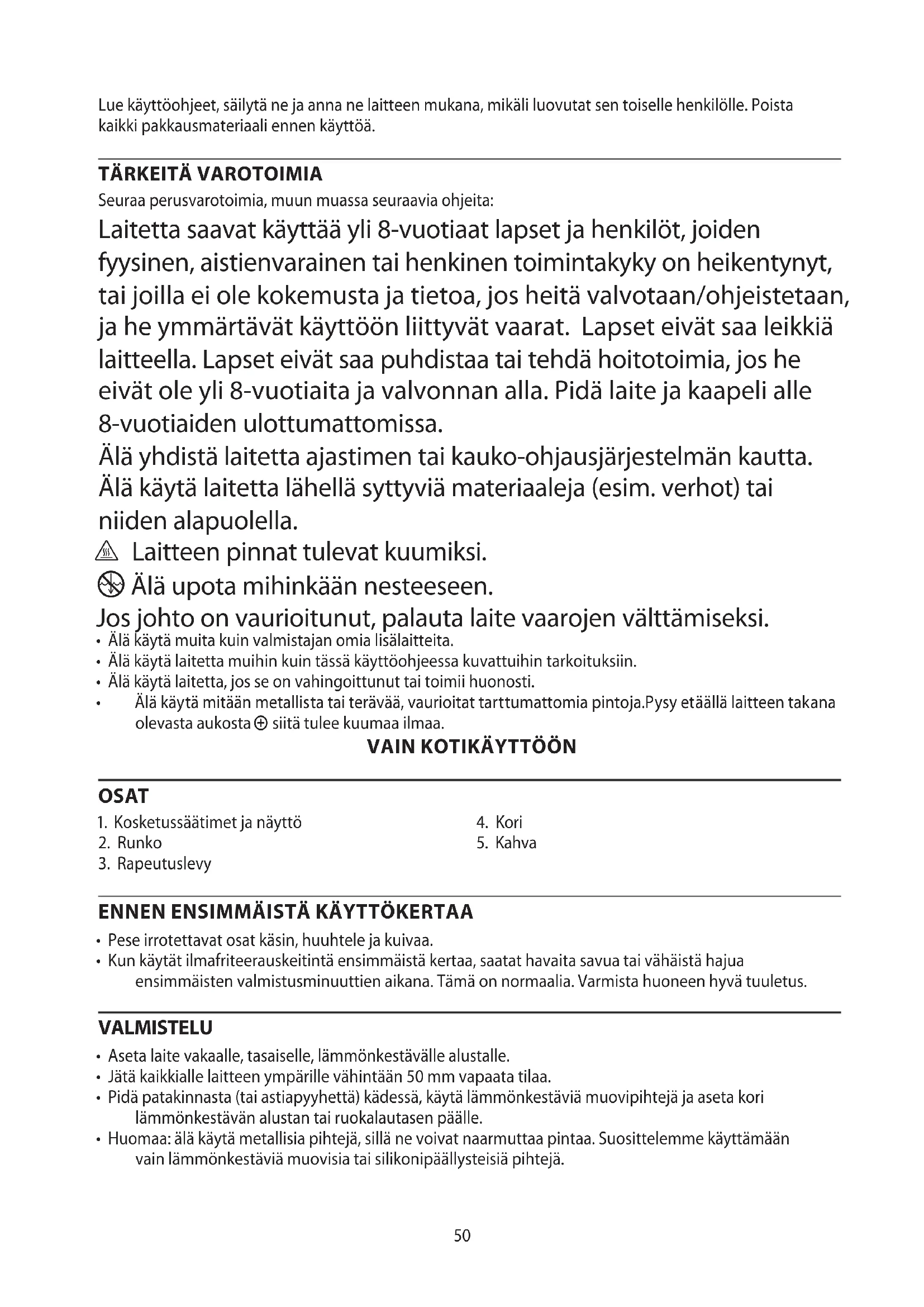 Seuraa perusvarotoimia, muun muassa seuraavia ohjeita: Laitetta saavat käyttää yli 8-vuotiaat lapset ja henkilöt, joiden fyysinen, aistienvarainen tai henkinen toimintakyky on heikentynyt, tai joilla ei ole kokemusta ja tietoa, jos heitä valvotaan/ohjeistetaan, ja he ymmärtävät käyttöön liittyvät vaarat. Lapset eivät saa leikkiä laitteella. Lapset eivät saa puhdistaa tai tehdä hoitotoimia, jos he eivät ole yli 8-vuotiaita ja valvonnan alla. Pidä laite ja kaapeli alle 8-vuotiaiden ulottumattomissa. Älä yhdistä laitetta ajastimen tai kauko-ohjausjärjestelmän kautta. Älä käytä laitetta lähellä syttyviä materiaaleja (esim. verhot) tai niiden alapuolella. ¬ Laitteen pinnat tulevat kuumiksi. i Älä upota mihinkään nesteeseen. Jos johto on vaurioitunut, palauta laite vaarojen välttämiseksi.