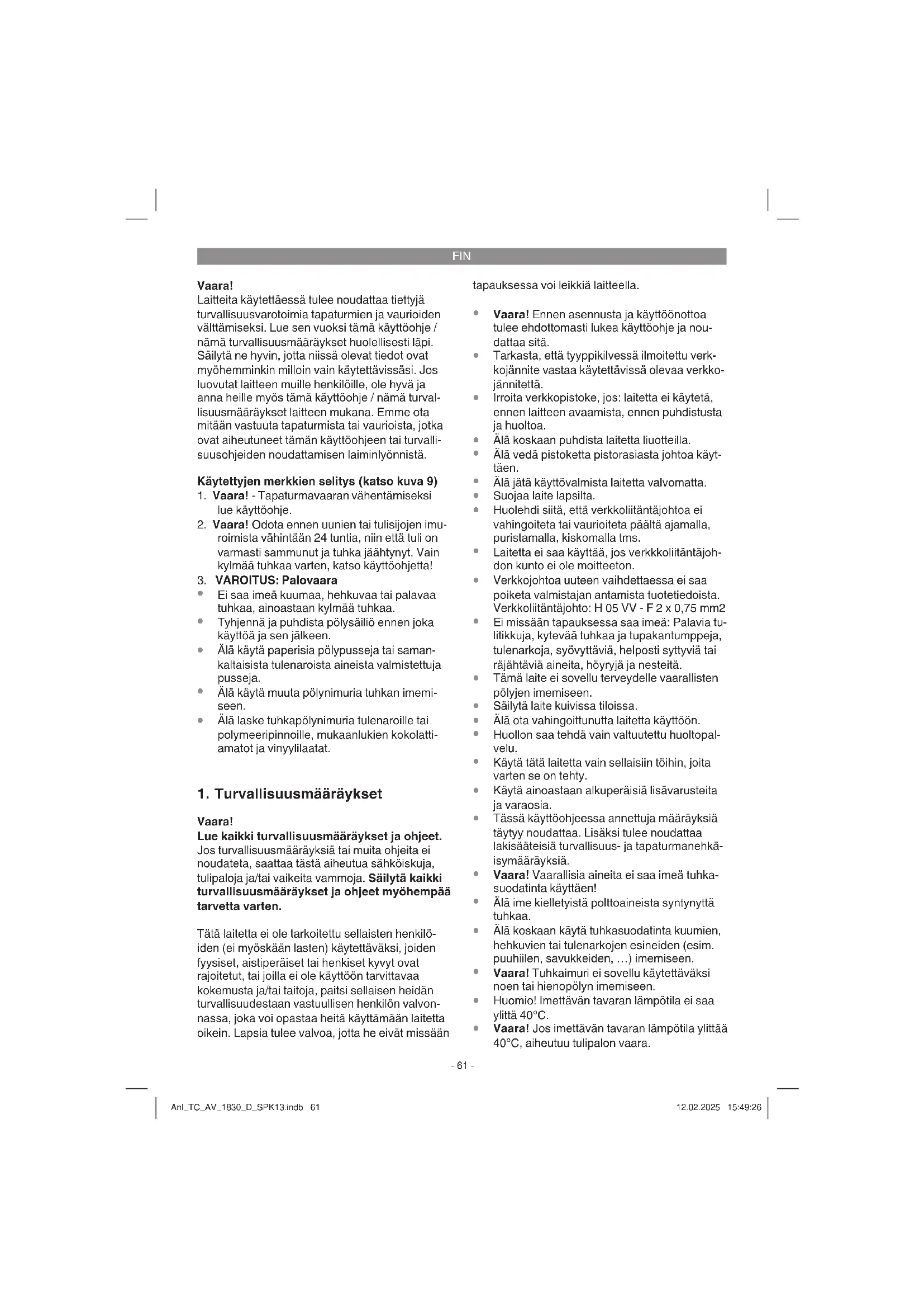 Laite on tarkoitettu käytettäväksi kylmän tuhkan imemiseen kamiinoista, hormeista, uuneista, tuhkakupeista ja muista paikoista, joihin kertyy tuhkaa. Konetta saa käyttää ainoastaan sille määrättyyn tarkoitukseen. Kaikkinainen tämän ylittävä käyttö ei ole määräysten mukaista. Kaikista tästä aiheu- tuvista vahingoista tai loukkaantumisista on vas- tuussa laitteen omistaja/käyttäjä eikä suinkaan sen valmistaja. Ole hyvä ja ota huomioon, että laitteitamme ei ole suunniteltu ja valmistettu käytettäväksi pienteol- lisuus- tai teollisuustarkoituksiin. Emme siksi ota mitään vastuuta vaurioista, jos laitetta käytetään pienteollisuus-, käsityöläis- tai teollisuustyöpaiko- illa tai näihin verrattavissa olevissa toimissa. Anl_TC_AV_1830_D_SPK13.indb 62Anl_TC_AV_1830_D_SPK13.indb 62 12.02.2025 15:49:2612.02.2025 15:49:26FIN
