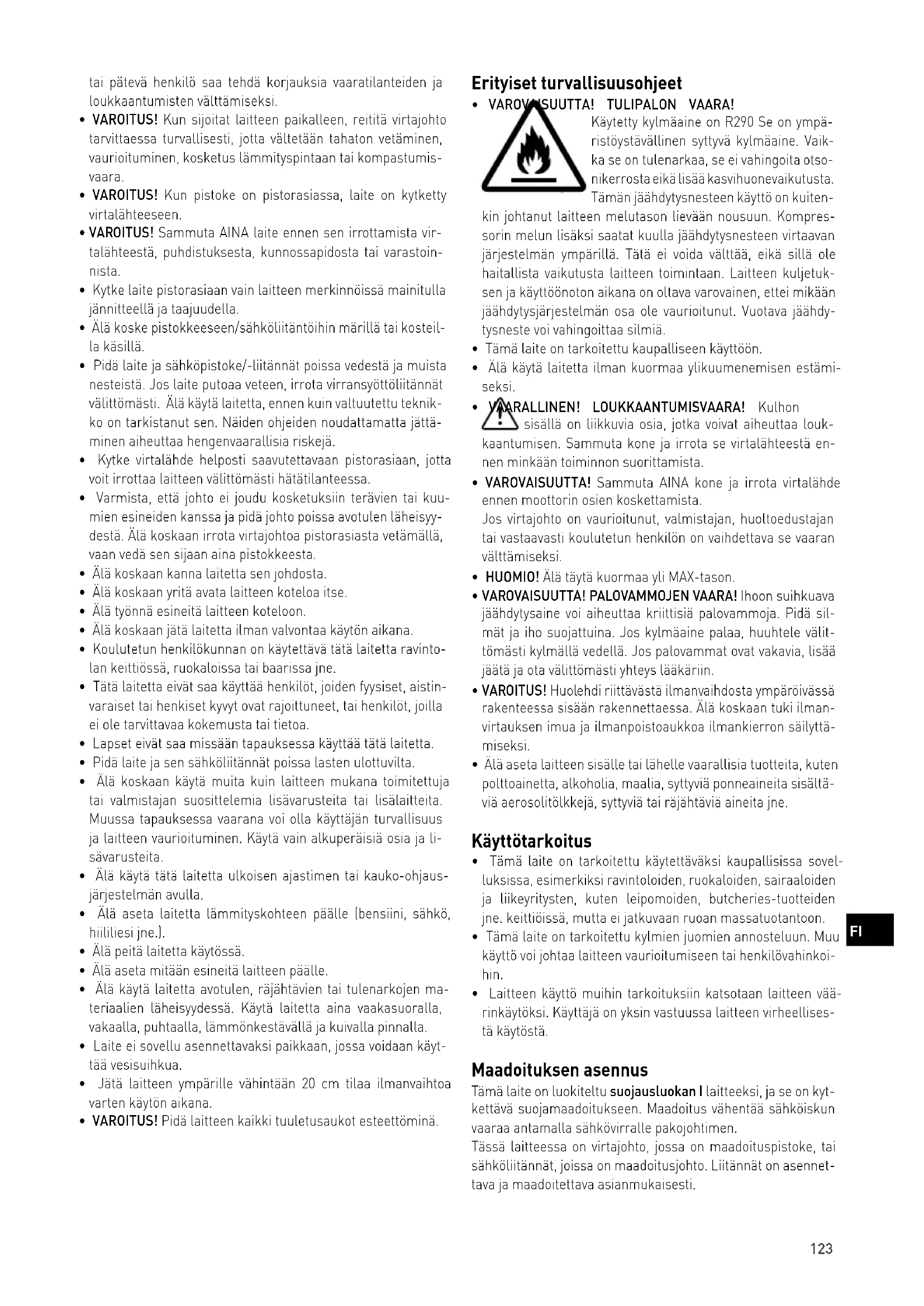 - VAROVAISUUTTA! TULIPALON VAARA! Käytetty kylmäaine on R290 Se on ympä- ristöystävällinen syttyvä kylmäaine. Vaik- ka se on tulenarkaa, se ei vahingoita otso- nikerrosta eikä lisää kasvihuonevaikutusta. Tämän jäähdytysnesteen käyttö on kuiten- kin johtanut laitteen melutason lievään nousuun. Kompres- sorin melun lisäksi saatat kuulla jäähdytysnesteen virtaavan järjestelmän ympärillä. Tätä ei voida välttää, eikä sillä ole haitallista vaikutusta laitteen toimintaan. Laitteen kuljetuk- sen ja käyttöönoton aikana on oltava varovainen, ettei mikään jäähdytysjärjestelmän osa ole vaurioitunut. Vuotava jäähdy- tysneste voi vahingoittaa silmiä.