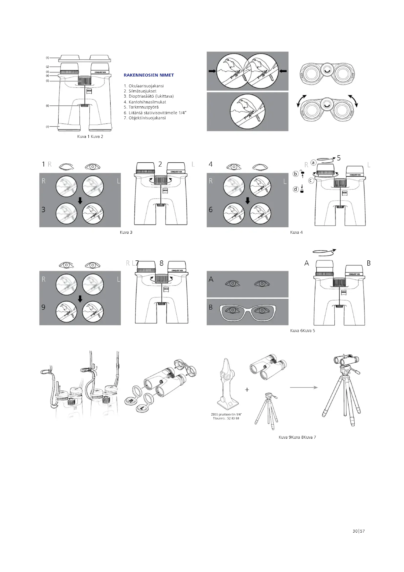 Tuote Tilausnumero Toimituksen sisältö 8 x 32 52 32 14 Kiikarit Okulaarisuojakansi Objektiivisuojakansi Kantohihna Kantolaukku ja kantohihna Optiikan puhdistuspyyhe Pikaopas Turvallisuusohjeet Jalustasovitin ¼" (vain 15 x 56) 10 x 32 52 32 15 8 x 42 52 42 14 10 x 42 52 42 15 8 x 56 52 56 34 10 x 56 52 56 35 15 x 56 52 56 36 Silmävälin sovittaminen (pupillietäisyys) Taita molempia kiikaripuoliskoja keskiakselin ympärillä vastakkain, kunnes molempien okulaarien etäisyys vastaa silmiesi etäisyyttä. Näin saat aikaan silmillesi ihanteellisen kuvan. Silmien ihanteellinen etäisyys on saavutettu silloin, kun molemmilla silmillä katseltaessa näkyy pyöreä kuva (kuva 2). Kuvan terävyyden säätäminen Kiikareissa on tarkennuspyörä ja pyörä dioptriasäätöön. Sulje säätöä varten oikea silmä ja säädä tarkennuspyörällä vasemman kiikaripuoliskon kuva tarkaksi (kuva 3). Sulje sen jälkeen vasen silmä ja säädä – mikäli tarpeen – oikean kiikaripuoliskon kuvantarkkuus dioptriasäädöllä (kuva 4). Lisätietoja löydät seuraavasta kappaleesta. Dioptriasäätö on varustettu asteikolla, jossa on merkit ”+” ja ”–” ja indeksipiste lähtökohtana. Merkitse oma henkilökohtainen asetuksesi. Siten voit säätää oman dioptriasäätösi nopeasti kaikista kiikareista. Eri etäisyyksillä tapahtuvaa tarkennusta varten on käytettävä vain tarkennuspyörää (kuva 5). Ohje: Käytä aina samaa objektia, jotta molemmat kuvat ovat tarkennettuja. Diopterin lukko Kiikareissa on lukitusmekanismi, joka estää diopterikompensaation ei-toivotun säädön (kuva 4). Säädä diopteria ruuvaamalla ensin silmäsuojukset (a) irti. Voit sitten vetää diopterin säätörengasta ylöspäin avataksesi sen (b). Vaihda diopterit edellä kuvatulla tavalla kääntämällä diopterin säätörengasta (c). Kun kuvan tarkennus on säädetty oikein, paina diopterin säätörengasta takaisin alas sen lukitsemiseksi (d). Silmäsuojusten asentaminen, käyttö silmälasien kanssa ja ilman silmälaseja Kun tarkkailet ilman silmälaseja, käytä laitetta silmäsuojukset ulosvedettyinä. Käännä silmäsuojuksia vastapäivään ylöspäin haluamallasi tavalla ylimpään kiinnitykseen asti (kuva 6 – kuva A). Silmäsuojukset on kiinnitettävissä neljään asentoon: ylempään ja alempaan sekä kahteen väliasentoon. Kyseisellä asetusmahdollisuudella voidaan säädellä silmän etäisyyttä lähtöpupilliin ja säätö voidaan siten tehdä yksilöllisesti jokaiselle käyttäjälle. Käytettäessä silmälaseja katselun aikana silmäsuojukset käännetään alaspäin (myötäpäivään), kunnes ne ovat alimmassa asennossa (kuva 6 – kuva B). Ohje: Jos jatkat silmäsuojusten kääntämistä vastapäivään, kun ne ovat uloskierretyssä tilassa, ne voivat irrota. Tämä on tarkoituksellista, katso ”Silmäsuojusten puhdistus ja vaihto”. Silmäsuojusten puhdistus ja vaihto Silmäsuojukset voi kiertää vaihtoa tai puhdistusta varten kokonaan irti kiikareista. Kuten kuvassa 6 on esitetty, kierrä silmäsuojukset ulos ylimpään lukitustasoon asti ja jatka kääntämistä samaan suuntaan kierteen yli, kunnes silmäsuojukset on kokonaan irrotettu. Kun olet puhdistanut tai vaihtanut silmäsuojukset, käännä ne myötäpäivään kokonaan sisään okulaariin (katso myös kohta ”Silmäsuojusten asentaminen, käyttö silmälasien kanssa ja ilman silmälaseja”). Vetämällä hieman myötäpäivään silmäsuojusten kierre kiinnittyy alimpaan asentoon. Lopuksi voit säätää lukitustasoilla tuttuun tapaan haluamasi etäisyyden silmän ja okulaarin välissä. Kantohihnan ja suojakannen kiinnittäminen Kantohihna, okulaarisuojakansi ja objektiivisuojakannet ovat pakkauksessa. Okulaarisuojakansi kiinnitetään kiikareihin kuvassa 7 kuvatulla tavalla kantohihnalla kantohihnasilmukoiden läpi. Hihnan pituus voidaan säätää haluttuun pituuteen hihnaa kiristämällä tai löysäämällä. Menettele okulaarisuojakannen toisella puolella tarvittaessa samassa järjestyksessä. Okulaarisuojakannen voi kiinnittää oman harkinnan mukaan myös vain toiselle puolelle. Objektiivisuojakannet on merkitty merkinnöin ”L” vasenta ja ”R” oikeaa varten, ja ne kiinnitetään vastaavasti vasempaan ja oikeaan putkeen (kuva 8). Okulaari- ja objektiivisuojakansien käyttö Okulaarisuojakansi työnnetään silmäsuojusten päälle (kuva 8). Voit ylläpitää haluamaasi pupillien etäisyyttä. Irrota kansi ennen kiikareiden käyttöä. Objektiivisuojakannet voivat pysyä kiikarissa pysyvästi sen jälkeen, kun ne on kiinnitetty, ja ne on avattava vain ennen käyttöä. Statiivisovittimien kiinnittäminen