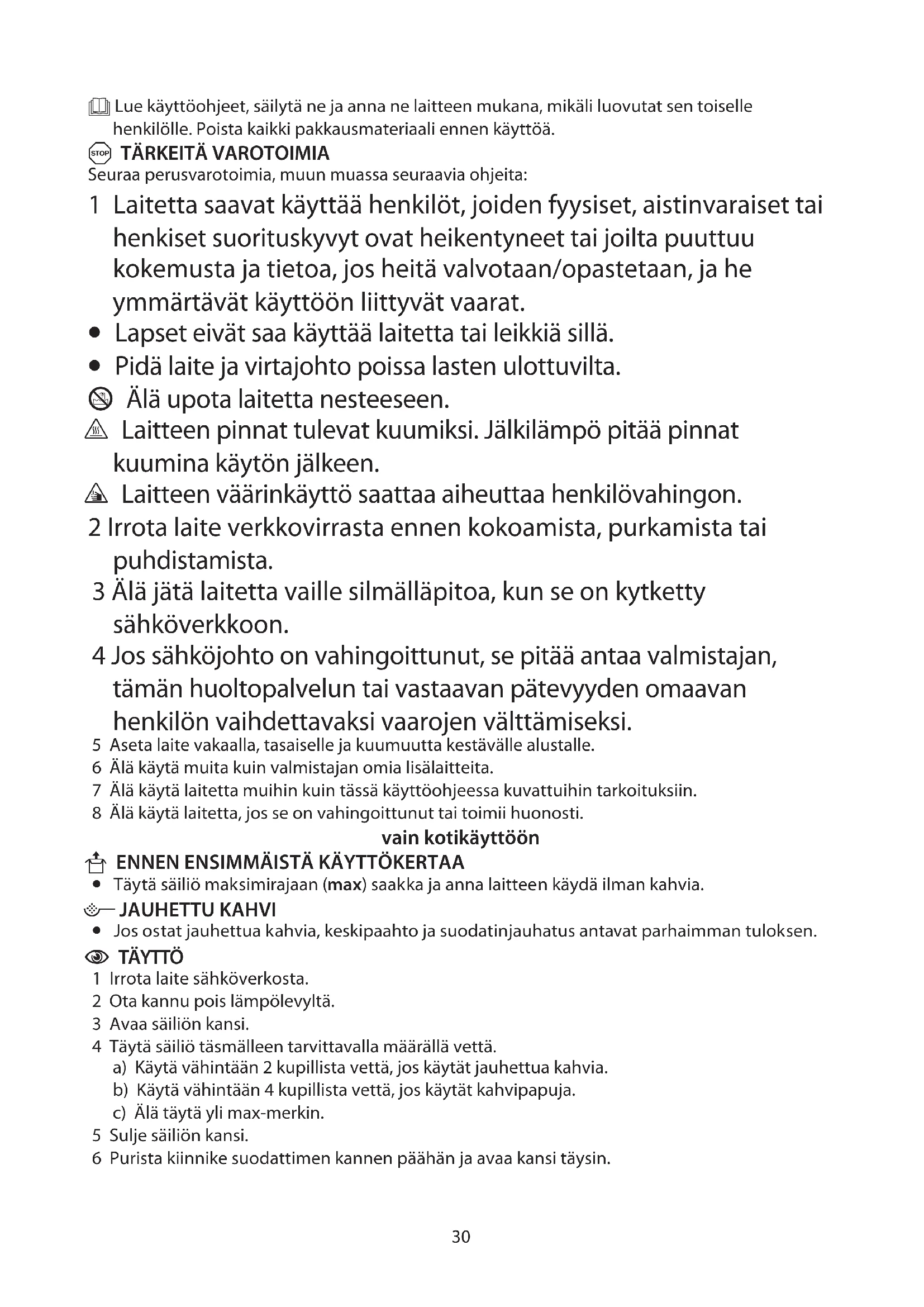 - Pidä laite ja virtajohto poissa lasten ulottuvilta. l Älä upota laitetta nesteeseen. h Laitteen pinnat tulevat kuumiksi. Jälkilämpö pitää pinnat kuumina käytön jälkeen. s Laitteen väärinkäyttö saattaa aiheuttaa henkilövahingon. 2 Irrota laite verkkovirrasta ennen kokoamista, purkamista tai puhdistamista. 3 Älä jätä laitetta vaille silmälläpitoa, kun se on kytketty sähköverkkoon. 4 Jos sähköjohto on vahingoittunut, se pitää antaa valmistajan, tämän huoltopalvelun tai vastaavan pätevyyden omaavan henkilön vaihdettavaksi vaarojen välttämiseksi. 5 Aseta laite vakaalla, tasaiselle ja kuumuutta kestävälle alustalle. 6 Älä käytä muita kuin valmistajan omia lisälaitteita. 7 Älä käytä laitetta muihin kuin tässä käyttöohjeessa kuvattuihin tarkoituksiin. 8 Älä käytä laitetta, jos se on vahingoittunut tai toimii huonosti. vain kotikäyttöön U ENNEN ENSIMMÄISTÄ KÄYTTÖKERTAA