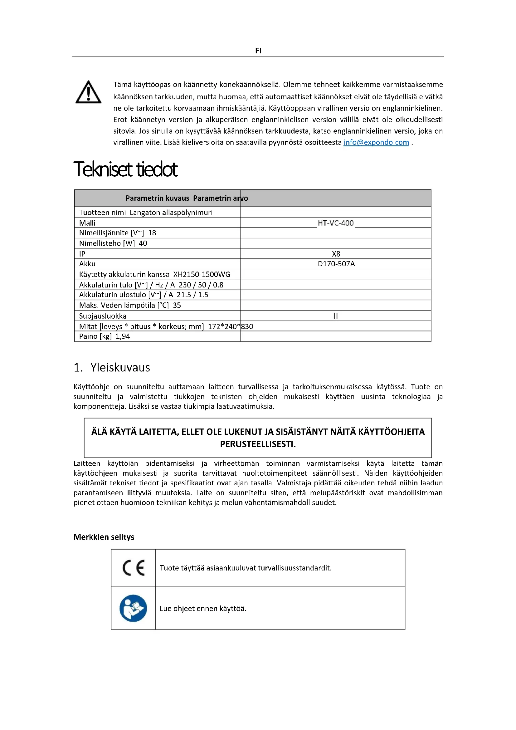 Käyttöohje on suunniteltu auttamaan laitteen turvallisessa ja tarkoituksenmukaisessa käytössä. Tuote on suunniteltu ja valmistettu tiukkojen teknisten ohjeiden mukaisesti käyttäen uusinta teknologiaa ja komponentteja. Lisäksi se vastaa tiukimpia laatuvaatimuksia. ÄLÄ KÄYTÄ LAITETTA, ELLET OLE LUKENUT JA SISÄISTÄNYT NÄITÄ KÄYTTÖOHJEITA PERUSTEELLISESTI. Laitteen käyttöiän pidentämiseksi ja virheettömän toiminnan varmistamiseksi käytä laitetta tämän käyttöohjeen mukaisesti ja suorita tarvittavat huoltotoimenpiteet säännöllisesti. Näiden käyttöohjeiden sisältämät tekniset tiedot ja spesifikaatiot ovat ajan tasalla. Valmistaja pidättää oikeuden tehdä niihin laadun parantamiseen liittyviä muutoksia. Laite on suunniteltu siten, että melupäästöriskit ovat mahdollisimman pienet ottaen huomioon tekniikan kehitys ja melun vähentämismahdollisuudet. Merkkien selitys Tuote täyttää asiaankuuluvat turvallisuusstandardit. Lue ohjeet ennen käyttöä.FI Tuote on kierrätettävä. VAROITUS!, HUOMAUTUS! tai MUISTUTUS! Kyseiseen tilanteeseen sopiva. (yleinen varoitusmerkki) HUOMIO! Sähköiskuvaara! HUOMIO! Lue kaikki turvallisuutta koskevat varoitukset ja kaikki ohjeet. Varoitusten ja ohjeiden noudattamatta jättäminen voi johtaa sähköiskuun, tulipaloon ja/tai vakaviin vammoihin tai kuolemaan. Varoituksissa ja ohjeissa käytetään termejä "laite" ja "tuote", joilla viitataan: Langaton allaspölynimuri 1.1. Sähköturvallisuus a) Pistotulpan on sovittava pistorasiaan. Älä muokkaa pistotulppaa millään tavalla. Alkuperäisten pistotulppien ja yhteensopivien pistorasioiden käyttö vähentää sähköiskun vaaraa. b) Vältä koskettamasta maadoitettuja elementtejä, kuten putkia, lämmittimiä, kattiloita ja jääkaappeja. Sähköiskun vaara on lisääntynyt, jos maadoitettu laite altistuu sateelle, joutuu suoraan kosketukseen märän pinnan kanssa tai toimii kosteassa ympäristössä. Veden joutuminen laitteeseen lisää laitteen vaurioitumisen ja sähköiskun vaaraa. c) Älä koske laitteeseen märillä tai kosteilla käsillä, kun se on kytketty laturiin. d) Käytä johtoa vain sille tarkoitettuun käyttöön. Älä koskaan käytä sitä laitteen kantamiseen tai pistotulpan irrottamiseen pistorasiasta. Pidä kaapeli poissa lämmönlähteistä, öljystä, terävistä reunoista tai liikkuvista osista. Vahingoittuneet tai sotkeutuneet virtajohdot lisäävät sähköiskun vaaraa. e) Lopeta käyttö, jos virtajohto tai sovitin on vaurioitunut tai siinä näkyy kulumisen merkkejä. Vioittunut virtalähde on vaihdettava. Ammattitaitoisen sähköasentajan tai valmistajan huoltoliikkeen tulee vaihtaa vaurioitunut virtajohto. f) Älä käytä tuotetta, kun vedessä on ihmisiä. g) Varmista latauksen aikana, että laite on kytketty pistorasiaan paikassa, jossa ei ole tulvavaaraa ja joka on suojattu kosteudelta. h) Sammuta tuote ennen lataamista.