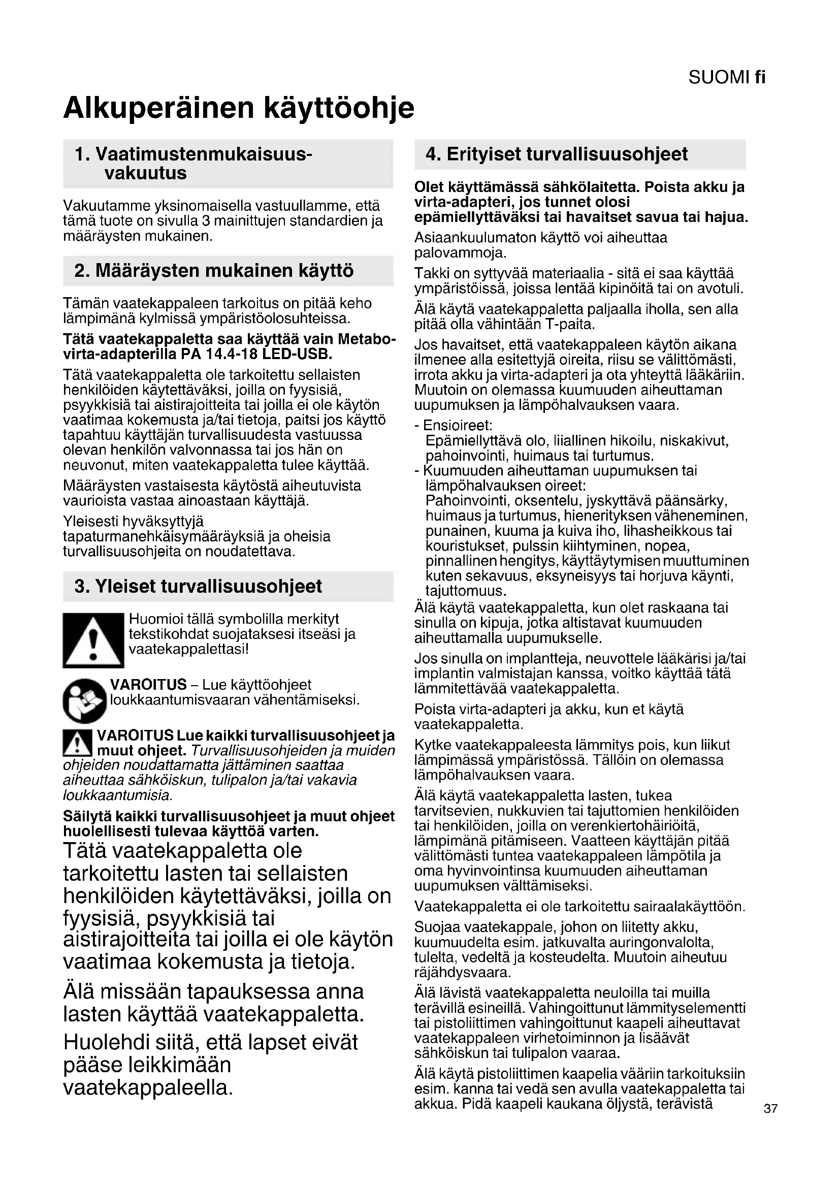 Alkuperäinen käyttöohje Vakuutamme yksinomaisella vastuullamme, että tämä tuote on sivulla 3 mainittujen standardien ja määräysten mukainen. Tämän vaatekappaleen tarkoitus on pitää keho lämpimänä kylmissä ympäristöolosuhteissa. Tätä vaatekappaletta saa käyttää vain Metabo- virta-adapterilla PA 14.4-18 LED-USB. Tätä vaatekappaletta ole tarkoitettu sellaisten henkilöiden käytettäväksi, joilla on fyysisiä, psyykkisiä tai aistirajoitteita tai joilla ei ole käytön vaatimaa kokemusta ja/tai tietoja, paitsi jos käyttö tapahtuu käyttäjän turvallisuudesta vastuussa olevan henkilön valvonnassa tai jos hän on neuvonut, miten vaatekappaletta tulee käyttää. Määräysten vastaisesta käytöstä aiheutuvista vaurioista vastaa ainoastaan käyttäjä. Yleisesti hyväksyttyjä tapaturmanehkäisymääräyksiä ja oheisia turvallisuusohjeita on noudatettava. Huomioi tällä symbolilla merkityt tekstikohdat suojataksesi itseäsi ja vaatekappalettasi! VAROITUS – Lue käyttöohjeet loukkaantumisvaaran vähentämiseksi. VAROITUS Lue kaikki turvallisuusohjeet ja muut ohjeet. Turvallisuusohjeiden ja muiden ohjeiden noudattamatta jättäminen saattaa aiheuttaa sähköiskun, tulipalon ja/tai vakavia loukkaantumisia. Säilytä kaikki turvallisuusohjeet ja muut ohjeet huolellisesti tulevaa käyttöä varten. Tätä vaatekappaletta ole tarkoitettu lasten tai sellaisten henkilöiden käytettäväksi, joilla on fyysisiä, psyykkisiä tai aistirajoitteita tai joilla ei ole käytön vaatimaa kokemusta ja tietoja. Älä missään tapauksessa anna lasten käyttää vaatekappaletta. Huolehdi siitä, että lapset eivät pääse leikkimään vaatekappaleella. Olet käyttämässä sähkölaitetta. Poista akku ja virta-adapteri, jos tunnet olosi epämiellyttäväksi tai havaitset savua tai hajua. Asiaankuulumaton käyttö voi aiheuttaa palovammoja. Takki on syttyvää materiaalia - sitä ei saa käyttää ympäristöissä, joissa lentää kipinöitä tai on avotuli. Älä käytä vaatekappaletta paljaalla iholla, sen alla pitää olla vähintään T-paita. Jos havaitset, että vaatekappaleen käytön aikana ilmenee alla esitettyjä oireita, riisu se välittömästi, irrota akku ja virta-adapteri ja ota yhteyttä lääkäriin. Muutoin on olemassa kuumuuden aiheuttaman uupumuksen ja lämpöhalvauksen vaara. - Ensioireet: Epämiellyttävä olo, liiallinen hikoilu, niskakivut, pahoinvointi, huimaus tai turtumus. - Kuumuuden aiheuttaman uupumuksen tai lämpöhalvauksen oireet: Pahoinvointi, oksentelu, jyskyttävä päänsärky, huimaus ja turtumus, hienerityksen väheneminen, punainen, kuuma ja kuiva iho, lihasheikkous tai kouristukset, pulssin kiihtyminen, nopea, pinnallinen hengitys, käyttäytymisen muuttuminen kuten sekavuus, eksyneisyys tai horjuva käynti, tajuttomuus. Älä käytä vaatekappaletta, kun olet raskaana tai sinulla on kipuja, jotka altistavat kuumuuden aiheuttamalla uupumukselle. Jos sinulla on implantteja, neuvottele lääkärisi ja/tai implantin valmistajan kanssa, voitko käyttää tätä lämmitettävää vaatekappaletta. Poista virta-adapteri ja akku, kun et käytä vaatekappaletta. Kytke vaatekappaleesta lämmitys pois, kun liikut lämpimässä ympäristössä. Tällöin on olemassa lämpöhalvauksen vaara. Älä käytä vaatekappaletta lasten, tukea tarvitsevien, nukkuvien tai tajuttomien henkilöiden tai henkilöiden, joilla on verenkiertohäiriöitä, lämpimänä pitämiseen. Vaatteen käyttäjän pitää välittömästi tuntea vaatekappaleen lämpötila ja oma hyvinvointinsa kuumuuden aiheuttaman uupumuksen välttämiseksi. Vaatekappaletta ei ole tarkoitettu sairaalakäyttöön. Suojaa vaatekappale, johon on liitetty akku, kuumuudelta esim. jatkuvalta auringonvalolta, tulelta, vedeltä ja kosteudelta. Muutoin aiheutuu räjähdysvaara. Älä lävistä vaatekappaletta neuloilla tai muilla terävillä esineillä. Vahingoittunut lämmityselementti tai pistoliittimen vahingoittunut kaapeli aiheuttavat vaatekappaleen virhetoiminnon ja lisäävät sähköiskun tai tulipalon vaaraa. Älä käytä pistoliittimen kaapelia vääriin tarkoituksiin esim. kanna tai vedä sen avulla vaatekappaletta tai akkua. Pidä kaapeli kaukana öljystä, terävistä