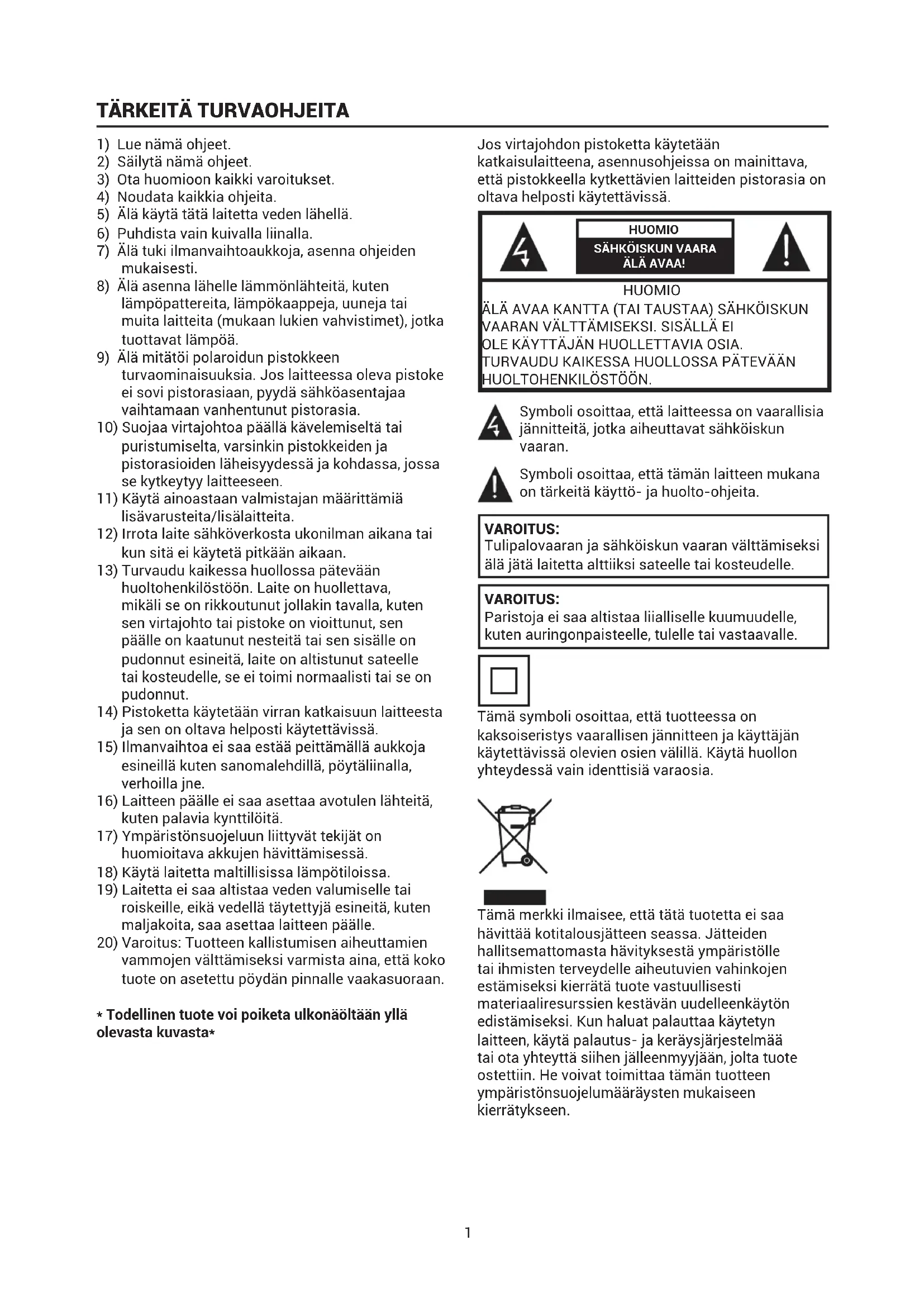 HUOLTOHENKILÖSTÖÖN. Symboli osoittaa, että laitteessa on vaarallisia jännitteitä, jotka aiheuttavat sähköiskun vaaran. Symboli osoittaa, että tämän laitteen mukana on tärkeitä käyttö- ja huolto-ohjeita. VAROITUS: Tulipalovaaran ja sähköiskun vaaran välttämiseksi älä jätä laitetta alttiiksi sateelle tai kosteudelle. VAROITUS: Paristoja ei saa altistaa liialliselle kuumuudelle, kuten auringonpaisteelle, tulelle tai vastaavalle. Tämä symboli osoittaa, että tuotteessa on kaksoiseristys vaarallisen jännitteen ja käyttäjän käytettävissä olevien osien välillä. Käytä huollon yhteydessä vain identtisiä varaosia. Tämä merkki ilmaisee, että tätä tuotetta ei saa hävittää kotitalousjätteen seassa. Jätteiden hallitsemattomasta hävityksestä ympäristölle tai ihmisten terveydelle aiheutuvien vahinkojen estämiseksi kierrätä tuote vastuullisesti materiaaliresurssien kestävän uudelleenkäytön edistämiseksi. Kun haluat palauttaa käytetyn laitteen, käytä palautus- ja keräysjärjestelmää tai ota yhteyttä siihen jälleenmyyjään, jolta tuote ostettiin. He voivat toimittaa tämän tuotteen ympäristönsuojelumääräysten mukaiseen kierrätykseen.2