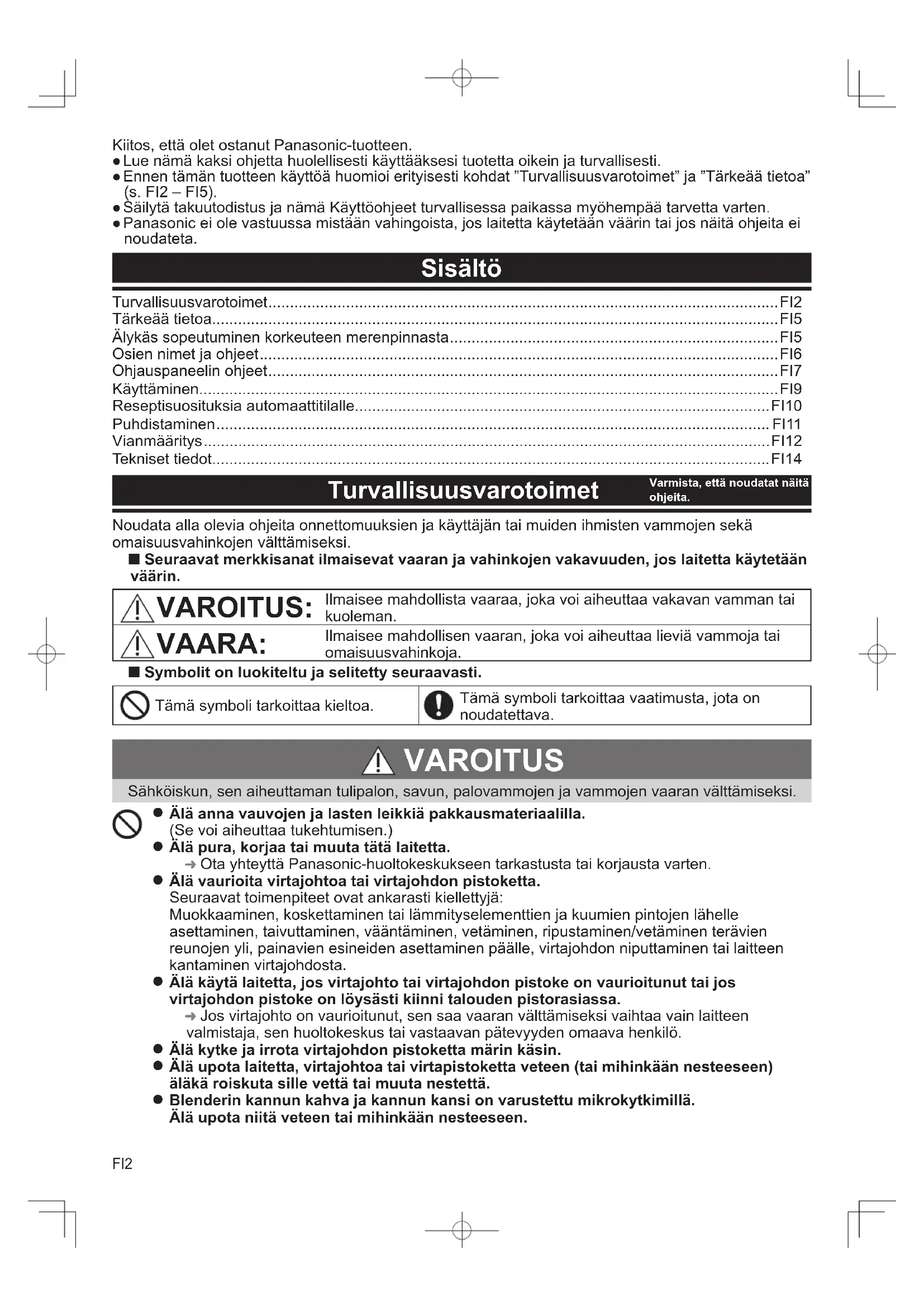 Virrankulutus Sekoittamisen aikana 450 W Lämmityksen aikana 800 W - 950 W Pois päältä-tilassa 0,4 W Virrankulutus pois päältä -tilassa 0,4 W Virrankulutus valmiustilassa e.s. Virrankulutus verkkoyhteyden valmiustiloissa e.s. Oletusaika pois päältä -tilaan siirtymiseen 5 minuutin Nopeudensäätö 10 vaihtoehtoa on käytettävissä. Arvioitu työaika (sekoitus) MAX (Kylmä neste): 1,2 l / MAX (Kuuma neste): 1 l Suurin kapasiteetti Jatkuva toiminta (Manuaalisessa tilassa laite jatkaa toimintaa 6 minuutin ajan. 6 minuutin jälkeen se automaattisesti lopettaa sekoituksen ja palaa aloitusnäyttöön.) Mitat (L × S × K) (noin) 206 × 247 × 399 cm Paino (noin) 5,0 kg Virtajohdon pituus (noin) 1,0 m Akustinen melu [dB(A) ref 1 pW] 74,47 Vanhojen laitteiden hävittäminen Vain EU-jäsenmaille ja kierrätysjärjestelmää käyttäville maille. Tämä symboli tuotteissa, pakkauksessa ja / tai asiakirjoissa tarkoittaa, että käytettyjä sähköllä toimivia ja elektronisia tuotteita ei saa laittaa yleisiin talousjätteisiin. Toimita vanhat tuotteet käsittelyä, uusiointia tai kierrätystä varten vastaaviin keräyspisteisiin laissa annettujen määräysten mukaisesti. Hävittämällä tuotteet asiaankuuluvasti autat samalla suojaamaan arvokkaita luonnonvaroja ja estämään mahdollisia negatiivisia vaikutuksia ihmiseen ja luontoon. Lisätietoa keräämisestä ja kierrätyksestä saa paikalliselta jätehuollosta vastuulliselta viranomaiselta. Maiden lainsäädännön mukaisesti tämän jätteen määräystenvastaisesta hävittämisestä voidaan antaa sakkorangaistuksia.MemoDA2 Tak, fordi du har købt et Panasonic-produkt. ●For at kunne bruge produktet korrekt og sikkert, bedes du læse disse vejledninger nøje. ●Inden dette produkt anvendes, skal du være særlig opmærksom på “Sikkerhedsforanstaltninger” og "Vigtig information" (P. DA2 - DA5). ●Gem garantibeviset og denne Brugsvejledning til fremtidig brug. ●Panasonic påtager sig intet ansvar, hvis maskinen bruges forkert, eller hvis denne vejledning ikke følges. Indhold Sikkerhedsforanstaltninger ............................................................................................................. DA2 Vigtig information ............................................................................................................................DA5 Intelligent tilpasning af højde .......................................................................................................... DA5 Delnavne og vejledninger ............................................................................................................... DA6 Anvisninger til kontrolpanelet..........................................................................................................DA7 Sådan bruges produktet ................................................................................................................. DA9 Anbefalinger til opskrifter i automatisk tilstand ............................................................................. DA10 Sådan rengøres produktet ............................................................................................................ DA11 Fejlfinding .....................................................................................................................................DA12 Specifikationer ..............................................................................................................................DA14 Sikkerhedsforanstaltninger Følg anvisningerne nedenfor for at forhindre ulykker eller skader på brugeren, andre personer eller materielle skader.