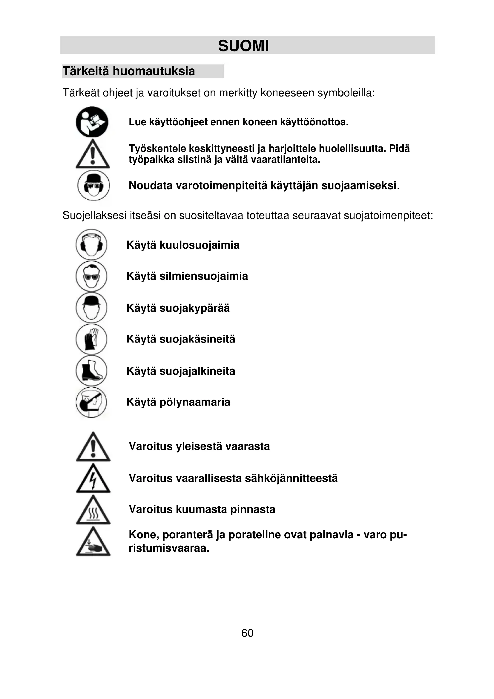 Lothar Lässig Frank Markert General Manager Chef for teknik Eibenstock, 25.06.2025 Med forbehold for ændringer uden varsel.60 SUOMI Tärkeitä huomautuksia Tärkeät ohjeet ja varoitukset on merkitty koneeseen symboleilla: