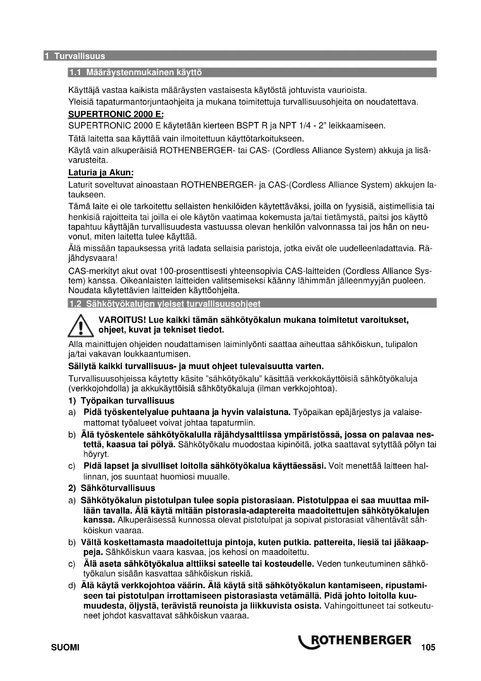 Käyttäjä vastaa kaikista määräysten vastaisesta käytöstä johtuvista vaurioista. Yleisiä tapaturmantorjuntaohjeita ja mukana toimitettuja turvallisuusohjeita on noudatettava. SUPERTRONIC 2000 E: SUPERTRONIC 2000 E käytetään kierteen BSPT R ja NPT 1/4 - 2” leikkaamiseen. Tätä laitetta saa käyttää vain ilmoitettuun käyttötarkoitukseen. Käytä vain alkuperäisiä ROTHENBERGER- tai CAS- (Cordless Alliance System) akkuja ja lisä- varusteita. Laturia ja Akun: Laturit soveltuvat ainoastaan ROTHENBERGER- ja CAS-(Cordless Alliance System) akkujen la- taukseen. Tämä laite ei ole tarkoitettu sellaisten henkilöiden käytettäväksi, joilla on fyysisiä, aistimellisia tai henkisiä rajoitteita tai joilla ei ole käytön vaatimaa kokemusta ja/tai tietämystä, paitsi jos käyttö tapahtuu käyttäjän turvallisuudesta vastuussa olevan henkilön valvonnassa tai jos hän on neu- vonut, miten laitetta tulee käyttää. Älä missään tapauksessa yritä ladata sellaisia paristoja, jotka eivät ole uudelleenladattavia. Rä- jähdysvaara! CAS-merkityt akut ovat 100-prosenttisesti yhteensopivia CAS-laitteiden (Cordless Alliance Sys- tem) kanssa. Oikeanlaisten laitteiden valitsemiseksi käänny lähimmän jälleenmyyjän puoleen. Noudata käytettävien laitteiden käyttöohjeita.