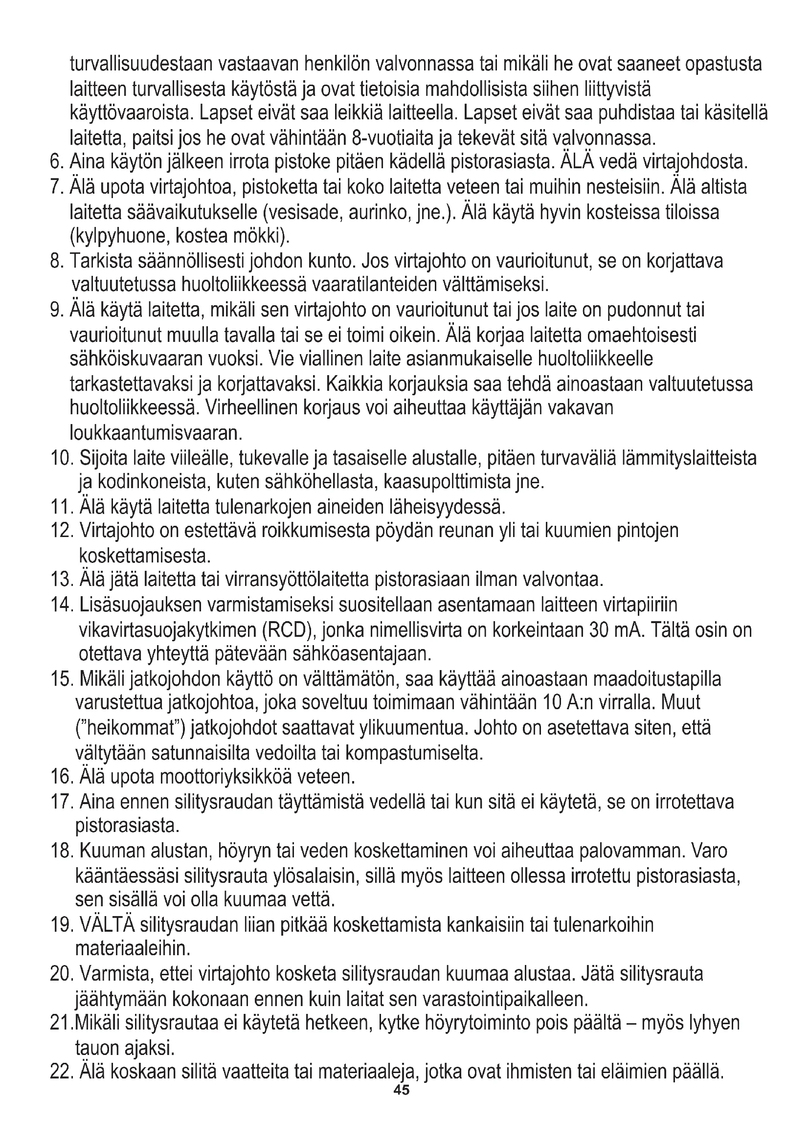 lasten leikkiä laitteella; kiellä lapsia ja laitteeseen perehtymättömiä henkilöitä käyttämästä sitä. LUE HUOLELLISESTI JA SÄILYTÄ TULEVAA KÄYTTÖÄ VARTEN