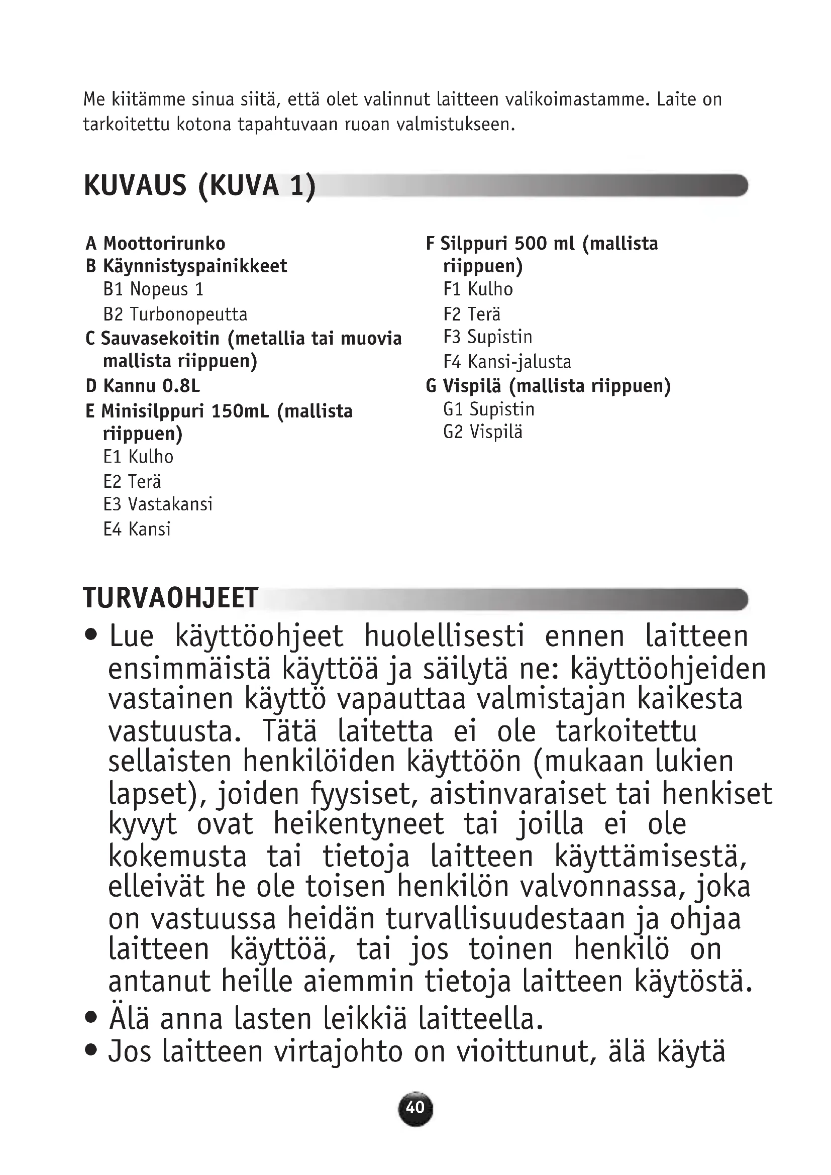 - Jos laitteen virtajohto on vioittunut, älä käytä A Moottorirunko B Käynnistyspainikkeet B1 Nopeus 1 B2 Turbonopeutta C Sauvasekoitin (metallia tai muovia mallista riippuen) D Kannu 0.8L E Minisilppuri 150mL (mallista riippuen) E1 Kulho E2 Terä E3 Vastakansi E4 Kansi F Silppuri 500 ml (mallista riippuen) F1 Kulho F2 Terä F3 Supistin F4 Kansi-jalusta G Vispilä (mallista riippuen) G1 Supistin G2 Vispilälaitetta. Vaarojen välttämiseksi se on vaihdatettava valmistajalla, valtuutetussa huoltokeskuksessa (katso lista huoltokirjasesta) tai samanlaisen pätevyyden omaavilla henkilöillä.