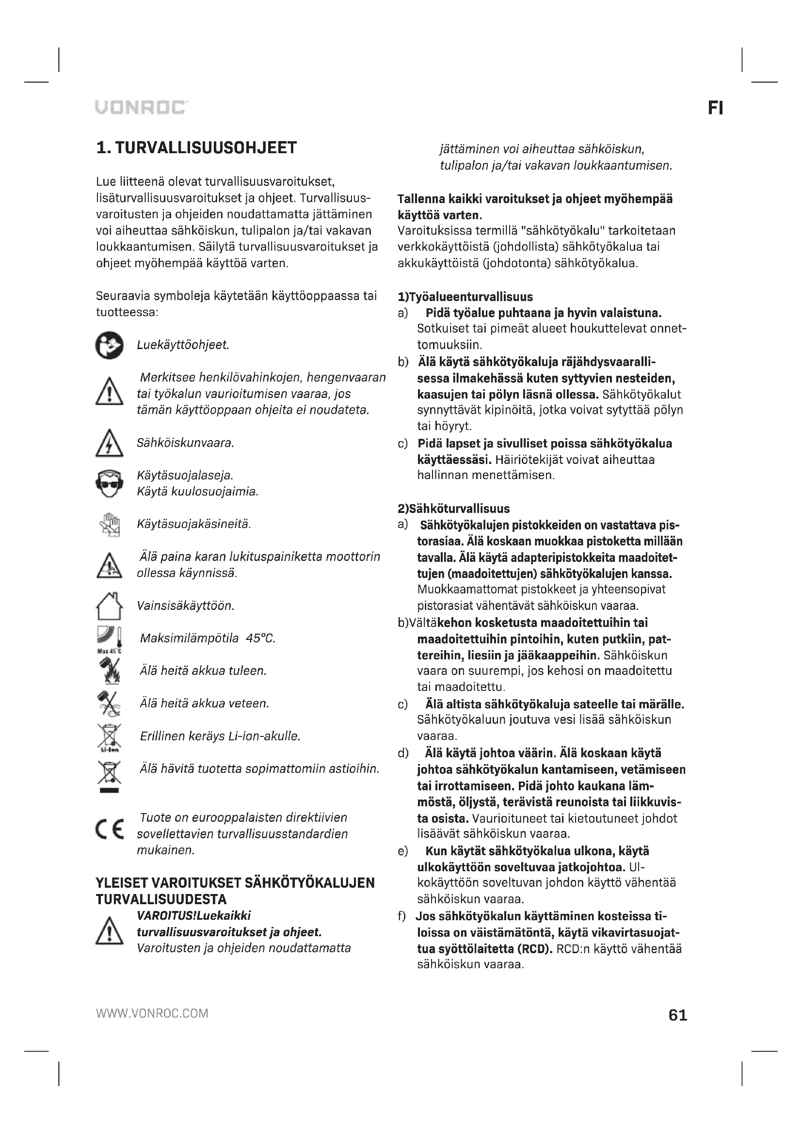 rinnallasi. Tahaton kosketus pyörivään lisävar- usteeseen voi tarttua vaatteisiisi ja vetää lisävarusteen kehoosi. j) Älä anna kiillotuskannen tai sen kiinnitysnaru- jen irtonaisen osan pyöriä vapaasti. Pujota tai leikkaa irtonaiset kiinnitysnarut pois. Löysät ja pyörivät kiinnitysnarut voivat sotkeutua sormiin tai tarttua työkappaleeseen. AKUN TURVALLISUUSVAROITUKSET a) Älä avaa akkua. Oikosulun vaara. b) Suojaa akku kuumuudelta, esim. jatkuvalta voimakkaalta auringonvalolta, tulelta, vedeltä ja kosteudelta. Räjähdysvaara. c) Jos akku vaurioituu ja sitä käytetään väärin, siitä voi vapautua höyryjä. Tuuleta alue ja hake- udu lääkäriin, jos ilmenee valituksia. Höyryt voivat ärsyttää hengityselimiä. d) Käytä akkua vain yhdessä VONROC-tuotteesi kanssa. Tämä toimenpide yksin suojaa akkua vaaralliselta ylikuormitukselta.