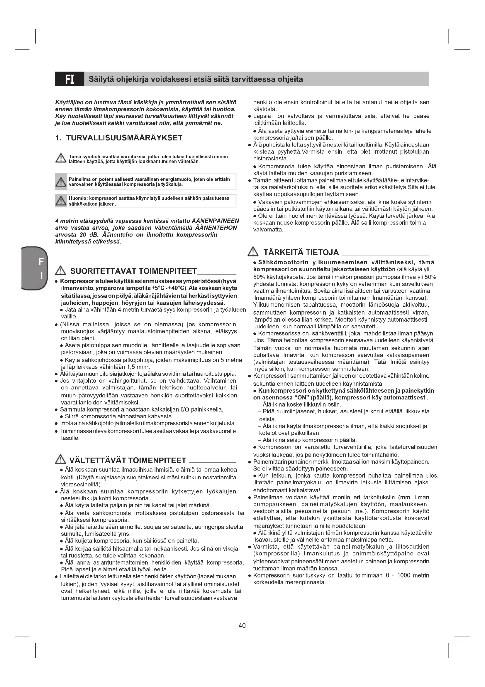 Tämä symboli osoittaa varoituksia, jotka tulee lukea huolellisesti ennen laitteen käyttöä, jotta käyttäjän loukkaantuminen vältetään.Paineilma on potentiaalisesti vaarallinen energiamuoto, joten ole erittäin varovainen käyttäessäsi kompressoria ja työkaluja.Huomio: kompressori saattaa käynnistyä uudelleen sähkön palautuessa sähkökatkon jälkeen. 4 metrin etäisyydellä vapaassa kentässä mitattu ÄÄNENPAINEEN arvo vastaa arvoa, joka saadaan vähentämällä ÄÄNENTEHON arvosta 20 dB. Äänenteho on ilmoitettu kompressoriin kiinnitetyssä etiketissä. SUORITETTAVAT TOIMENPITEET ● Kompressoria tulee käyttää asianmukaisessa ympäristössä (hyvä ilmanvaihto, ympäröivä lämpötila +5°C - +40°C). Älä koskaan käytä sitä tilassa, jossa on pölyä, äläkä räjähtävien tai herkästi syttyvien jauheiden, happojen, höyryjen tai kaasujen läheisyydessä. ● Jätä aina vähintään 4 metrin turvaetäisyys kompressorin ja työalueen välille. ● (Niissä malleissa, joissa se on olemassa) jos kompressorin muovisuojus värjääntyy maalaustoimenpiteiden aikana, etäisyys on liian pieni. ● Aseta pistotulppa sen muodolle, jännitteelle ja taajuudelle sopivaan pistorasiaan, joka on voimassa olevien määräysten mukainen. ● Käytä sähköjohdossa jatkojohtoja, joiden maksimipituus on 5 metriä ja läpileikkaus vähintään 1,5 mm². ● Älä käytä muun pituisia jatkojohtoja äläkä sovittimia tai haaroitustulppia. ● Jos virtajohto on vahingoittunut, se on vaihdettava. Vaihtaminen on annettava valmistajan, tämän teknisen huoltopalvelun tai muun pätevyydeltään vastaavan henkilön suoritettavaksi kaikkien vaaratilanteiden välttämiseksi. ● Sammuta kompressori ainoastaan katkaisijan I/O painikkeella. ● Siirrä kompressoria ainoastaan kahvasta. ● Irrota aina sähköjohto ja ilmaletku ilmakompressorista ennen kuljetusta. ● Toiminnassa oleva kompressori tulee asettaa vakaalle ja vaakasuoralle tasolle.