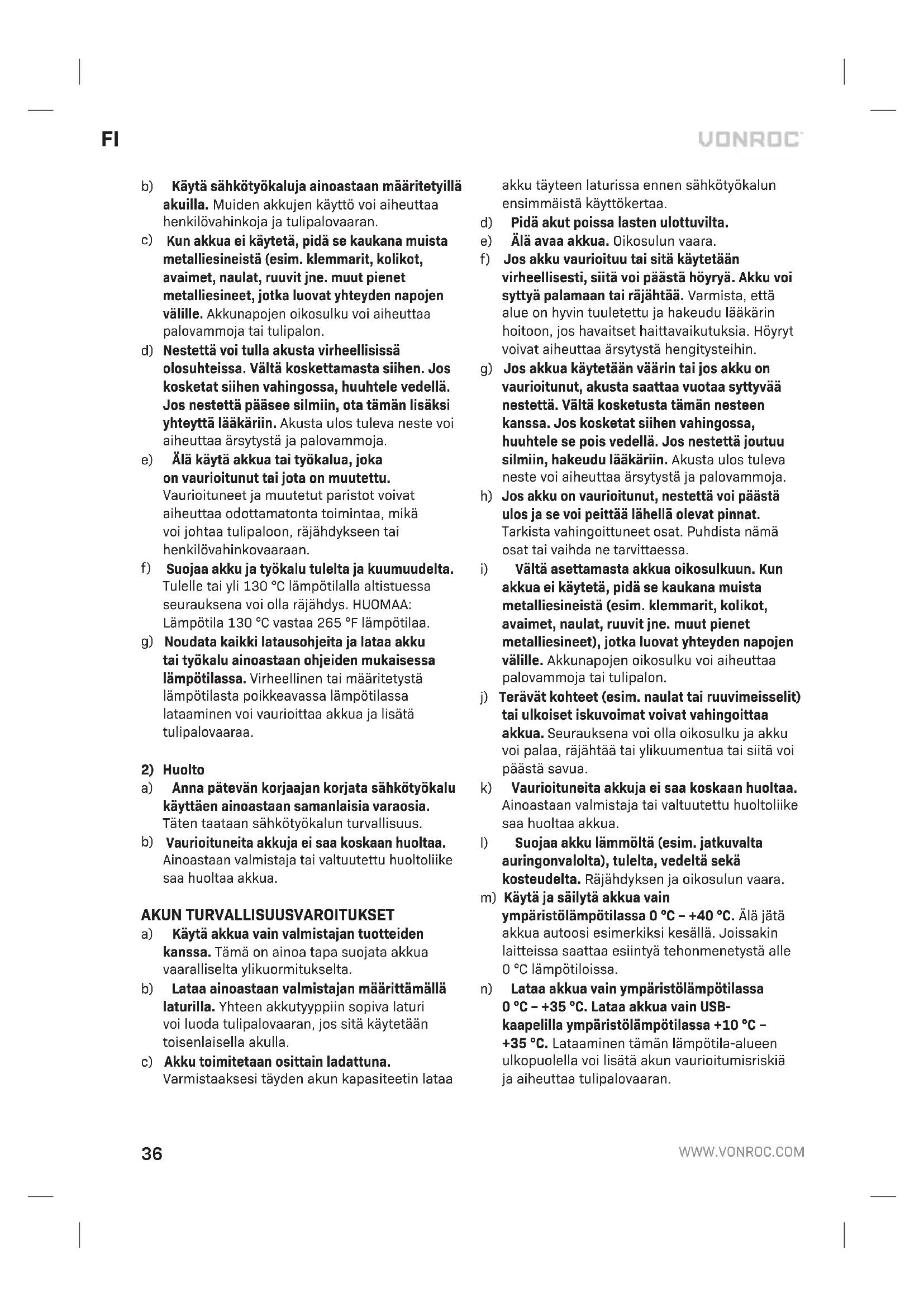 - Tuotteessa on käytetty muita kuin alkuperäisiä varaosia. Yhtiö myöntää yksinomaan tämän takuun. Muita suoria tai välillisiä takuita ei myönnetä tämän takuun lisäksi, mukaan lukien välilliset takuut koskien kaupattavuutta ja sopivuutta tiettyyn käyttötarkoitukseen. VONROC ei missään tapauksessa ota vastuuta satunnaisista tai seuraamuksellisista vahingoista. Jälleenmyyjien korjaavat toimet rajoittuvat niiden yksiköiden tai osien korjaamiseen tai vaihtamiseen, jotka eivät ole vaatimustenmukaisia. Tuotteeseen ja ohjekirjaan voidaan tehdä muutoksia. Teknisiin tietoihin voidaan tehdä muutoksia ilmoituksetta.