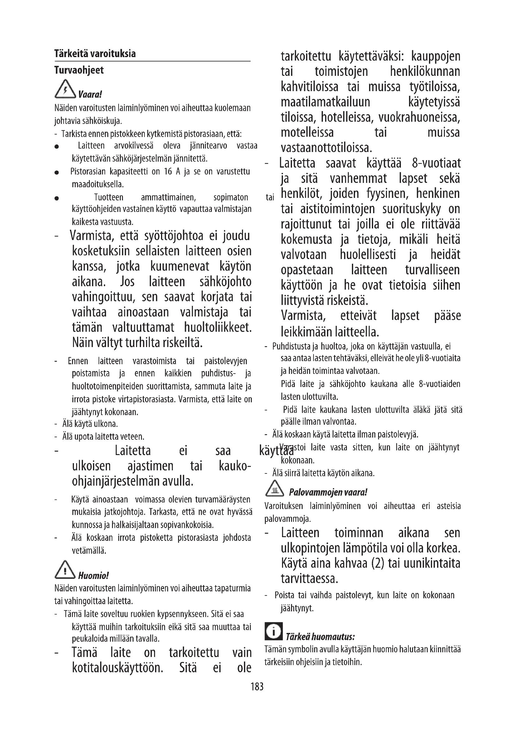 ODMERKI ZA: 8-10 oblat PRIPRAVA: 10 minut ČAS PEKE: 15 minut SESTAVINE: - moka 2 skodelici / 460 g - 1 žlička soli - 1 žlički kvasa / 3 g - sladkor 170 g - 2 jajci - 1 in 1/2 skodelice mlačnega mleka / 345 ml - maslo 80 g - 1 žlička vaniljinega izvlečka - jedilna čokolada 140 g - kakav v prahu 60 g - cimet 6 g PRIPRAVA: Čokolado in maslo damo v skledo za mikrovalovno pečico in v njej 30 sekund segrevamo z največjo močjo. Mešamo, dokler se čokolada in maslo ne povsem stopita in zmes postane gladka. Pustite, da se nekoliko ohladi. V večji skledi z metlico premešamo jajca, mleko in vanilin ter previdno umešamo zmes masla in čokolade. V večjo skledo skupaj presejemo moko, sladkor, kakav v prahu, cimet, kvas in sol. Jajcem dodamo zmes koke in drugih sestavin ter vse skupaj premešamo z metlico, dokler zmes ne postane dovolj gladka. Segrejemo ploščo za oblate. Ko se na zaslonu pojavi napis READY, ploščo namažemo z maslom ali obrizgamo s pršilom proti oprijemanju, nato v vsak model plošče vlijemo po eno merico, pri tem si pomagamo z žlico; maso razprostremo z lopatico. Oblate pečemo dokler niso lepo zapečeni ter hrustljavi (5 minut). Nadaljujemo, dokler ne porabimo vse mase. Postrežemo takoj.183 Tärkeitä varoituksia Turvaohjeet Vaara! Näiden varoitusten laiminlyöminen voi aiheuttaa kuolemaan johtavia sähköiskuja. - Tarkista ennen pistokkeen kytkemistä pistorasiaan, että: ● Laitteen arvokilvessä oleva jännitearvo vastaa käytettävän sähköjärjestelmän jännitettä. ● Pistorasian kapasiteetti on 16 A ja se on varustettu maadoituksella. ● Tuotteen ammattimainen, sopimaton tai käyttöohjeiden vastainen käyttö vapauttaa valmistajan kaikesta vastuusta. - Varmista, että syöttöjohtoa ei joudu kosketuksiin sellaisten laitteen osien kanssa, jotka kuumenevat käytön aikana. Jos laitteen sähköjohto vahingoittuu, sen saavat korjata tai vaihtaa ainoastaan valmistaja tai tämän valtuuttamat huoltoliikkeet. Näin vältyt turhilta riskeiltä. - Ennen laitteen varastoimista tai paistolevyjen poistamista ja ennen kaikkien puhdistus- ja huoltotoimenpiteiden suorittamista, sammuta laite ja irrota pistoke virtapistorasiasta. Varmista, että laite on jäähtynyt kokonaan. - Älä käytä ulkona. - Älä upota laitetta veteen. - Laitetta ei saa käyttää ulkoisen ajastimen tai kauko- ohjainjärjestelmän avulla. - Käytä ainoastaan voimassa olevien turvamääräysten mukaisia jatkojohtoja. Tarkasta, että ne ovat hyvässä kunnossa ja halkaisijaltaan sopivankokoisia. - Älä koskaan irrota pistoketta pistorasiasta johdosta vetämällä. Huomio! Näiden varoitusten laiminlyöminen voi aiheuttaa tapaturmia tai vahingoittaa laitetta. - Tämä laite soveltuu ruokien kypsennykseen. Sitä ei saa käyttää muihin tarkoituksiin eikä sitä saa muuttaa tai peukaloida millään tavalla. - Tämä laite on tarkoitettu vain kotitalouskäyttöön. Sitä ei ole tarkoitettu käytettäväksi: kauppojen tai toimistojen henkilökunnan kahvitiloissa tai muissa työtiloissa, maatilamatkailuun käytetyissä tiloissa, hotelleissa, vuokrahuoneissa, motelleissa tai muissa vastaanottotiloissa. - Laitetta saavat käyttää 8-vuotiaat ja sitä vanhemmat lapset sekä henkilöt, joiden fyysinen, henkinen tai aistitoimintojen suorituskyky on rajoittunut tai joilla ei ole riittävää kokemusta ja tietoja, mikäli heitä valvotaan huolellisesti ja heidät opastetaan laitteen turvalliseen käyttöön ja he ovat tietoisia siihen liittyvistä riskeistä. Varmista, etteivät lapset pääse leikkimään laitteella. - Puhdistusta ja huoltoa, joka on käyttäjän vastuulla, ei saa antaa lasten tehtäväksi, elleivät he ole yli 8-vuotiaita ja heidän toimintaa valvotaan. Pidä laite ja sähköjohto kaukana alle 8-vuotiaiden lasten ulottuvilta. - Pidä laite kaukana lasten ulottuvilta äläkä jätä sitä päälle ilman valvontaa. - Älä koskaan käytä laitetta ilman paistolevyjä. - Varastoi laite vasta sitten, kun laite on jäähtynyt kokonaan. - Älä siirrä laitetta käytön aikana. Palovammojen vaara! Varoituksen laiminlyöminen voi aiheuttaa eri asteisia palovammoja. - Laitteen toiminnan aikana sen ulkopintojen lämpötila voi olla korkea. Käytä aina kahvaa (2) tai uunikintaita tarvittaessa. - Poista tai vaihda paistolevyt, kun laite on kokonaan jäähtynyt. Tärkeä huomautus: Tämän symbolin avulla käyttäjän huomio halutaan kiinnittää tärkeisiin ohjeisiin ja tietoihin.184 - Älä kypsennä ruokia, jotka on kääritty muovikalvoon, folioon tai polyeteenipusseihin, jotta vältetään tulipalovaara. Tämä tuote täyttää vaatimukset Euroopan yhteisön asetuksessa (EY) nro 1935/2004, joka käsittelee elintarvikkeiden kanssa kosketuksiin joutuvia materiaaleja ja esineitä. Laitteen hävitys Laitetta ei saa hävittää tavallisten kotitalousjätteiden joukossa, vaan se on toimitettava viralliseen kierrätyskeskukseen. KUVAUS
