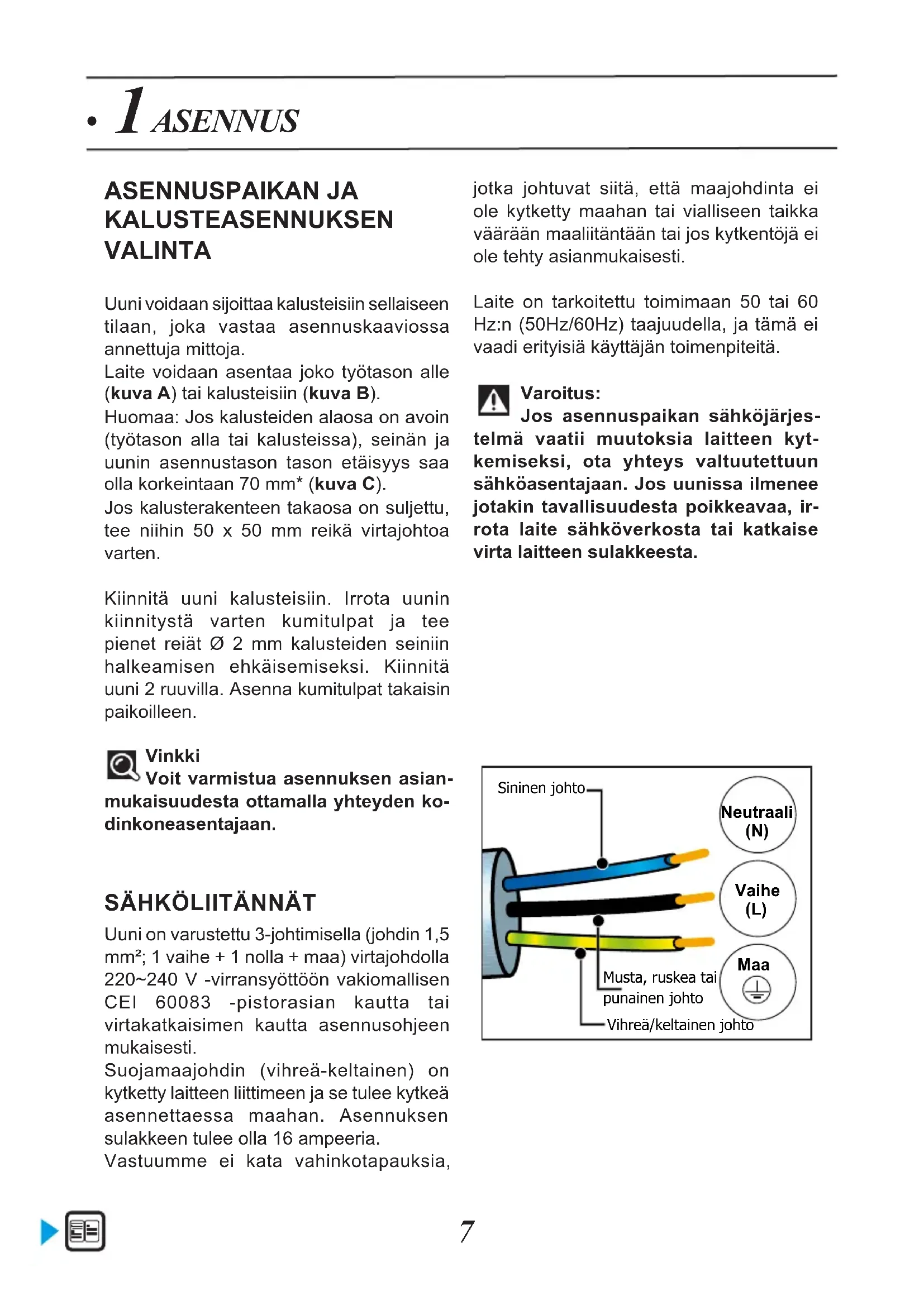 ASENNUS ASENNUSPAIKAN JA KALUSTEASENNUKSEN VALINTA Uuni voidaan sijoittaa kalusteisiin sellaiseen tilaan, joka vastaa asennuskaaviossa annettuja mittoja.Laite voidaan asentaa joko työtason alle (kuva A) tai kalusteisiin (kuva B). Huomaa: Jos kalusteiden alaosa on avoin (työtason alla tai kalusteissa), seinän ja uunin asennustason tason etäisyys saa olla korkeintaan 70 mm* (kuva C).Jos kalusterakenteen takaosa on suljettu, tee niihin 50 x 50 mm reikä virtajohtoa varten.Kiinnitä uuni kalusteisiin. Irrota uunin kiinnitystä varten kumitulpat ja tee pienet reiät Ø 2 mm kalusteiden seiniin halkeamisen ehkäisemiseksi. Kiinnitä uuni 2 ruuvilla. Asenna kumitulpat takaisin paikoilleen.Vinkki Voit varmistua asennuksen asian-mukaisuudesta ottamalla yhteyden ko-dinkoneasentajaan.