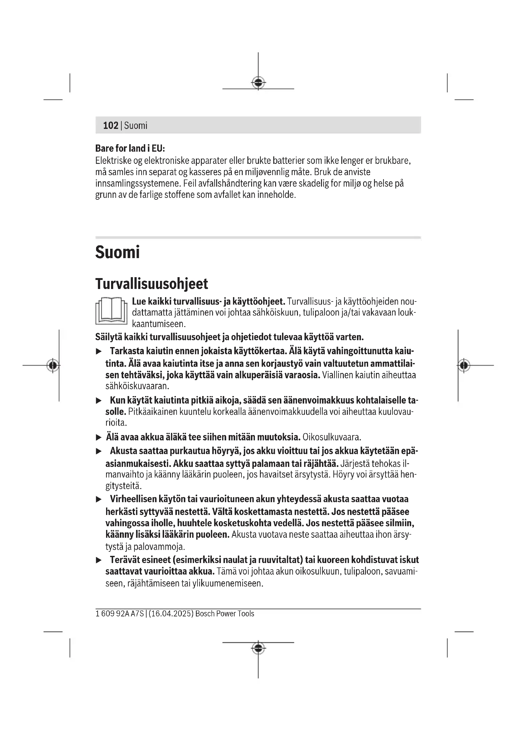 Akun lataustilan LED-merkkivalot voivat ilmaista akun lataustilan lisäksi akun vikavaaraa. 1 609 92A A7S | (16.04.2025) Bosch Power ToolsSuomi | 107 Aktivoi toiminto painamalla lataustilan näytön painiketta kolmen sekunnin ajan. Akun analysoinnista ilmoitetaan akun lataustilan näytön juoksevalla merkkivalolla. Analysoin- nin tulos näkyy akun lataustilan näytössä. 1 LED-valo: akussa on suuri vikavaara. Tämä on jo saattanut pienen- tää tehoa ja käyttöaikaa. Suosittelemme vaihtamaan akun. 5 LED-valoa: akku on hyvässä kunnossa ja sen vikavaara on pieni. Huomaa: akun vikavaaran arviointi tapahtuu kaksivaiheisesti ja mah- dollistaa akun kunnon yksinkertaistetun analysoinnin. Akku katsotaan joko hyväkuntoi- seksi tai vikaherkäksi. Analyysi ei ilmoita akun kuntoa prosentteina. Akun suojaaminen Jos USB Type‑C® -porttiin (15) ei ole liitetty johtoa, kaiuttimen ja akun voi suojata pölyltä ja roiskevedeltä akkukotelon kannella (11). Aseta akkukotelon kansi (11) paikalleen ja sulje se lukitusvivulla (10). Avaa akkukotelon kannen lukitusvipu (10) ja irrota akkukotelon kansi (11) akun vaihta- mista tai verkkolaitteen käyttöä varten. Ohjeita akun optimaaliseen käsittelyyn Suojaa akku kosteudelta ja vedeltä. Säilytä akkua vain –20...50°C lämpötilassa. Älä jätä akkua esimerkiksi kuumana kesä- päivänä pitkäksi ajaksi autoon. Puhdista akun tuuletusaukot säännöllisin väliajoin pehmeällä, puhtaalla ja kuivalla sivelti- mellä. Huomattavasti lyhentynyt käyntiaika latauksen jälkeen osoittaa, että akku on elinikänsä lopussa ja täytyy vaihtaa uuteen. Huomioi hävitysohjeet. Käyttö verkkolaitteella u Huomioi sähköverkon jännite! Virtalähteen jännitteen tulee vastata verkkolaitteen laitekilvessä olevia tietoja. u Käytä verkkovirtalähteellä vain USB Type‑C® -verkkolaitetta Power Deliveryn (USB‑PD) kanssa. Sen on täytettävä luvun "Tekniset tiedot" vaatimukset ulostu- lojännitteen, vähimmäisulostulovirran ja ulostulotehon osalta. Huomioi verkko- laitteen käyttöohjeet. Muunlaisten verkkolaitteiden käyttö voi vaurioittaa kaiutinta. Jos verkkolaitteen teho on liian alhainen, kaiutin kytkeytyy pois päältä. Avaa USB Type‑C® -portin suojus (15). Liitä verkkolaite sopivalla johdolla kaiuttimen USB Type‑C® -porttiin (15). Liitä verkkolaite sähköverkkoon. Bosch Power Tools 1 609 92A A7S | (16.04.2025)108 | Suomi Sulje USB Type‑C® -portin suojus (15) portin likaantumisen välttämiseksi, kun irrotat verkkolaitteen johdon. Käyttö u Suojaa kaiutin kastumiselta. Veden pääsy kaiuttimen sisään aiheuttaa sähköisku- vaaran. u Pidä akkukotelon kansi ja USB Type‑C® -portin suojus suljettuna aina, kun se on mahdollista. Suljetut suojakannet suojaavat kaiutinta vedeltä ja pölyltä. Audiokäyttö Käynnistäminen, sammuttaminen ja äänenvoimakkuuden säätäminen Käynnistä kaiutin painamalla käynnistyspainiketta(2), kunnes tilanäyttö (3) palaa het- ken vihreänä. Sammuta kaiutin painamalla käynnistyspainiketta(2), kunnes tilanäyttö (3) sammuu. Kaiutin sammuu automaattisesti 20min kuluttua, jos tänä aikana ei muodosteta Bluetooth®-yhteyttä tai yhteyttä ei muodosteta Multi-Speaker Soundin avulla. Voit säätää äänenvoimakkuutta painamalla äänenvoimakkuuden nostamisen painiketta (5) tai äänenvoimakkuuden laskemisen painiketta (7) lyhyesti niin monta kertaa, että ha- luttu äänenvoimakkuus on saavutettu. Kaiuttimen käynnistyksen jälkeen musiikki soi aina pienellä äänenvoimakkuudella. Audiotoimintojen yleiskatsaus Kaiuttimessa on seuraavat audiotoiminnot: – Äänentoisto Bluetooth®-yhteydellä liitetyistä laitteista (oletusasetus) – Äänentoisto Multi-Speaker Soundin kautta – Nykyisen äänentoiston välittäminen Bluetooth®-yhteydellä Multi-Speaker Soundin avulla muihin tällä toiminnolla varustettuihin laitteisiin Nykyisen audiotoiminnon tunnistaa tilanäytöstä (3): – sininen: Bluetooth®-signaalin toisto – vaaleansininen: Multi-Speaker Streamin toisto – violetti: nykyisen toiston välitys Multi-Speaker Soundin kautta Ulkoisten audiolähteiden kuuntelu/ohjaus Bluetooth®-yhteydellä Kaiuttimen käynnistyksen jälkeen oletusasetuksena on Bluetooth®-toisto. Voit vaihtaa toisesta audiotoiminnosta Bluetooth®-toimintoon painamalla lyhyesti Bluetooth®- painiketta(1). 1 609 92A A7S | (16.04.2025) Bosch Power ToolsSuomi | 109 – Uuden yhteyden muodostaminen: aloita yhteyshaku, jos käytettävissä ei ole tallen- nettua audiolähdettä tai kun haluat katkaista olemassa olevan Bluetooth®-yhteyden audiolähteeseen ja etsiä uuden audiolähteen. Paina sitä varten Bluetooth®- painiketta(1) yli 0,5s ajan. Haun aikana tilanäyttö (3) vilkkuu nopeasti sinisenä. Aktivoi uusi parikytkentä ulkoisen audiolähteen kautta. Älypuhelimissa tämä on yleensä mahdollista Bluetooth®-valikon asetuksissa. Kaiutin näkyy käytettävissä ole- vana laitteena nimellä GPB18V‑1Cxxxx. Noudata audiolähteen/älypuhelimen käyt- töohjeita. – Yhteyden muodostaminen uudelleen: jos kaiutin on ollut jo aiemmin Bluetooth®-yh- teydessä ulkoiseen audiolähteeseen (esim. älypuhelimeen) ja kyseinen audiolähde on jälleen käytettävissä, laite muodostaa automaattisesti yhteyden tähän audiolähtee- seen. Yhteyden muodostamisen aikana tilanäyttö (3) vilkkuu hitaasti sinisenä. Jos tallennettu audiolähde ei ole käytettävissä, yhteyshaku alkaa automaattisesti 2min kuluttua. Jos yhteyden muodostus onnistui, kuulet nousevan äänimerkin ja tilanäyttö(3) palaa jat- kuvasti sinisenä. Jos yhteys katkeaa tai päättyy, kuulet laskevan äänimerkin. Yhteensä 20min kuluttua kaiutin sammuu automaattisesti. Bluetooth®-yhteydellä liitettyä audiolähdettä voi ohjata myös kaiuttimen kautta: – Edelliseen tai seuraavaan kappaleeseen voi vaihtaa painamalla äänenvoimakkuuden pienentämisen painiketta (7) tai äänenvoimakkuuden suurentamisen painiketta (5) yli 0,5s ajan. – Kun haluat käynnistää, k