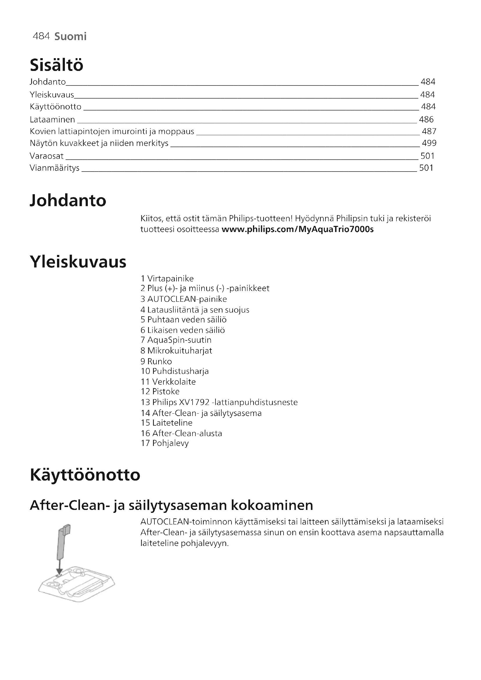 Suomi Sisältö Johdanto__________________________________________________________________________________ 484 Yleiskuvaus________________________________________________________________________________ 484 Käyttöönotto ______________________________________________________________________________ 484 Lataaminen _______________________________________________________________________________ 486 Kovien lattiapintojen imurointi ja moppaus ____________________________________________________ 487 Näytön kuvakkeet ja niiden merkitys __________________________________________________________ 499 Varaosat __________________________________________________________________________________ 501 Vianmääritys ______________________________________________________________________________ 501 Johdanto Kiitos, että ostit tämän Philips-tuotteen! Hyödynnä Philipsin tuki ja rekisteröi tuotteesi osoitteessa www.philips.com/MyAquaTrio7000s Yleiskuvaus 1 Virtapainike 2 Plus (+)- ja miinus (-) -painikkeet 3 AUTOCLEAN-painike 4 Latausliitäntä ja sen suojus 5 Puhtaan veden säiliö 6 Likaisen veden säiliö 7 AquaSpin-suutin 8 Mikrokuituharjat 9 Runko 10 Puhdistusharja 11 Verkkolaite 12 Pistoke 13 Philips XV1792 ‑lattianpuhdistusneste 14 After-Clean- ja säilytysasema 15 Laiteteline 16 After-Clean-alusta 17 Pohjalevy Käyttöönotto After-Clean- ja säilytysaseman kokoaminen AUTOCLEAN-toiminnon käyttämiseksi tai laitteen säilyttämiseksi ja lataamiseksi After-Clean- ja säilytysasemassa sinun on ensin koottava asema napsauttamalla laiteteline pohjalevyyn.485 Suomi Huomautus: Varmista, että After-Clean-alusta on asetettu pohjalevyyn ja että laitteen säilytykseen, lataamiseen ja puhdistukseen käytettävän huoneen lämpötila on 5°C:n ja 35°C:n välillä. Huomautus: voit säilyttää puhdistusharjaa myös After-Clean-alustalla. 1 Kokoa laite asettamalla kahva runkoon siten, että se napsahtaa kiinni. 2 Voit säilyttää laitetta asettamalla sen After-Clean- ja säilytystelineeseen. Liu'uta laite laitetelineeseen niin, että laitetelineen pää työntyy laitteen sisään. Jos joskus tulee tarve purkaa laite, noudata seuraavia ohjeita: 1 Työnnä tappi tai ruuvitaltta laitteen takaosassa olevaan reikään ja vedä kahvaa ylöspäin. 2 Vedä kahva irti laitteesta painaen edelleen ruuvitalttaa reikään.486 Suomi Lataaminen Laitteessa on 25 V:n litiumioniakku. Lataaminen kestää 4 tuntia. 1 Jos haluat ladata laitteen, avaa laitteen takana oleva suojus. 2 Liitä pistoke laitteen takana olevaan liitäntään. Liitä sitten verkkolaite pistorasiaan. 3 Näytössä vilkkuu 0%:n ja 90%:n välillä oleva arvo sen merkiksi, että laite latautuu. 4 Kun laite on latautunut kokonaan, näyttöön tulee arvo 100%. Näyttö sammuu muutaman minuutin kuluttua. 5 Irrota pistoke laitteen takana olevasta liitännästä. 6 Sulje suojus. Varoitus: Säilytä ja lataa laitetta yli 5°C:n ja alle 35°C:n lämpötilassa.487 Suomi Vinkki: Voit ladata laitetta After-Clean- ja säilytysasemassa. Vinkki: Voit ladata laitetta erikseen itsellesi parhaiten sopivassa paikassa. Kovien lattiapintojen imurointi ja moppaus Käyttö Puhtaan veden säiliö ja likaisen veden säiliö on jo toimitushetkellä kiinnitetty laitteeseen. Voit käyttää laitetta kovien lattiapintojen puhdistamiseen. Huomautus: Tämä laite soveltuu samanaikaiseen imurointiin ja moppaukseen. Lattiaa ei tarvitse imuroida ennen moppausta. Laite soveltuu kaiken tyyppisten kovien lattiapintojen imurointiin ja moppaukseen pinnoittamattomia puulattioita lukuun ottamatta. Voit testata laitetta pienellä alueella, joka ei ole näkyvissä, jotta varmistat laitteen sopivuuden lattiallesi. 1 Poista puhtaan veden säiliön lukitus painamalla painiketta alaspäin ja irrota puhtaan veden säiliö. 2 Avaa puhtaan veden säiliön suojus.488 Suomi 3 Lisää 15 ml Philips XV1792 ‑lattianpuhdistusnestettä puhtaan veden säiliöön. Varoitus: Philips on testannut tämän laitteen ainoastaan Philips XV1792 ‑lattianpuhdistusnesteen kanssa. Muista puhdistusaineista voi muodostua liikaa vaahtoa, mikä heikentää laitteen suorituskykyä ja voi aiheuttaa laitteessa toimintahäiriön. Philips XV1792 ‑lattianpuhdistusneste on saatavilla tietyillä markkina-alueilla. Kun käytät jotakin muuta sopivaa lattianpuhdistusnestettä, lisää sitä enintään 15 ml puhtaan veden säiliöön. 4 Täytä puhtaan veden säiliö enimmäistasolle kylmällä tai haalealla vesijohtovedellä. Varoitus: Puhtaan veden säiliöön kaadettavan vesijohtoveden lämpötila ei saa olla suurempi kuin 50 °C. 5 Sulje vesisäiliö suojuksella. 6 Aseta puhtaan veden säiliö takaisin laitteeseen.489 Suomi 7 Ota laite pois After-Clean- ja säilytystelineestä ja aseta se lattialle. Aseta jalkasi AquaSpin-suuttimen päälle ja vedä kahvasta taaksepäin, kunnes AquaSpin- suuttimen lukitus avautuu. Laite on nyt käyttövalmis. 8 Käynnistä laite painamalla virtapainiketta . Laite käynnistyy. Varoitus: älä jätä laitetta ilman valvontaa, kun AquaSpin-suutin on lukitsematta tai kun laitteen virta on kytketty. 9 Plus (+)- ja miinus (-) -painikkeilla voit valita kolme eri asetusta: