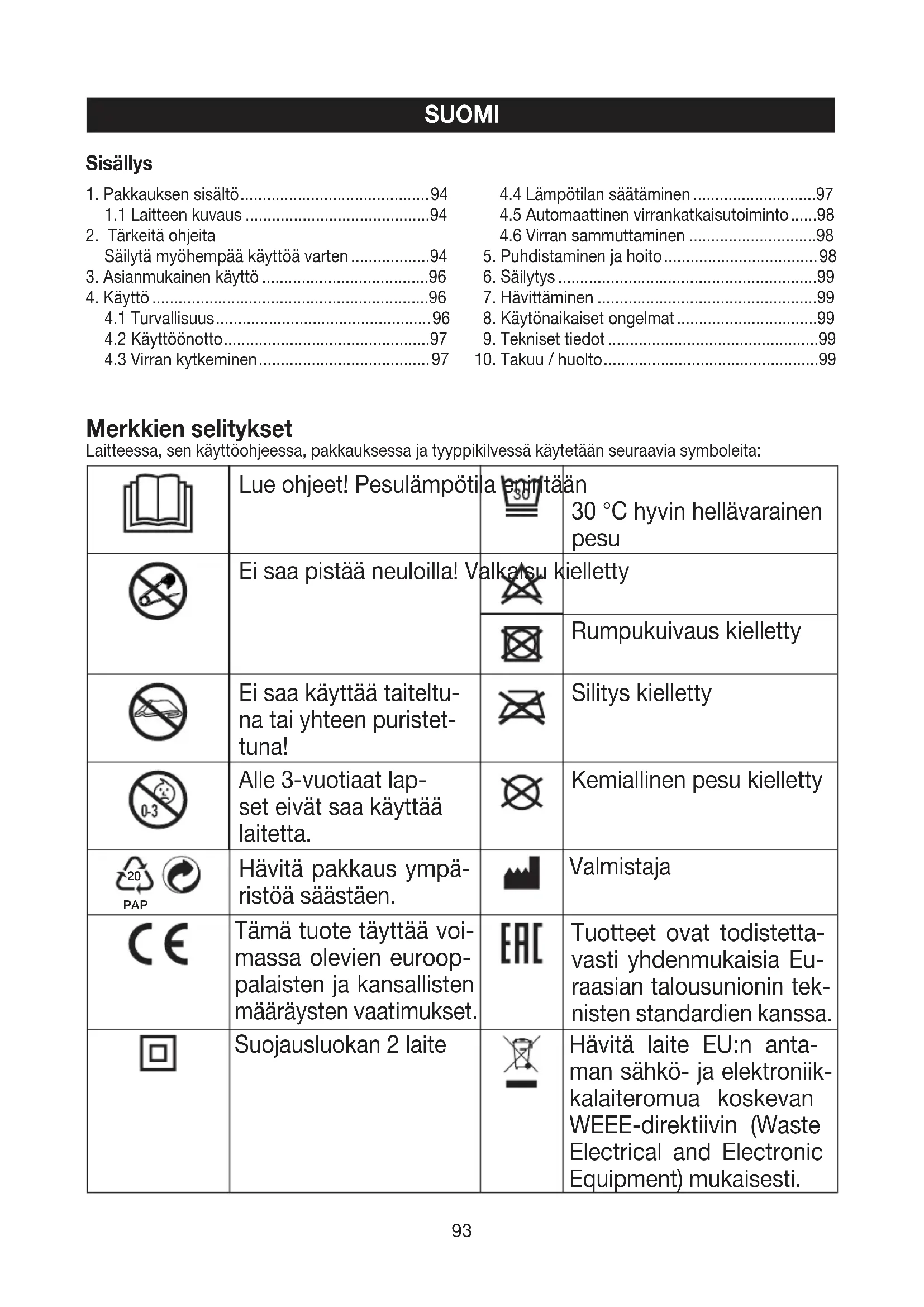 Du finner detaljert informasjon om garantien og garantivilkårene i det medfølgende garantiarket. Med forbehold om evt. feil og endringer93 SUOMI Merkkien selitykset Laitteessa, sen käyttöohjeessa, pakkauksessa ja tyyppikilvessä käytetään seuraavia symboleita: Lue ohjeet! Pesulämpötila enintään 30°C hyvin hellävarainen pesu Ei saa pistää neuloilla! Valkaisu kielletty Rumpukuivaus kielletty Ei saa käyttää taiteltu- na tai yhteen puristet- tuna! Silitys kielletty Alle 3-vuotiaat lap- set eivät saa käyttää laitetta. Kemiallinen pesu kielletty