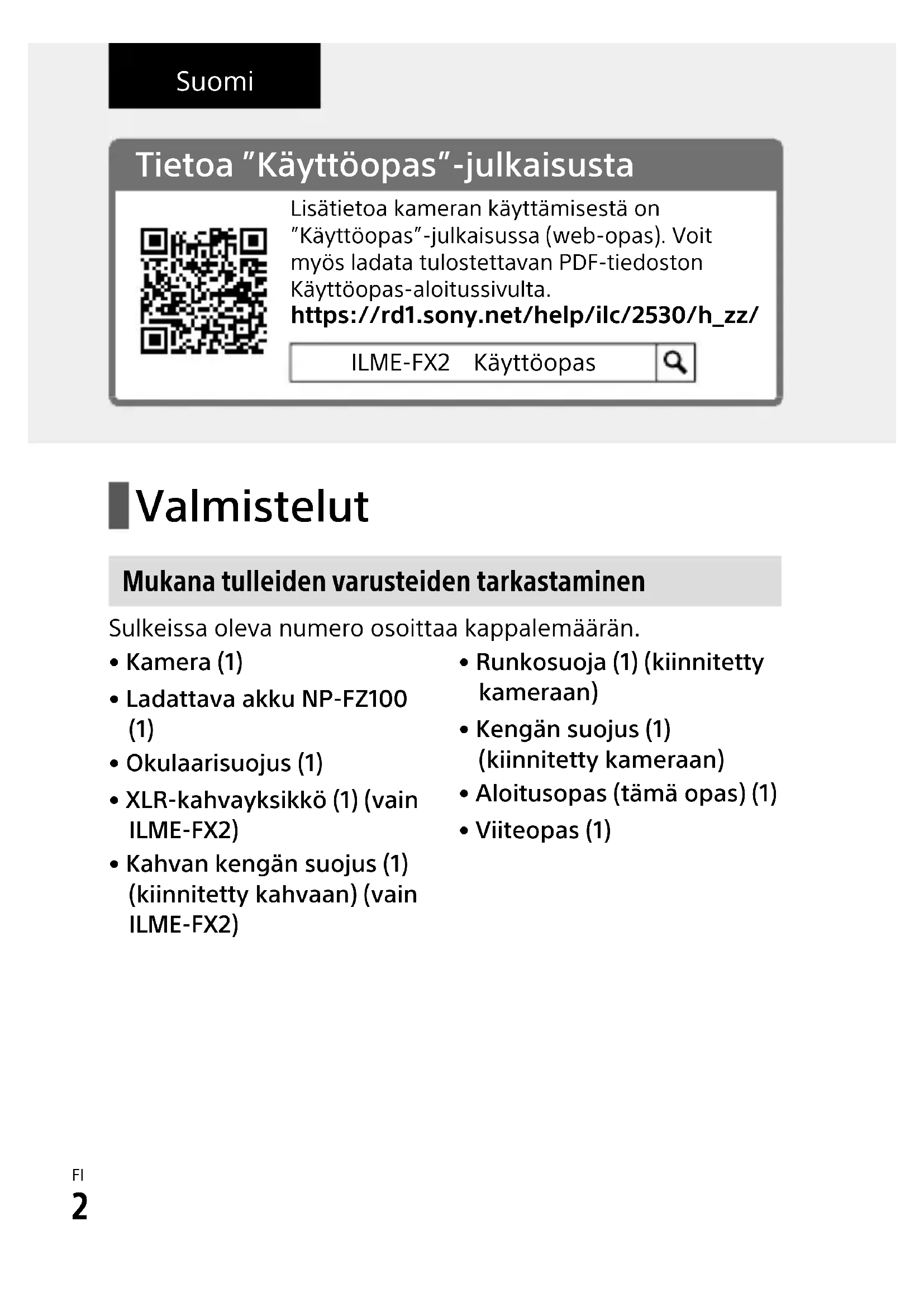 Tietoa ”Käyttöopas”-julkaisusta Lisätietoa kameran käyttämisestä on ”Käyttöopas”-julkaisussa (web-opas). Voit myös ladata tulostettavan PDF-tiedoston Käyttöopas-aloitussivulta.https://rd1.sony.net/help/ilc/2530/h_zz/ILME-FX2 Käyttöopas Suomi Valmistelut Mukana tulleiden varusteiden tarkastaminen Sulkeissa oleva numero osoittaa kappalemäärän.• Kamera (1)• Ladattava akku NP-FZ100 (1)