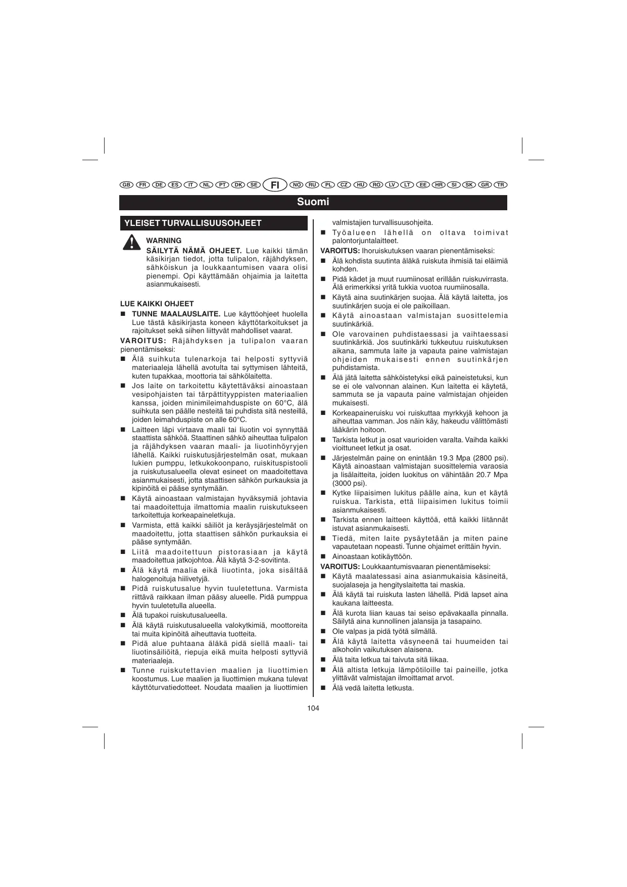 Gardez l’appareil sec, propre, et exempt d’huile et de graisse. Utilisez toujours un chiffon propre pour le nettoyer. N’utilisez jamais de liquide de frein, d’essence, de produits à base de pétrole ou de solvants pour le nettoyer. N’utilisez pas l’appareil si son interrupteur est inopérant. Faites remplacer les interrupteurs défectueux par un service après-vente agréé. Evitez les environnements dangereux. N’utilisez pas l’appareil dans un environnement humide ou mouillé et ne l’exposez pas à la pluie. Gardez la zone de travail bien éclairée. Ne dirigez jamais un jet de peinture vers des personnes ou des animaux, ni vers aucun appareil électrique. Ne démarrez jamais l’appareil si de la glace s’est formée sur l’une de ses parties. Restez à distance des éléments chauds.. Vérifiez que les écrous et boulons sont bien serrés avant chaque utilisation. Un boulon ou un écrou desserré peut gravement détériorer le moteur. Avant de ranger l’appareil, laissez le refroidir. Stockez l’essence dans un lieu frais et bien ventilé, à bonne distance de sécurité de toute source d’étincelle et/ou d’appareil produisant des flammes. N’utilisez jamais le pistolet sans qu’une buse ne soit en place. Une blessure par injection peut conduire à une possible amputation. Consultez immédiatement un médecin. Ne mettez jamais vos mains devant la buse pendant utilisation. Les gants ne protègent pas toujours des blessures par injection. Pendant utilisation, portez des vêtements de protection pour éviter que vos cheveux et votre peau n’entrent en contact avec de la peinture, ainsi qu’un masque respiratoire. La peinture, les solvants et autres produits peuvent être dangereux par inhalation ou par contact avec le corps.