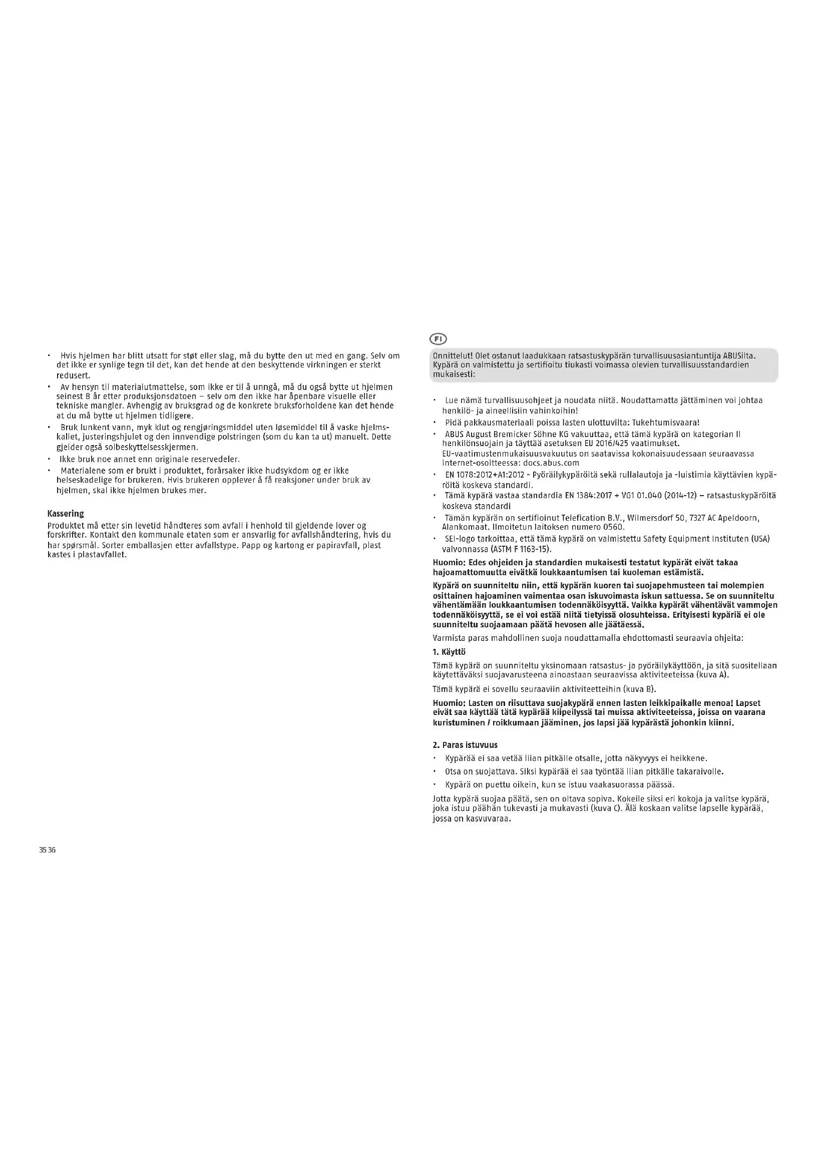 - Tuotteessa käytetyt materiaalit eivät aiheuta ihosairauksia eivätkä ole vaarallisia käyttäjän terveydelle. Jos käyttäjä havaitsee reaktion kypärän käytön aikana, kypärää ei saa enää käyttää. Hävittäminen Hävitä tuote sen käyttöiän päätyttyä voimassa olevien lakimääräysten mukaisesti. Jos sinulla on kysyttävää hävittämisestä, käänny vastaavan paikallisen viranomaisen puoleen. Hävitä pakkaus samankaltaisten jätteiden kanssa. Toimita pahvi ja kartonki pahvinkeräykseen, kalvot ja muoviosat hyötyjätekeräykseen.39 40 Gratulujemy zakupu wysokiej jakości kasku jeździeckiego rmy ABUS, wyprodukowanego i certykowanego zgodnie z obowiązującymi normami bezpieczeństwa.