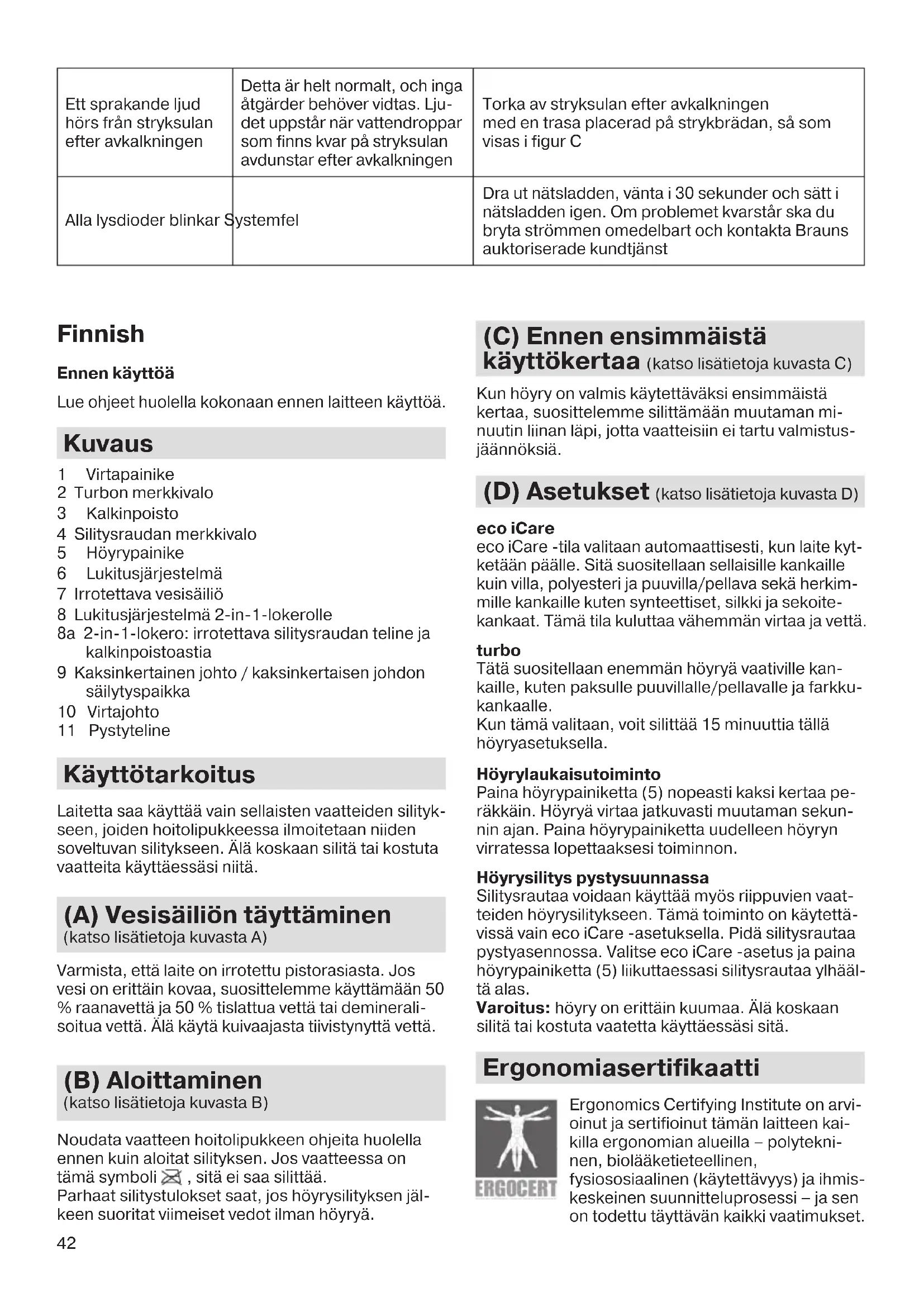 - Älä keskeytä prosessia nostamalla silitysrautaa kalkinpoistoastiasta, koska aluslevystä tulee kuu- maa vettä ja höyryä.