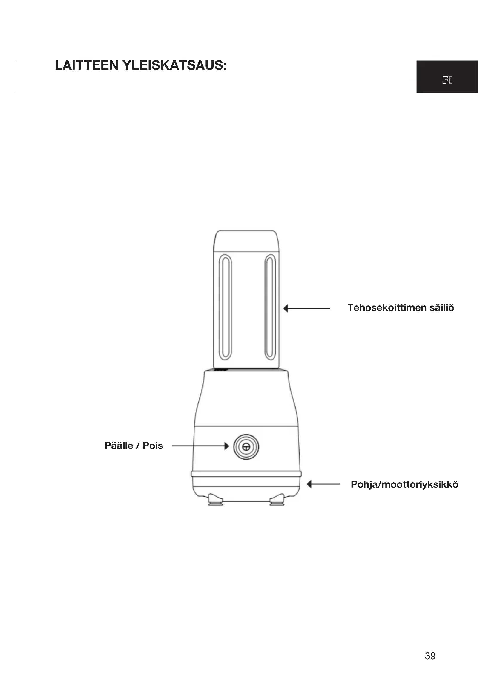 - HUOLTO LAITTEEN YLEISKATSAUS: FIFI Tehosekoittimen säiliö Pohja/moottoriyksikkö Päälle / Pois40 TÄRKEITÄ TURVALLISUUSOHJEITA: TÄRKEÄÄ: Lue ohjeet ja erityisesti turvallisuusohjeet huolellisesti ennen laitteen käyttöä. Säilytä nämä käyttöohjeet ja luovuta ne yhdessä laitteen kanssa, mikäli annat sen eteenpäin. TURVATOIMET YLEISTÄ Tuotteen väärä käyttö voi aiheuttaa henkilövahinkoja ja vahingoittaa laitetta. p. 4639