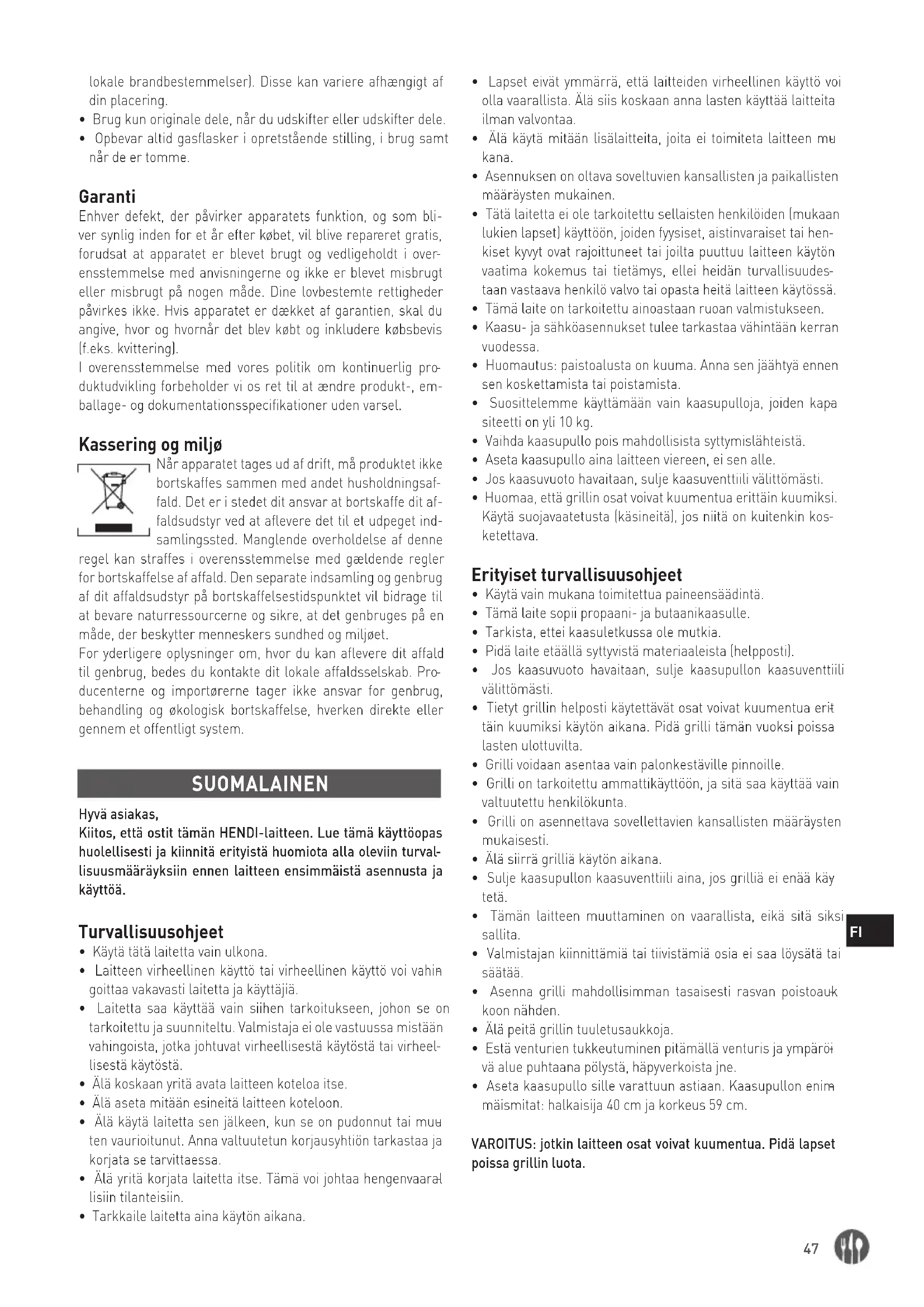 ducenterne og importørerne tager ikke ansvar for genbrug, behandling og økologisk bortskaffelse, hverken direkte eller gennem et offentligt system. SUOMALAINEN Hyvä asiakas, Kiitos, että ostit tämän HENDI-laitteen. Lue tämä käyttöopas huolellisesti ja kiinnitä erityistä huomiota alla oleviin turval