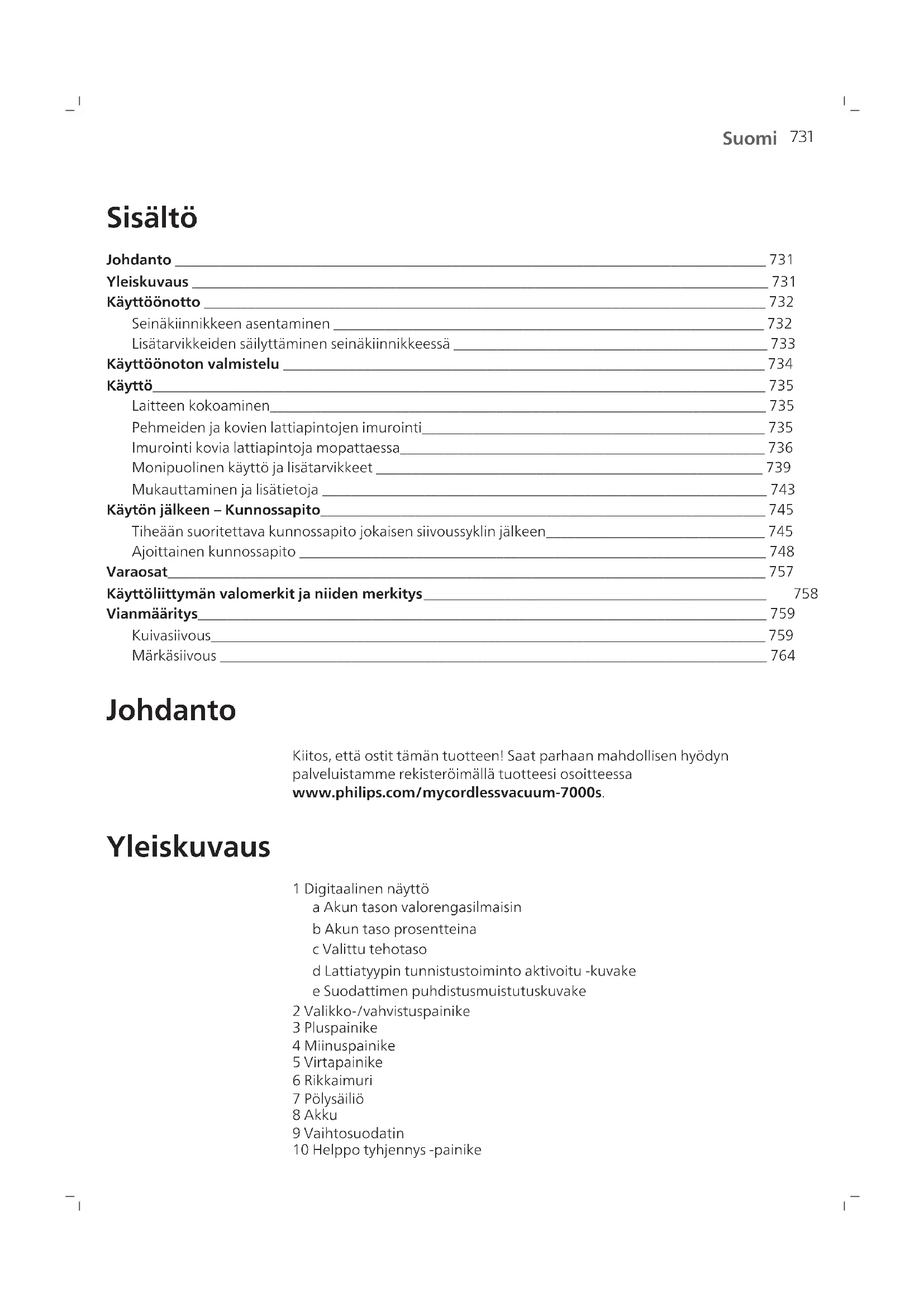 Suomi Suomi Sisältö Johdanto _________________________________________________________________________________ 731 Yleiskuvaus _______________________________________________________________________________ 731 Käyttöönotto _____________________________________________________________________________ 732 Seinäkiinnikkeen asentaminen ___________________________________________________________ 732 Lisätarvikkeiden säilyttäminen seinäkiinnikkeessä ___________________________________________ 733 Käyttöönoton valmistelu __________________________________________________________________ 734 Käyttö____________________________________________________________________________________ 735 Laitteen kokoaminen____________________________________________________________________ 735 Pehmeiden ja kovien lattiapintojen imurointi_______________________________________________ 735 Imurointi kovia lattiapintoja mopattaessa__________________________________________________ 736 Monipuolinen käyttö ja lisätarvikkeet _____________________________________________________ 739 Mukauttaminen ja lisätietoja _____________________________________________________________ 743 Käytön jälkeen – Kunnossapito_____________________________________________________________ 745 Tiheään suoritettava kunnossapito jokaisen siivoussyklin jälkeen______________________________ 745 Ajoittainen kunnossapito ________________________________________________________________ 748 Varaosat__________________________________________________________________________________ 757 Käyttöliittymän valomerkit ja niiden merkitys_______________________________________________ 758 Vianmääritys______________________________________________________________________________ 759 Kuivasiivous____________________________________________________________________________ 759 Märkäsiivous ___________________________________________________________________________ 764 Johdanto Kiitos, että ostit tämän tuotteen! Saat parhaan mahdollisen hyödyn palveluistamme rekisteröimällä tuotteesi osoitteessa www.philips.com/mycordlessvacuum-7000s. Yleiskuvaus 1 Digitaalinen näyttö a Akun tason valorengasilmaisin b Akun taso prosentteina c Valittu tehotaso d Lattiatyypin tunnistustoiminto aktivoitu ‑kuvake e Suodattimen puhdistusmuistutuskuvake 2 Valikko-/vahvistuspainike 3 Pluspainike 4 Miinuspainike 5 Virtapainike 6 Rikkaimuri 7 Pölysäiliö 8 Akku 9 Vaihtosuodatin 10 Helppo tyhjennys ‑painike732 Suomi 11 Pölysäiliön avauspainike 12 Verkkolaite 13 Ruuvit 14 Seinäkiinnike 15 Putki 16 TriActive Smart LED ‑suutin 17 Herkkä lattiaharja (vain XC7067) 18 Vesisäiliö ja mikrokuitumoppityyny (vain XC7163, XC7167) 19 PetPro-suutin 20 Yhdistelmätyökalu 21 Pehmeä harja (vain XC7065, XC7067, XC7167) 22 Verhoilukangassuutin (vain XC7065, XC7067, XC6167) 23 Rakosuutin Käyttöönotto Seinäkiinnikkeen asentaminen 1 Käännä seinäkiinnike ympäri ja avaa harmaa vipu. Aseta latausportti paikalleen niin, että metallinen osa on näkyvissä ja suunnattuna pystyasennossa seinäkiinnikkeen etupuolta kohti. 2 Järjestele kaapeli siististi työntämällä se sille varattuun uraan. 3 Sulje harmaa vipu. Varmista, että harmaa vipu lukittuu napsahtaen paikalleen.733 Suomi 110 ± 2 cm 4 Kiinnitä seinäkiinnike seinällä tukevasti haluamaasi paikkaan niin, että kiinnitysruuvien reiät ovat noin 110 cm:n etäisyydellä lattiasta. Varoitus: Ole varovainen, kun poraat reikiä seinään seinäkiinnikkeen kiinnitystä varten, ettet saa sähköiskua. Huomautus: Varmista, että seinäkiinnike on sijoitettu seinälle niin, että koko laite riippuu seinällä eikä suutin ei kosketa lattiaa. 5 Kun olet määrittänyt optimaalisen paikan ja korkeuden laitteen säilytystä ja lataamista varten, kiristä ruuvit kunnolla seinäkiinnikkeen kiinnittämiseksi paikalleen. Lisätarvikkeiden säilyttäminen seinäkiinnikkeessä Kaikki lisätarvikkeet voidaan säilyttää seinäkiinnikkeessä, lukuun ottamatta PetPro-suuttimen ja verhoilukangassuuttimen yhdistelmää. Huomautus: PetPro-suutinta ja verhoilukangassuutinta ei voi säilyttää seinäkiinnikkeessä yhdessä.734 Suomi Käyttöönoton valmistelu Laitteessa on litiumioniakku. Tyhjän akun lataaminen täyteen kestää noin 6 tuntia. 1 Kiinnitä akku laitteen runkoon ja varmista, että se napsahtaa paikalleen.