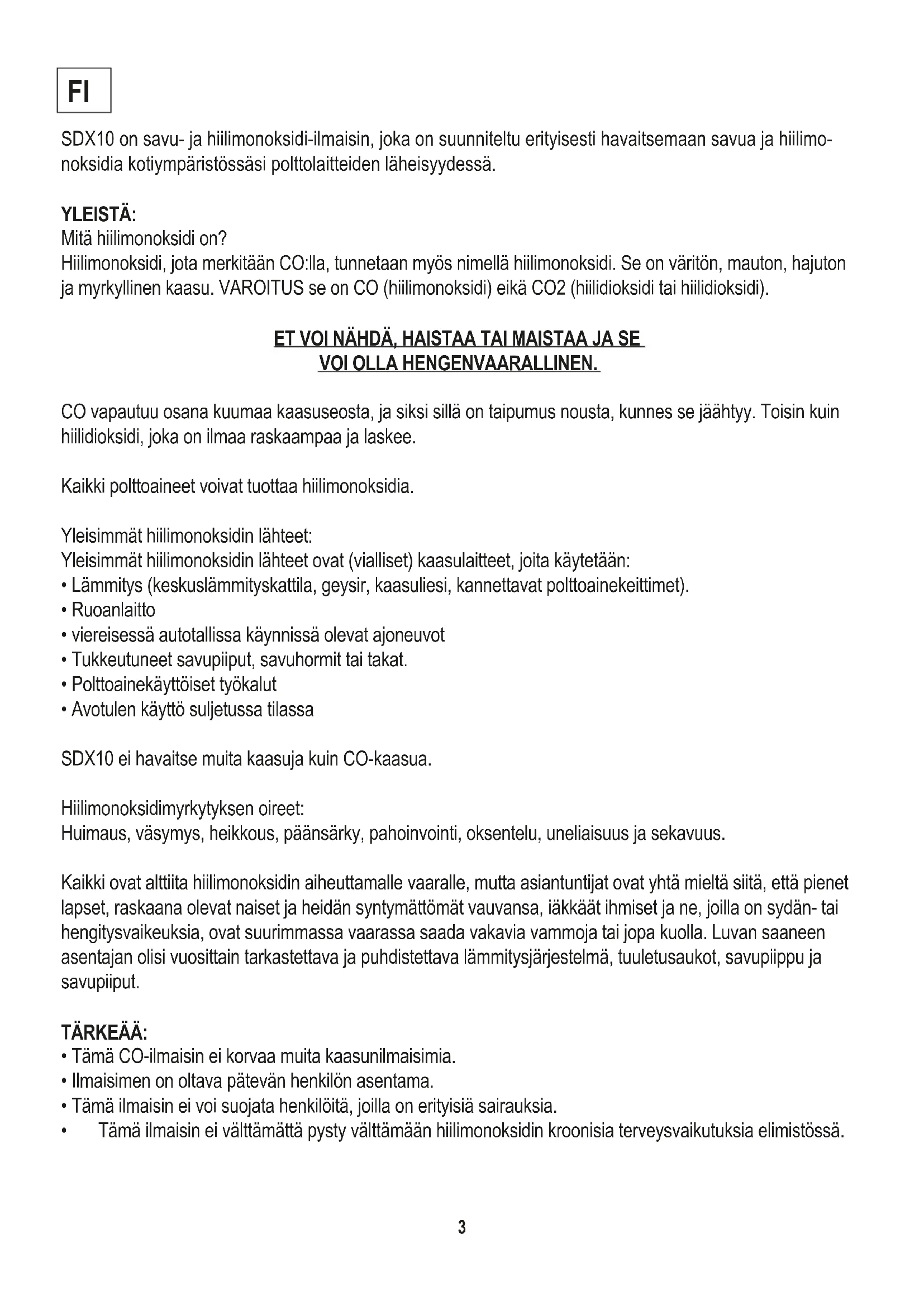 SDX10 on savu- ja hiilimonoksidi-ilmaisin, joka on suunniteltu erityisesti havaitsemaan savua ja hiilimo- noksidia kotiympäristössäsi polttolaitteiden läheisyydessä. YLEISTÄ: Mitä hiilimonoksidi on? Hiilimonoksidi, jota merkitään CO:lla, tunnetaan myös nimellä hiilimonoksidi. Se on väritön, mauton, hajuton ja myrkyllinen kaasu. VAROITUS se on CO (hiilimonoksidi) eikä CO2 (hiilidioksidi tai hiilidioksidi). ET VOI NÄHDÄ, HAISTAA TAI MAISTAA JA SE VOI OLLA HENGENVAARALLINEN. CO vapautuu osana kuumaa kaasuseosta, ja siksi sillä on taipumus nousta, kunnes se jäähtyy. Toisin kuin hiilidioksidi, joka on ilmaa raskaampaa ja laskee. Kaikki polttoaineet voivat tuottaa hiilimonoksidia. Yleisimmät hiilimonoksidin lähteet: Yleisimmät hiilimonoksidin lähteet ovat (vialliset) kaasulaitteet, joita käytetään: