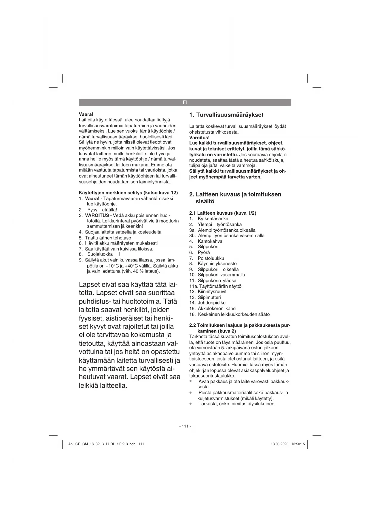 Mittausepätarkkuus K: ............................ 1,5 m/s² Leikkauskorkeuden säätö: ..25-65 mm; 5 asentoa Huomio! Laite toimitetaan ilman akkuja ja latauslaitetta ja sitä saa käyttää ainoastaan Power X-Change -sarjan litiumi-ioniakkujen kera! Power X-Change -sarjan litiumi-ioniakut saa lada- ta vain Power X-Charger -latauslaitteella. Vaara! Melu ja tärinä Melu- ja tärinäarvot on mitattu standardin EN 62841 mukaisesti. Käytä kuulosuojuksia. Melu saattaa aiheuttaa kuulon menetyksen. Tärinän kokonaisarvot (vektorisumma kolmesta suunnasta) mitattu standardin EN 62841 mukai- sesti. Annetut tärinän kokonaispäästöarvot ja annetut melunpäästöarvot on mitattu normitetulla koes- tusmenetelmällä ja niitä voidaan käyttää sähköty- ökalun vertaamiseksi toiseen sähkötyökaluun. Anl_GE_CM_18_32_C_Li_BL_SPK13.indb 112Anl_GE_CM_18_32_C_Li_BL_SPK13.indb 112 13.05.2025 13:50:1513.05.2025 13:50:15FI