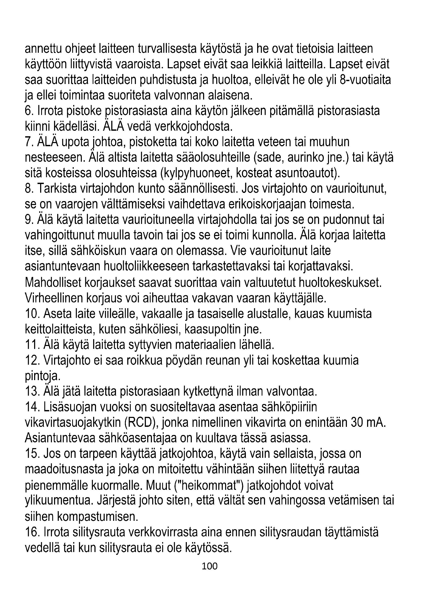 joilla on heikentynyt fyysinen, aistillinen tai henkinen toimintakyky, tai henkilöt, joilla ei ole kokemusta tai tietoa laitteesta, jos tämä tapahtuu heidän turvallisuudestaan vastaavan henkilön valvonnassa tai jos heille on100 annettu ohjeet laitteen turvallisesta käytöstä ja he ovat tietoisia laitteen käyttöön liittyvistä vaaroista. Lapset eivät saa leikkiä laitteilla. Lapset eivät saa suorittaa laitteiden puhdistusta ja huoltoa, elleivät he ole yli 8-vuotiaita ja ellei toimintaa suoriteta valvonnan alaisena.