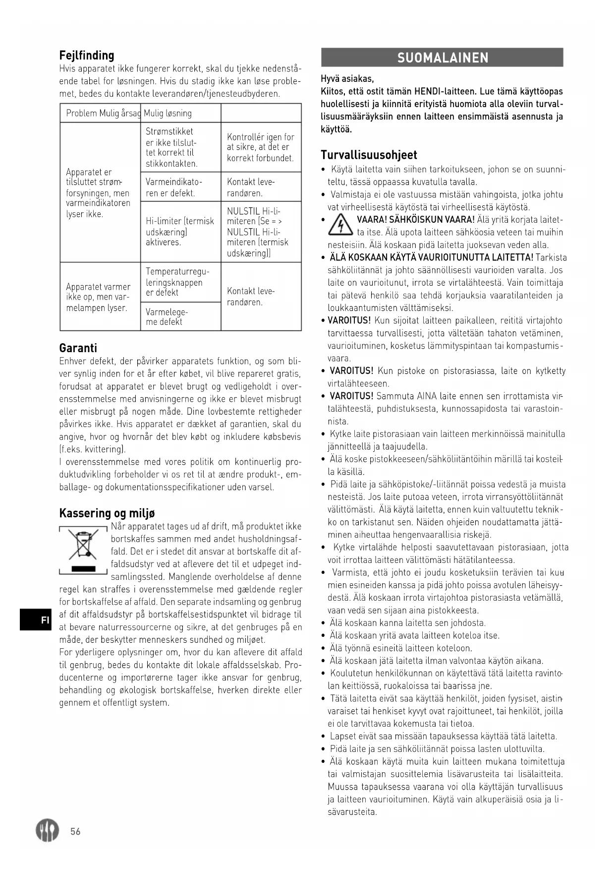 ducenterne og importørerne tager ikke ansvar for genbrug, behandling og økologisk bortskaffelse, hverken direkte eller gennem et offentligt system. SUOMALAINEN Hyvä asiakas, Kiitos, että ostit tämän HENDI-laitteen. Lue tämä käyttöopas huolellisesti ja kiinnitä erityistä huomiota alla oleviin turval