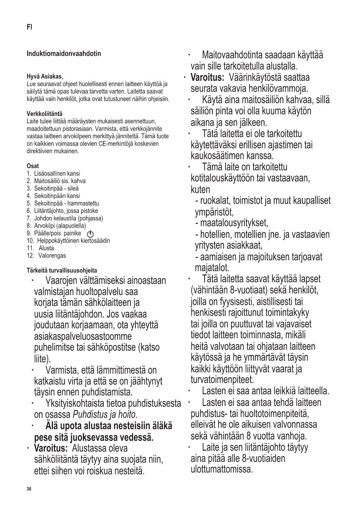 Tärkeitä turvallisuusohjeita ∙ Vaarojen välttämiseksi ainoastaan valmistajan huoltopalvelu saa korjata tämän sähkölaitteen ja uusia liitäntäjohdon. Jos vaakaa joudutaan korjaamaan, ota yhteyttä asiakaspalveluosastoomme puhelimitse tai sähköpostitse (katso liite). ∙ Varmista, että lämmittimestä on katkaistu virta ja että se on jäähtynyt täysin ennen puhdistamista. ∙ Yksityiskohtaista tietoa puhdistuksesta on osassa Puhdistus ja hoito. ∙ Älä upota alustaa nesteisiin äläkä pese sitä juoksevassa vedessä. ∙ Varoitus: Alustassa oleva sähköliitäntä täytyy aina suojata niin, ettei siihen voi roiskua nesteitä. ∙ Maitovaahdotinta saadaan käyttää vain sille tarkoitetulla alustalla. ∙ Varoitus: Väärinkäytöstä saattaa seurata vakavia henkilövammoja. ∙ Käytä aina maitosäiliön kahvaa, sillä säiliön pinta voi olla kuuma käytön aikana ja sen jälkeen. ∙ Tätä laitetta ei ole tarkoitettu käytettäväksi erillisen ajastimen tai kaukosäätimen kanssa. ∙ Tämä laite on tarkoitettu kotitalouskäyttöön tai vastaavaan, kuten - ruokalat, toimistot ja muut kaupalliset ympäristöt, - maatalousyritykset, - hotellien, motellien jne. ja vastaavien yritysten asiakkaat, - aamiaisen ja majoituksen tarjoavat majatalot. ∙ Tätä laitetta saavat käyttää lapset (vähintään 8-vuotiaat) sekä henkilöt, joilla on fyysisesti, aistillisesti tai henkisesti rajoittunut toimintakyky tai joilla on puuttuvat tai vajavaiset tiedot laitteen toiminnasta, mikäli heitä valvotaan tai ohjataan laitteen käytössä ja he ymmärtävät täysin kaikki käyttöön liittyvät vaarat ja turvatoimenpiteet. ∙ Lasten ei saa antaa leikkiä laitteella. ∙ Lasten ei saa antaa tehdä laitteen puhdistus- tai huoltotoimenpiteitä, elleivät he ole aikuisen valvonnassa sekä vähintään 8 vuotta vanhoja. ∙ Laite ja sen liitäntäjohto täytyy aina pitää alle 8-vuotiaiden ulottumattomissa. FI37 142 x 208 mm ∙ Varoitus: Pidä lapset poissa pakkausmateriaalien luota potentiaalisen vaaratilanteen esim. tukehtumisvaaran vuoksi. ∙ Tarkasta aina ennen laitteen käyttöä huolellisesti laitteen runko, liitäntäjohto ja mahdolliset asennetut lisäosat vaurioiden varalta. Jos laite on esimerkiksi pudonnut kovalle pinnalle tai liitäntäjohdon vetämiseen on käytetty liikaa voimaa, laitetta ei saa enää käyttää: näkymättömätkin vauriot voivat aiheuttaa laitetta käytettäessä vaaratilanteita. ∙ Tämä laite on tarkoitettu ainoastaan maidon, kuumien kaakaojuomien ja kaakaoiden. Älä laita säiliöön mitään muita nesteitä eikä kiinteitä ruokia. ∙ Älä jätä maitovaahdotinta ilman valvontaa käytön aikana. ∙ Huomioi aina säiliön sisällä olevat minimi- ja maksimitason merkit kaikenlaisessa käytössä. ∙ Maidon täytyy peittää säiliön alaosassa oleva kohouma (min.-tason merkki). Ellei maitoa ole riittävästi, laite saattaa ylikuumentua. ∙ Varoitus: Säiliön liiallinen täyttäminen voi aiheuttaa vaaran, jos vaahtoavaa maitoa purkautuu ulos. ∙ Varoitus: Kannen tulee olla aina paikallaan käytön aikana. ∙ Älä peitä takapuolella olevia ilmanvaihtoaukkoja. ∙ Laitetta saadaan käyttää vain valmistajan toimittamien alkuperäisten lisävarusteiden kanssa. ∙ Laite on asetettava aina kiinteälle, tasaiselle pinnalle. ∙ Varo, ettei liitäntäjohto tai kannu kosketa avoliekkiä tai kuumia pintoja (esim. lieden keittolevyjä). ∙ Älä jätä liitäntäjohtoa roikkumaan äläkä anna sen koskettaa kuumia osia. ∙ Irrota pistotulppa pistorasiasta aina - jos laitteessa on käyttöhäiriö, - käytön jälkeen, - ennen laitteen puhdistamista. ∙ Kun irrotat pistotulpan pistorasiasta, älä vedä liitäntäjohdosta vaan tartu aina pistotulppaan. ∙ Jos laite vahingoittuu väärinkäytön seurauksena tai siksi, että annettuja ohjeita ei ole noudatettu, valmistaja ei vastaa aiheutuneista vahingoista. Ennen ensimmäistä käyttöä ∙ Poista kaikki pakkausmateriaalit ja -tarrat ennen laitteen ensimmäistä käyttökertaa, ja tarkista, ettei mitään osia puutu. ∙ Ennen kuin laitetta käytetään ensimmäistä kertaa tai jos sitä ei ole käytetty pitkään aikaan, se on puhdistettava huolellisesti jaksossa Puhdistus ja hoito kuvatulla tavalla. Liitäntäjohdon säilytys ∙ Jalustassa on liitäntäjohdolle säilytystila. ∙ Kelaa johto auki haluttuun pituuteen ennen käyttöä. ∙ Kelaa johto säilytystilaan jälleen käytön jälkeen. Käyttö Kansi ∙ Kannen tulee olla aina paikallaan käytön aikana. ∙ Voit lisätä aineksia käytön aikana kääntämällä kansiosaa ja irrottamalla sen. ∙ Sileä sekoitintyökalu voidaan asentaa säilytystä varten kansiosaan. Valorengas Punainen Lämmityksen sisältävä toiminto on valittu. Sininen Toiminto ilman lämmitystä on valittu. Tasaisesti palava valo Valmistelu on käynnissä. Vilkkuva punainen tai sininen Laite odottaa valintaa, valmistelu on valmis tai on tapahtunut virhe (katso Vianetsintä ohjeiden lopusta). Sekoitintyökalun valinta Käytettävissä on seuraavat sekoitintyökalut: è sileä è hammastettu