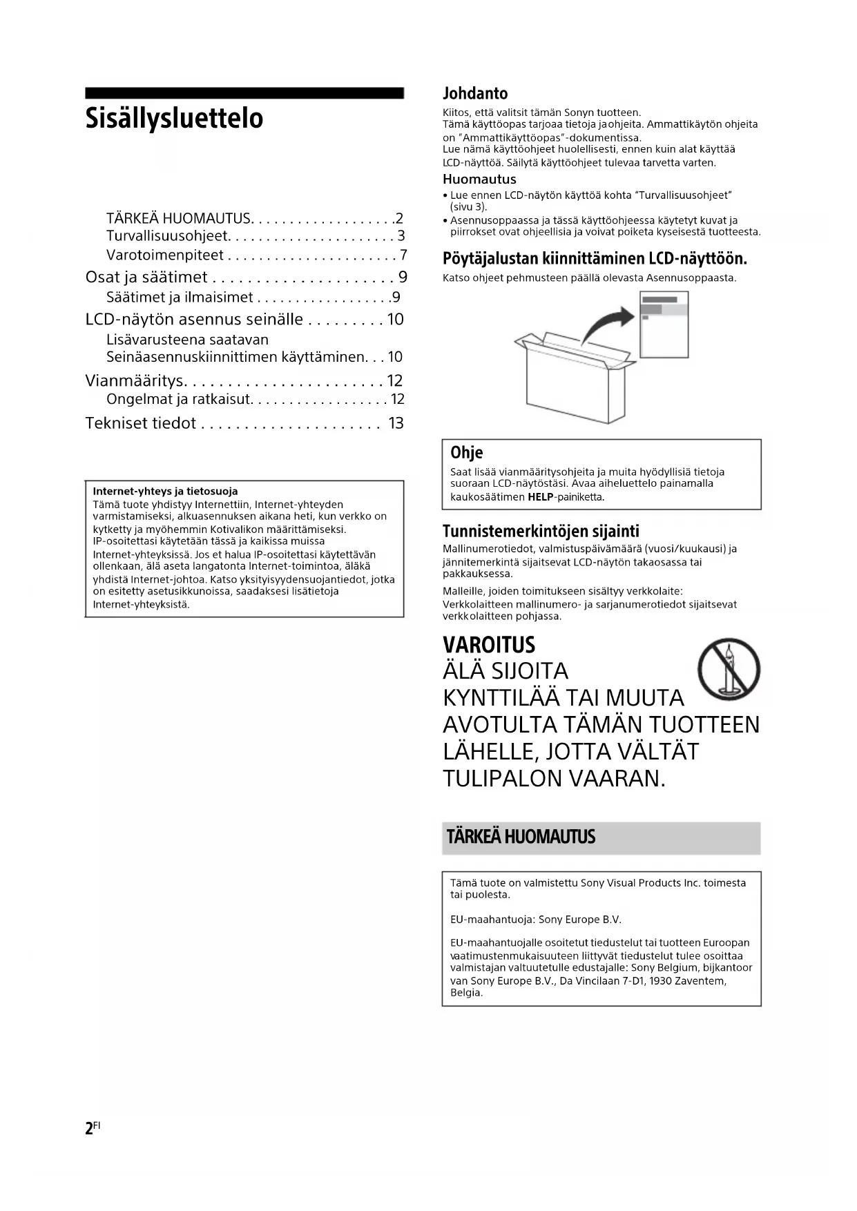- Tekniset tiedot Johdanto Kiitos, että valitsit tämän Sonyn tuotteen.Tämä käyttöopas tarjoaa tietoja ja ohjeita. Ammattikäytön ohjeita on ”Ammattikäyttöopas”-dokumentissa.Lue nämä käyttöohjeet huolellisesti, ennen kuin alat käyttää CD-näyttöä. Säilytä käyttöohjeet tulevaa tarvetta varten.Huomautus• Lue ennen LCD-näytön käyttöä kohta “Turvallisuusohjeet” (sivu 3).• Asennusoppaassa ja tässä käyttöohjeessa käytetyt kuvat ja piirrokset ovat ohjeellisia ja voivat poiketa kyseisestä tuotteesta. Pöytäjalustan kiinnittäminen LCD-näyttöön. Katso ohjeet pehmusteen päällä olevasta Asennusoppaasta. Tunnistemerkintöjen sijainti Mallinumerotiedot, valmistuspäivämäärä (vuosi/kuukausi) ja jännitemerkintä sijaitsevat LCD-näytön takaosassa tai pakkauksessa.Malleille, joiden toimitukseen sisältyy verkkolaite:Verkkolaitteen mallinumero- ja sarjanumerotiedot sijaitsevat verkkolaitteen pohjassa. VAROITUS ÄLÄ SIJOITA p. 13