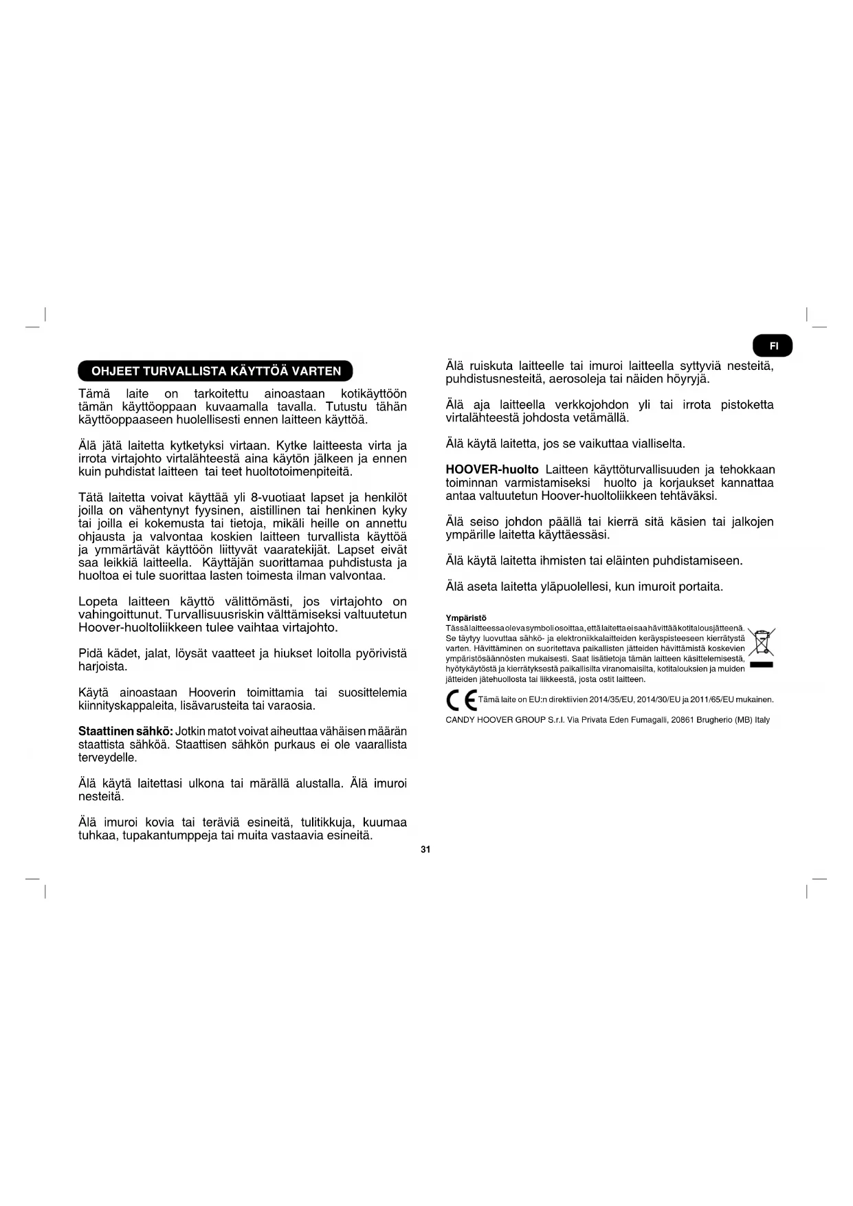 Tämä laite on tarkoitettu ainoastaan kotikäyttöön tämän käyttöoppaan kuvaamalla tavalla. Tutustu tähän käyttöoppaaseen huolellisesti ennen laitteen käyttöä. Älä jätä laitetta kytketyksi virtaan. Kytke laitteesta virta ja irrota virtajohto virtalähteestä aina käytön jälkeen ja ennen kuin puhdistat laitteen tai teet huoltotoimenpiteitä. Tätä laitetta voivat käyttää yli 8-vuotiaat lapset ja henkilöt joilla on vähentynyt fyysinen, aistillinen tai henkinen kyky tai joilla ei kokemusta tai tietoja, mikäli heille on annettu ohjausta ja valvontaa koskien laitteen turvallista käyttöä ja ymmärtävät käyttöön liittyvät vaaratekijät. Lapset eivät saa leikkiä laitteella. Käyttäjän suorittamaa puhdistusta ja huoltoa ei tule suorittaa lasten toimesta ilman valvontaa. Lopeta laitteen käyttö välittömästi, jos virtajohto on vahingoittunut. Turvallisuusriskin välttämiseksi valtuutetun Hoover-huoltoliikkeen tulee vaihtaa virtajohto. Pidä kädet, jalat, löysät vaatteet ja hiukset loitolla pyörivistä harjoista. Käytä ainoastaan Hooverin toimittamia tai suosittelemia kiinnityskappaleita, lisävarusteita tai varaosia. Staattinen sähkö: Jotkin matot voivat aiheuttaa vähäisen määrän staattista sähköä. Staattisen sähkön purkaus ei ole vaarallista terveydelle. Älä käytä laitettasi ulkona tai märällä alustalla. Älä imuroi nesteitä. Älä imuroi kovia tai teräviä esineitä, tulitikkuja, kuumaa tuhkaa, tupakantumppeja tai muita vastaavia esineitä. Älä ruiskuta laitteelle tai imuroi laitteella syttyviä nesteitä, puhdistusnesteitä, aerosoleja tai näiden höyryjä. Älä aja laitteella verkkojohdon yli tai irrota pistoketta virtalähteestä johdosta vetämällä. Älä käytä laitetta, jos se vaikuttaa vialliselta. HOOVER-huolto Laitteen käyttöturvallisuuden ja tehokkaan toiminnan varmistamiseksi huolto ja korjaukset kannattaa antaa valtuutetun Hoover-huoltoliikkeen tehtäväksi. Älä seiso johdon päällä tai kierrä sitä käsien tai jalkojen ympärille laitetta käyttäessäsi. Älä käytä laitetta ihmisten tai eläinten puhdistamiseen. Älä aseta laitetta yläpuolellesi, kun imuroit portaita. Ympäristö Tässä laitteessa oleva symboli osoittaa, että laitetta ei saa hävittää kotitalousjätteenä. Se täytyy luovuttaa sähkö- ja elektroniikkalaitteiden keräyspisteeseen kierrätystä varten. Hävittäminen on suoritettava paikallisten jätteiden hävittämistä koskevien ympäristösäännösten mukaisesti. Saat lisätietoja tämän laitteen käsittelemisestä, hyötykäytöstä ja kierrätyksestä paikallisilta viranomaisilta, kotitalouksien ja muiden jätteiden jätehuollosta tai liikkeestä, josta ostit laitteen. Tämä laite on EU:n direktiivien 2014/35/EU, 2014/30/EU ja 2011/65/EU mukainen. CANDY HOOVER GROUP S.r.l. Via Privata Eden Fumagalli, 20861 Brugherio (MB) Italy FILAITTEEN KOKOAMINEN Pura kaikki osat pakkauksesta.