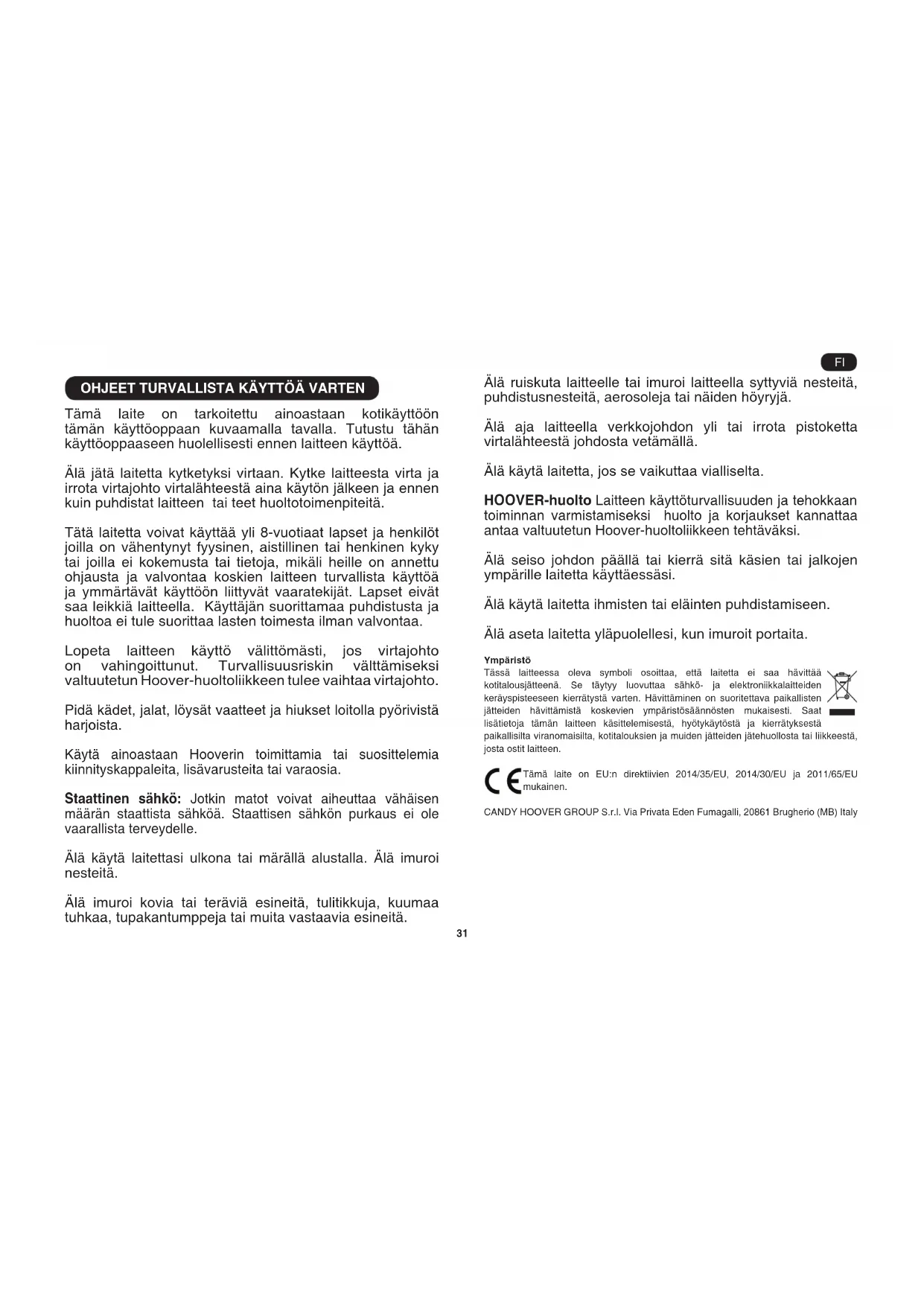 Tämä laite on tarkoitettu ainoastaan kotikäyttöön tämän käyttöoppaan kuvaamalla tavalla. Tutustu tähän käyttöoppaaseen huolellisesti ennen laitteen käyttöä. Älä jätä laitetta kytketyksi virtaan. Kytke laitteesta virta ja irrota virtajohto virtalähteestä aina käytön jälkeen ja ennen kuin puhdistat laitteen tai teet huoltotoimenpiteitä. Tätä laitetta voivat käyttää yli 8-vuotiaat lapset ja henkilöt joilla on vähentynyt fyysinen, aistillinen tai henkinen kyky tai joilla ei kokemusta tai tietoja, mikäli heille on annettu ohjausta ja valvontaa koskien laitteen turvallista käyttöä ja ymmärtävät käyttöön liittyvät vaaratekijät. Lapset eivät saa leikkiä laitteella. Käyttäjän suorittamaa puhdistusta ja huoltoa ei tule suorittaa lasten toimesta ilman valvontaa. Lopeta laitteen käyttö välittömästi, jos virtajohto on vahingoittunut. Turvallisuusriskin välttämiseksi valtuutetun Hoover-huoltoliikkeen tulee vaihtaa virtajohto. Pidä kädet, jalat, löysät vaatteet ja hiukset loitolla pyörivistä harjoista. Käytä ainoastaan Hooverin toimittamia tai suosittelemia kiinnityskappaleita, lisävarusteita tai varaosia. Staattinen sähkö: Jotkin matot voivat aiheuttaa vähäisen määrän staattista sähköä. Staattisen sähkön purkaus ei ole vaarallista terveydelle. Älä käytä laitettasi ulkona tai märällä alustalla. Älä imuroi nesteitä. Älä imuroi kovia tai teräviä esineitä, tulitikkuja, kuumaa tuhkaa, tupakantumppeja tai muita vastaavia esineitä. Älä ruiskuta laitteelle tai imuroi laitteella syttyviä nesteitä, puhdistusnesteitä, aerosoleja tai näiden höyryjä. Älä aja laitteella verkkojohdon yli tai irrota pistoketta virtalähteestä johdosta vetämällä. Älä käytä laitetta, jos se vaikuttaa vialliselta. HOOVER-huolto Laitteen käyttöturvallisuuden ja tehokkaan toiminnan varmistamiseksi huolto ja korjaukset kannattaa antaa valtuutetun Hoover-huoltoliikkeen tehtäväksi. Älä seiso johdon päällä tai kierrä sitä käsien tai jalkojen ympärille laitetta käyttäessäsi. Älä käytä laitetta ihmisten tai eläinten puhdistamiseen. Älä aseta laitetta yläpuolellesi, kun imuroit portaita. Ympäristö Tässä laitteessa oleva symboli osoittaa, että laitetta ei saa hävittää kotitalousjätteenä. Se täytyy luovuttaa sähkö- ja elektroniikkalaitteiden keräyspisteeseen kierrätystä varten. Hävittäminen on suoritettava paikallisten jätteiden hävittämistä koskevien ympäristösäännösten mukaisesti. Saat lisätietoja tämän laitteen käsittelemisestä, hyötykäytöstä ja kierrätyksestä paikallisilta viranomaisilta, kotitalouksien ja muiden jätteiden jätehuollosta tai liikkeestä, josta ostit laitteen. Tämä laite on EU:n direktiivien 2014/35/EU, 2014/30/EU ja 2011/65/EU mukainen. CANDY HOOVER GROUP S.r.l. Via Privata Eden Fumagalli, 20861 Brugherio (MB) Italy FI*Vain joissakin malleissa ** Vain joissakin malleissa, suulakkeet saattavat vaihdella mallista riippuen