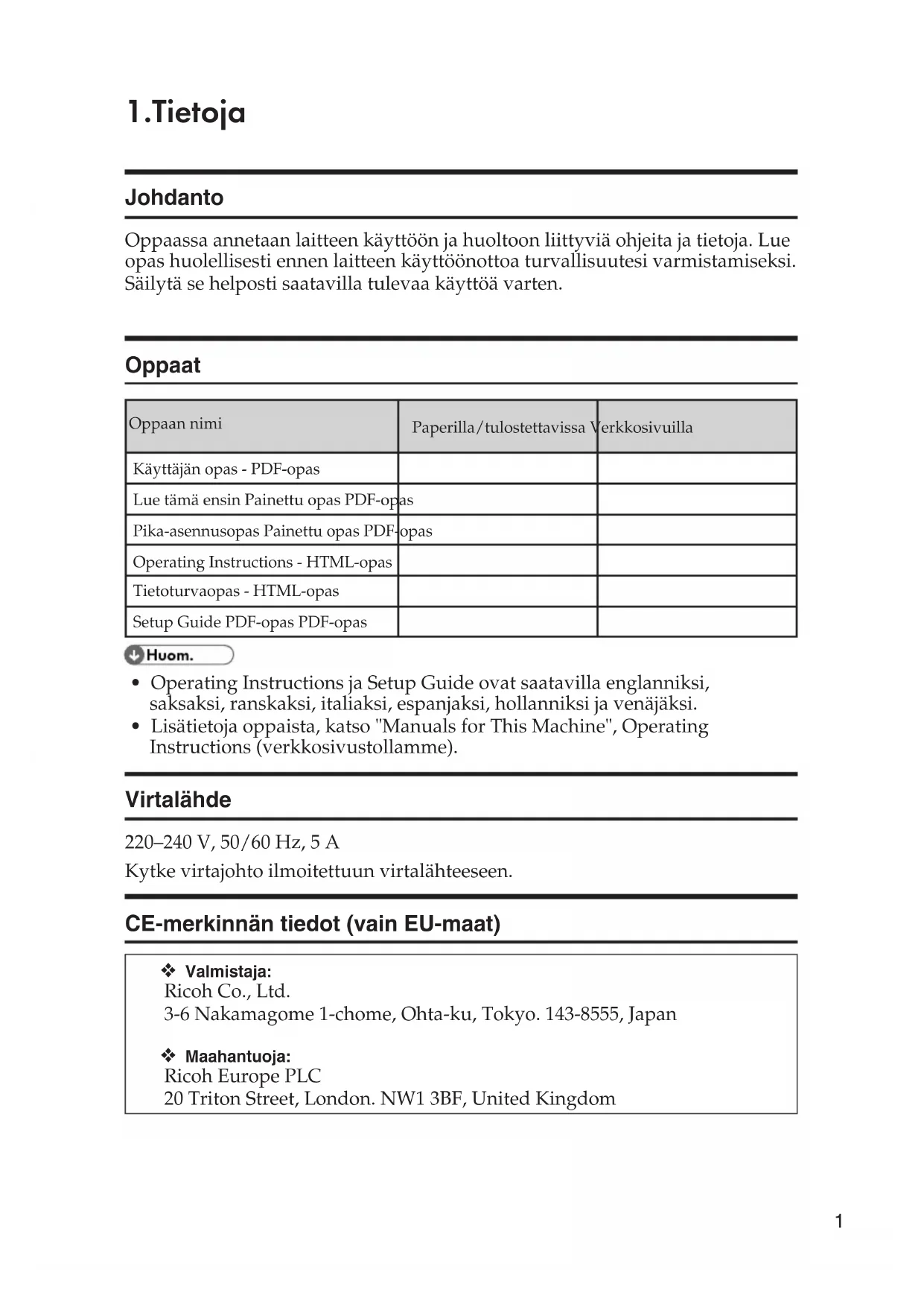 - Lisätietoja oppaista, katso "Manuals for This Machine", Operating Instructions (verkkosivustollamme). Virtalähde 220–240 V, 50/60 Hz, 5 A Kytke virtajohto ilmoitettuun virtalähteeseen. CE-merkinnän tiedot (vain EU-maat) ❖ Valmistaja: Ricoh Co., Ltd. 3-6 Nakamagome 1-chome, Ohta-ku, Tokyo. 143-8555, Japan ❖ Maahantuoja: Ricoh Europe PLC 20 Triton Street, London. NW1 3BF, United Kingdom2 Vastuuvapauslauseke Laitevalmistaja ei vastaa vahingoista, jotka aiheutuvat tämän laitteen virheestä, tallennetun tiedon menetyksestä tai laitteen ja sen mukana toimitettujen käyttöoppaiden käytöstä tai käyttämättä jättämisestä. Varmista, että sinulla on aina varmuuskopio laitteelle tallennetuista tiedoista. Asiakirjoja tai tietoa voi kadota, jos laitteeseen tulee virhe tai vikatila. Valmistaja ei vastaa laitteella luoduista asiakirjoista tai käyttäjien tiedoista. Huomautuksia Hyvän tulostuslaadun varmistamiseksi suosittelemme valmistajan alkuperäisen väriaineen käyttämistä. Emme vastaa vahingoista tai kustannuksista, jotka aiheutuvat muiden kuin valmistajan alkuperäisten varaosien käytöstä.3 2.Laitteen turvallisuusmerkinnät Laitteen turvallisuusmerkintöjen merkitykset: Varoitus Varoitus, kuuma pinta Ei saa koskea Älä heitä tuleen Älä käytä imuria Pidä lasten ulottumattomissa Kielletty Yleinen pakollisen toiminnan merkki Huomio: sähköherkkä laite4 3.Turvallisuustiedot Käyttöturvallisuus Ohjeessa käytetään seuraavia symboleja: R VAROITUS:Mahdollinen vaaratilanne, joka saattaa aiheuttaa kuoleman tai vakavan henkilövahingon, jos ohjeita ei noudateta. R TÄRKEÄÄ:Mahdollinen vaaratilanne, joka saattaa aiheuttaa lievän tai vakavahkon henkilö- tai omaisuusvahingon, jos ohjeita ei noudateta. Laitteen käyttöympäristö R VAROITUS: