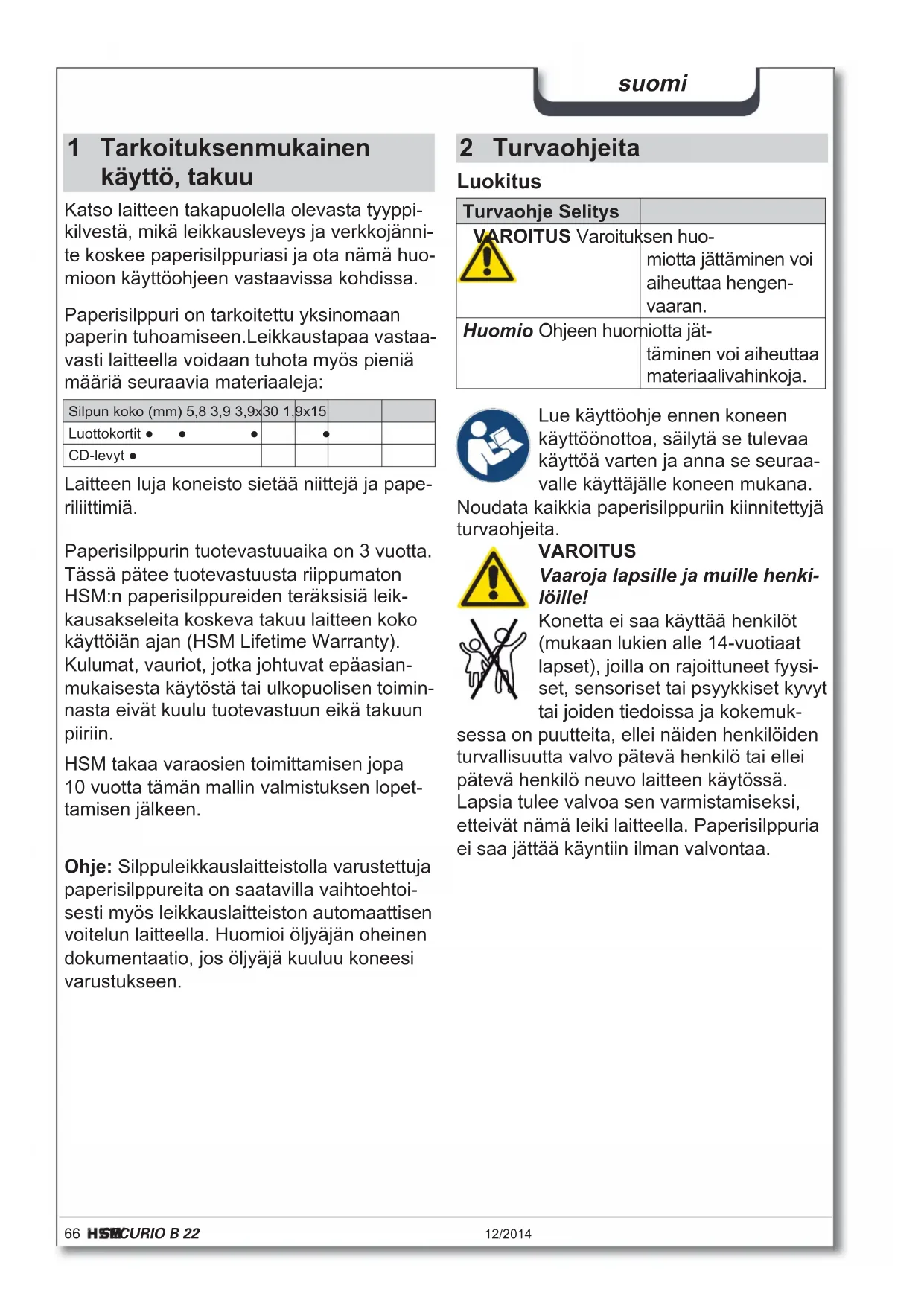 - RoHS-direk v 2011/65/EU EU-deklara on om överensstämmelse kan beställas hos llverkaren.66 SECURIO B 22 12/2014 suomi 2 Turvaohjeita Luokitus Turvaohje Selitys VAROITUS Varoituksen huo- miotta jättäminen voi aiheuttaa hengen- vaaran. Huomio Ohjeen huomiotta jät- täminen voi aiheuttaa materiaalivahinkoja. Lue käyttöohje ennen koneen käyttöönottoa, säilytä se tulevaa käyttöä varten ja anna se seuraa- valle käyttäjälle koneen mukana. Noudata kaikkia paperisilppuriin kiinnitettyjä turvaohjeita. VAROITUS Vaaroja lapsille ja muille henki- löille! Konetta ei saa käyttää henkilöt (mukaan lukien alle 14-vuotiaat lapset), joilla on rajoittuneet fyysi- set, sensoriset tai psyykkiset kyvyt tai joiden tiedoissa ja kokemuk- sessa on puutteita, ellei näiden henkilöiden turvallisuutta valvo pätevä henkilö tai ellei pätevä henkilö neuvo laitteen käytössä. Lapsia tulee valvoa sen varmistamiseksi, etteivät nämä leiki laitteella. Paperisilppuria ei saa jättää käyntiin ilman valvontaa. 1 Tarkoituksenmukainen käyttö, takuu Katso laitteen takapuolella olevasta tyyppi- kilvestä, mikä leikkausleveys ja verkkojänni- te koskee paperisilppuriasi ja ota nämä huo- mioon käyttöohjeen vastaavissa kohdissa. Paperisilppuri on tarkoitettu yksinomaan paperin tuhoamiseen.Leikkaustapaa vastaa- vasti laitteella voidaan tuhota myös pieniä määriä seuraavia materiaaleja: Silpun koko (mm) 5,8 3,9 3,9x30 1,9x15 Luottokortit ●● ● ● CD-levyt ● Laitteen luja koneisto sietää niittejä ja pape- riliittimiä. Ohje: Silppuleikkauslaitteistolla varustettuja paperisilppureita on saatavilla vaihtoehtoi- sesti myös leikkauslaitteiston automaattisen voitelun laitteella. Huomioi öljyäjän oheinen dokumentaatio, jos öljyäjä kuuluu koneesi varustukseen. Paperisilppurin tuotevastuuaika on 3 vuotta. Tässä pätee tuotevastuusta riippumaton HSM:n paperisilppureiden teräksisiä leik- kausakseleita koskeva takuu laitteen koko käyttöiän ajan (HSM Lifetime Warranty). Kulumat, vauriot, jotka johtuvat epäasian- mukaisesta käytöstä tai ulkopuolisen toimin- nasta eivät kuulu tuotevastuun eikä takuun piiriin. HSM takaa varaosien toimittamisen jopa 10 vuotta tämän mallin valmistuksen lopet- tamisen jälkeen.12/2014 SECURIO B 22 67 suomi VAROITUS Vaarallinen verkkojännite! Koneen vääränlainen käsittely voi aiheuttaa sähköiskun. – Tarkasta ennen verkkopistokkeen pai- kalleen asettamista, että sähköverkon jännite ja taajuus vastaavat tyyppikilven tietoja. – Huomioi, että verkkopistokkeeseen pää- see helposti käsiksi. – Vältä veden joutumista paperisilppuriin. Älä upota verkkojohtoa tai verkkopistoket- ta veteen. – Älä koske verkkopistokkeeseen kosteilla käsillä. – Älä koskaan irrota verkkopistoketta pis- torasiasta vetämällä johdosta, vaan tartu aina verkkopistokkeeseen. – Käytä laitetta ainoastaan kuivissa sisäti- loissa. Älä käytä sitä kosteissa tiloissa tai sateessa. Tarkasta laitteen ja johdon vauriot säännöllisesti. Katkaise paperi- silppurista virta, jos siinä on vauri- oita tai jos se toimii epäasianmu- kaisesti, sekä kun vaihdat sen paikkaa tai puhdistat sitä, irrota verkkopistoke. – Älä vie laitetta, verkkopistoketta tai verk- kojohtoa avotulen tai kuumien pintojen lähettyville. Tuuletusrakoja ei saa peittää. Rakojen ja seinän tai huonekalujen välis- sä täytyy olla vähintään 5 cm:n väli. Ainoastaan HSM-asiakaspalvelu ja sopimuskumppaniemme huolto- asentajat saavat tehdä huoltotöitä, jotka edellyttävät katteiden irrotta- mista kotelosta. Asiakaspalvelun osoitteet sivulla 160. Huomio Väärinkäyttö aiheuttaa vaaran Käytä konetta ainoastaan ”Määräystenmukai- nen käyttö”-kappaleessa mainitulla tavalla. VAROITUS Loukkaantumisvaara! Älä kosketa paperinsyöttöaukon rakoa. Loukkaantumisvaara sisäänve- dosta! Älä päästä hiuksia, löysiä vaattei- ta, kravatteja, huiveja, kaula- tai ranneketjuja tms. syöttöaukon lähelle. Älä silppua mitään ma- teriaalia, jolla on taipumus muo- dostaa silmukoita, esim. hihnoja, naruja, kalvoja jne. Loukkaantumisvaara sirpaleista! Käytä suojalaseja kun silppuat CD-levyjä tai kovia luottokortteja.68 SECURIO B 22 12/2014 suomi 3 Yleiskatsaus Käyttö- ja näyttölaitteet PeruutuspainikeNäytöt:Säiliö täynnäLeikkauskoneiston tukosSäiliö auki KäyttövalmisKäyttöpainikkeet 4 Toimituksen sisältö Lisätarvikkeet