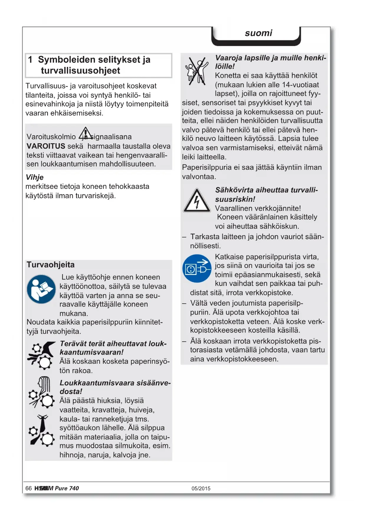 Vikt 50 kg 56 kg Skärhastighet 70 mm/s 60 mm/s Inmatningsbredd 400 mm Anslutning 230 V, 50 Hz 120 V, 60 Hz 220 V, 60 Hz Effektbehov vid max. arkantal 590 W Driftsätt Ständig körning Omgivningsförhållande för drift: Temperatur Relative luftfuktighet Höjd över havet -10 °C till +25 °C max. 90 %, ej kondenserande max. 2 000 m Mått B x D x H (mm) 620 x 487 x 889 Behållarens volym 145 l Emissionsljudtrycksnivå (tomgång / last) 56 dB(A) / 59-63 dB(A)66 HSM Pure 740 05/2015 suomi 1 Symboleiden selitykset ja turvallisuusohjeet Turvallisuus- ja varoitusohjeet koskevat tilanteita, joissa voi syntyä henkilö- tai esinevahinkoja ja niistä löytyy toimenpiteitä vaaran ehkäisemiseksi. Vihje merkitsee tietoja koneen tehokkaasta käytöstä ilman turvariskejä. Varoituskolmio ja signaalisana VAROITUS sekä harmaalla taustalla oleva teksti viittaavat vaikean tai hengenvaaralli- sen loukkaantumisen mahdollisuuteen. Turvaohjeita Lue käyttöohje ennen koneen käyttöönottoa, säilytä se tulevaa käyttöä varten ja anna se seu- raavalle käyttäjälle koneen mukana. Noudata kaikkia paperisilppuriin kiinnitet- tyjä turvaohjeita. Terävät terät aiheuttavat louk- kaantumisvaaran! Älä koskaan kosketa paperinsyö- tön rakoa. Loukkaantumisvaara sisäänve- dosta! Älä päästä hiuksia, löysiä vaatteita, kravatteja, huiveja, kaula- tai ranneketjuja tms. syöttöaukon lähelle. Älä silppua mitään materiaalia, jolla on taipu- mus muodostaa silmukoita, esim. hihnoja, naruja, kalvoja jne. Vaaroja lapsille ja muille henki- löille! Konetta ei saa käyttää henkilöt (mukaan lukien alle 14-vuotiaat lapset), joilla on rajoittuneet fyy- siset, sensoriset tai psyykkiset kyvyt tai joiden tiedoissa ja kokemuksessa on puut- teita, ellei näiden henkilöiden turvallisuutta valvo pätevä henkilö tai ellei pätevä hen- kilö neuvo laitteen käytössä. Lapsia tulee valvoa sen varmistamiseksi, etteivät nämä leiki laitteella. Paperisilppuria ei saa jättää käyntiin ilman valvontaa. Sähkövirta aiheuttaa turvalli- suusriskin! Vaarallinen verkkojännite! Koneen vääränlainen käsittely voi aiheuttaa sähköiskun. – Tarkasta laitteen ja johdon vauriot sään- nöllisesti. Katkaise paperisilppurista virta, jos siinä on vaurioita tai jos se toimii epäasianmukaisesti, sekä kun vaihdat sen paikkaa tai puh- distat sitä, irrota verkkopistoke. – Vältä veden joutumista paperisilp- puriin. Älä upota verkkojohtoa tai verkkopistoketta veteen. Älä koske verk- kopistokkeeseen kosteilla käsillä. – Älä koskaan irrota verkkopistoketta pis- torasiasta vetämällä johdosta, vaan tartu aina verkkopistokkeeseen.05/2015 HSM Pure 740 67 suomi 2 Tarkoituksenmukainen käyttö, takuu Paperisilppurin tuotevastuuaika on 2 vuotta. Tässä pätee tuotevastuusta riippumaton HSM:n paperisilppureiden teräksisiä leik- kausakseleita koskeva takuu laitteen koko käyttöiän ajan (HSM Lifetime Warranty). Kulumat, vauriot, jotka johtuvat epäasi- anmukaisesta käytöstä tai ulkopuolisen toiminnasta eivät kuulu tuotevastuun eikä takuun piiriin. HSM takaa varaosien toimittamisen jopa 10 vuotta tämän mallin valmistuksen lopet- tamisen jälkeen. Paperisilppuri on tarkoitettu papereiden tuhoamiseen sekä pienissä määrin CD/ DVD-levyjen ja luotto-/asiakaskorttien silp- puamiseen. Laitteen luja koneisto sietää niittejä ja pape- riliittimiä. 3 Yleiskatsaus Käyttö- ja näyttölaitteet Näytöt Säiliö täynnä Näytöt Käyttövalmis Näytöt Leikkauskoneiston tukos Luukku auki / Turvaelementtiä painettu Käyttöpainikkeet Peruutuspainike 1 Luukku 2 Turvaohjeita 3 Valokenno 4 Käyttö- ja näyttöyksikkö 5 Suojaelementti 6 Tyyppikilpi 7 Verkkokytkin 1 2 3 4 5 6 768 HSM Pure 740 05/2015 suomi 4 Käyttöönotto VAROITUS Vaarallinen verkkojännite! Koneen vääränlainen käsittely voi aiheut- taa sähköiskun. – Käytä laitetta ainoastaan kuivissa sisä- tiloissa. Älä käytä sitä kosteissa tiloissa tai sateessa. – Älä vie laitetta, verkkopistoketta tai verk- kojohtoa avotulen tai kuumien pintojen lähettyville. Tuuletusrakoja ei saa peit- tää. Rakojen ja seinän tai huonekalujen välissä täytyy olla vähintään 5 cm:n väli. – Huomioi, että verkkopistokkeeseen pää- see helposti käsiksi. – Tarkasta ennen verkkopistokkeen pai- kalleen asettamista, että sähköverkon jännite ja taajuus vastaavat tyyppikilven tietoja.