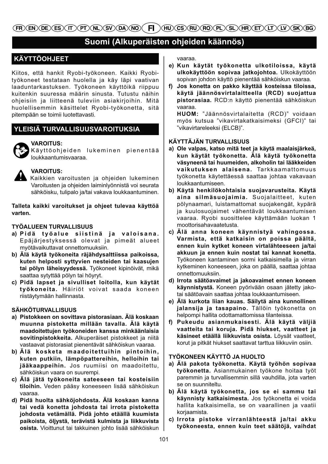 Kiitos, että hankit Ryobi-työkoneen. Kaikki Ryobityökoneet testataan huolella ja käy läpi vaativan laaduntarkastuksen. Työkoneen käyttöikä riippuu kuitenkin suuressa määrin sinusta. Tutustu näihin ohjeisiin ja liitteenä tuleviin asiakirjoihin. Mitä huolellisemmin käsittelet Ryobi-työkonetta, sitä pitempään se toimii luotettavasti. YLEISIÄ TURVALLISUUSVAROITUKSIA iF © Käyttöohjeiden lukeminen loukkaantumisvaaraa.