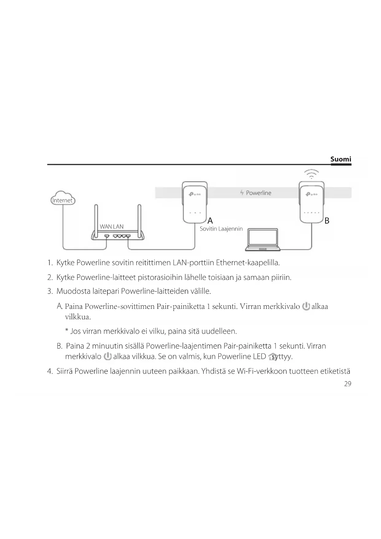 - Jos Powerline-laitteet ovat läpilaskevia, kytke jatkojohdot Powerline-laitteen integroituun pistorasiaan. Kopioi reitittimen Wi-Fi-asetukset laajentimeen Jos reititin tukee WPS:ää, voit kopioida reitittimen Wi-Fi-asetukset (SSID ja salasana) automaattisesti Powerline-laajentimeen seuraavasti.Suomi