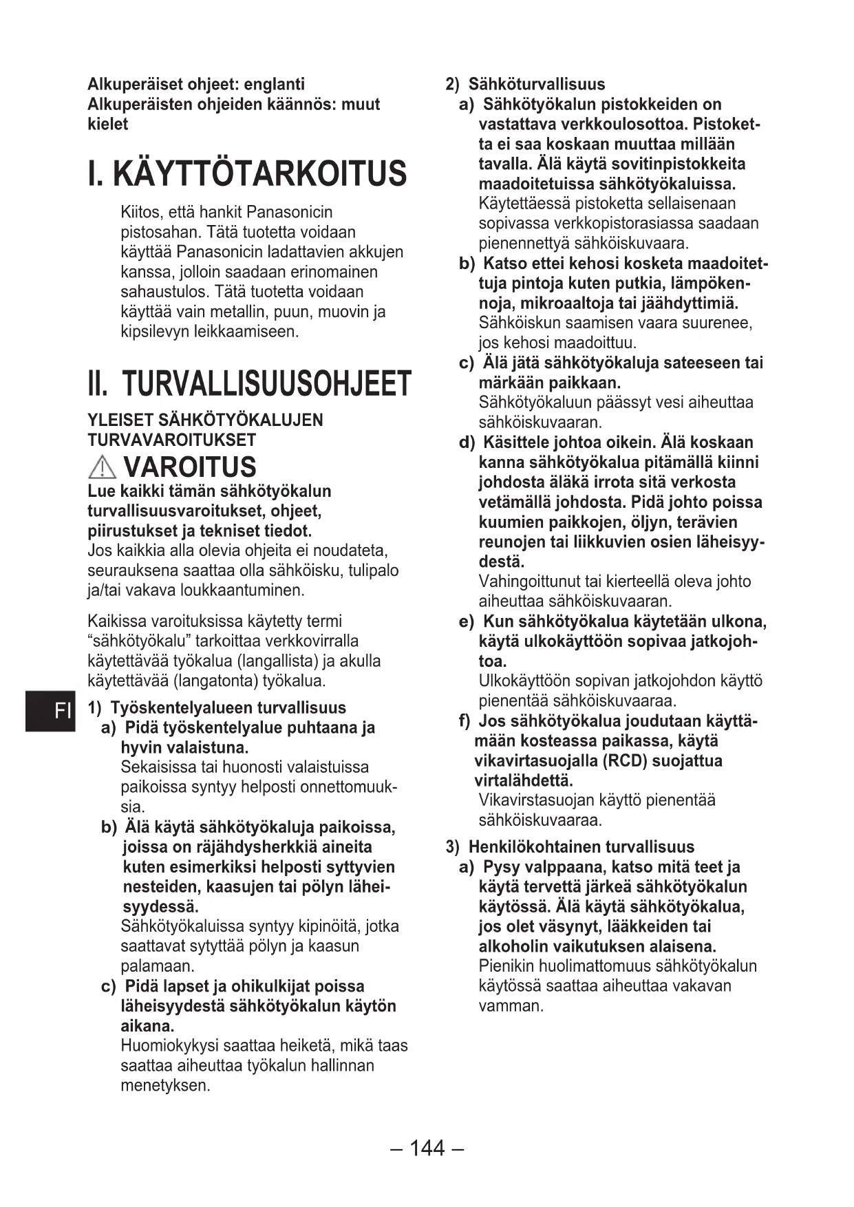 Kiitos, että hankit Panasonicin pistosahan. Tätä tuotetta voidaan käyttää Panasonicin ladattavien akkujen kanssa, jolloin saadaan erinomainen sahaustulos. Tätä tuotetta voidaan käyttää vain metallin, puun, muovin ja kipsilevyn leikkaamiseen.