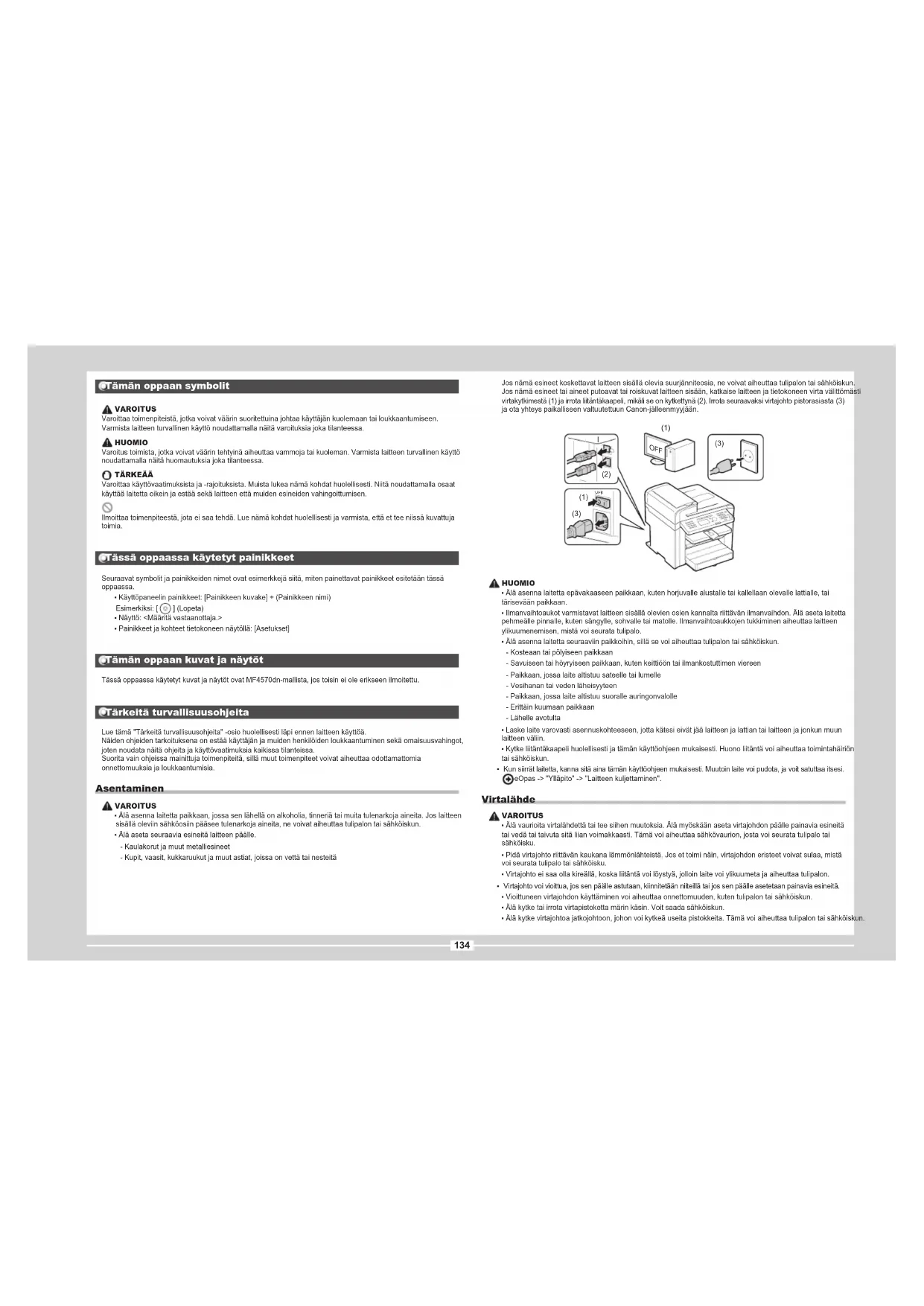 - Painikkeet ja kohteet tietokoneen näytöllä: [Asetukset] Tämän oppaan kuvat ja näytöt Tässä oppaassa käytetyt kuvat ja näytöt ovat MF4570dn-mallista, jos toisin ei ole erikseen ilmoitettu. Tärkeitä turvallisuusohjeita Lue tämä "Tärkeitä turvallisuusohjeita" -osio huolellisesti läpi ennen laitteen käyttöä. Näiden ohjeiden tarkoituksena on estää käyttäjän ja muiden henkilöiden loukkaantuminen sekä omaisuusvahingot, joten noudata näitä ohjeita ja käyttövaatimuksia kaikissa tilanteissa. Suorita vain ohjeissa mainittuja toimenpiteitä, sillä muut toimenpiteet voivat aiheuttaa odottamattomia onnettomuuksia ja loukkaantumisia. Asentaminen VAROITUS
