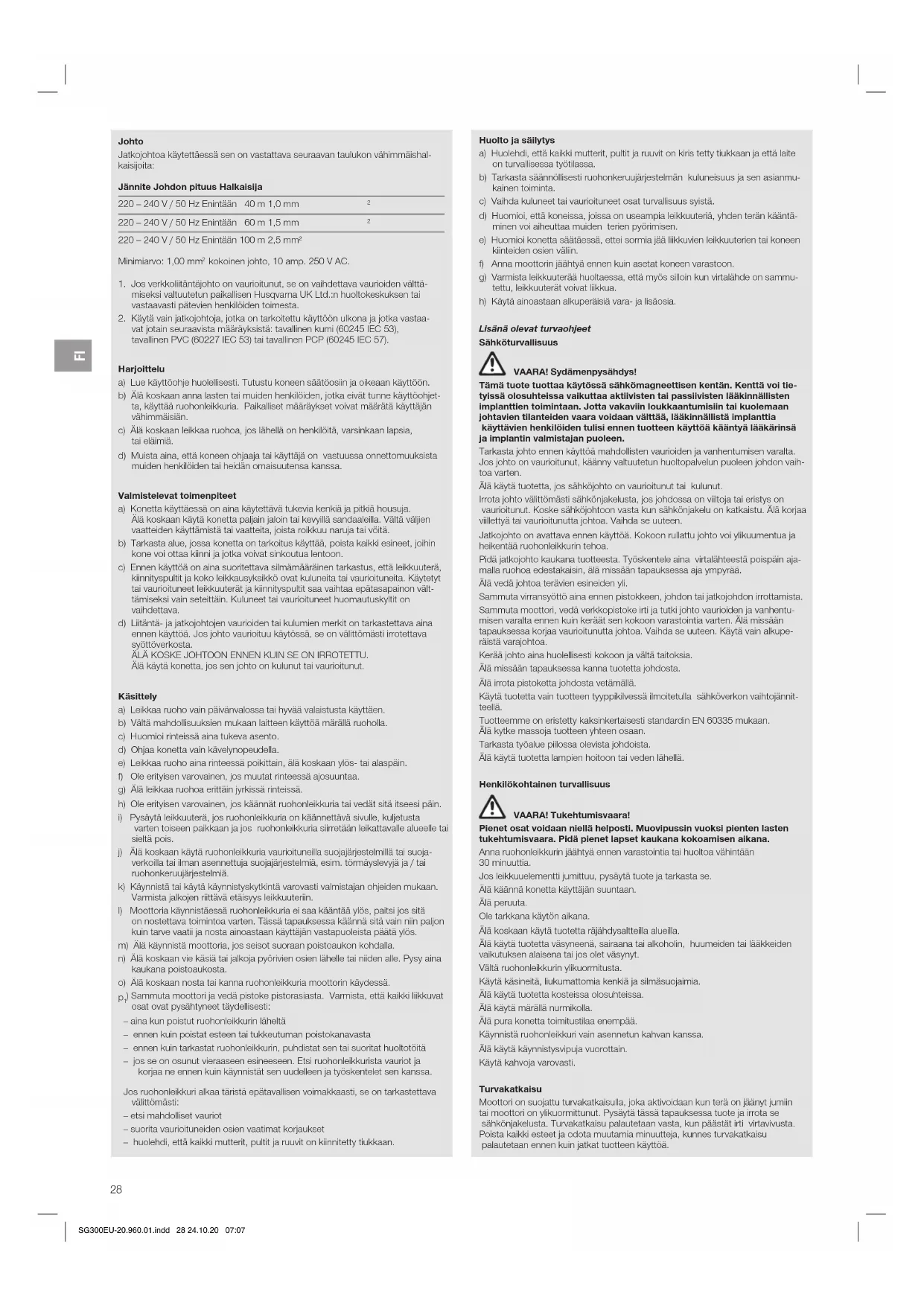 Johto Jatkojohtoa käytettäessä sen on vastattava seuraavan taulukon vähimmäishal- kaisijoita: Jännite Johdon pituus Halkaisija 220 – 240 V / 50 Hz Enintään 40 m 1,0 mm