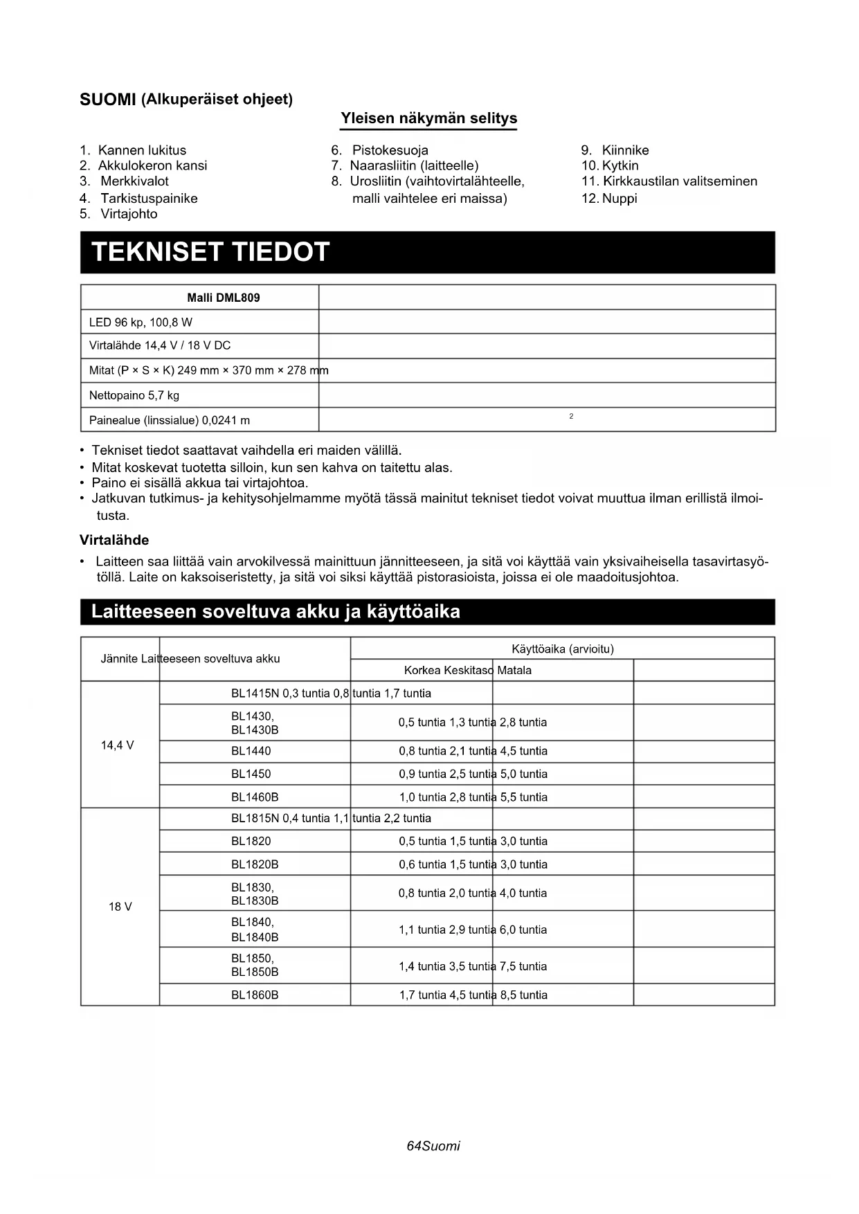 - Noen gjenstander i listen kan være inkludert i pro- duktpakken som standard tilbehør. Dette kan variere fra land til land.64 Suomi SUOMI (Alkuperäiset ohjeet) Yleisen näkymän selitys 1. Kannen lukitus2. Akkulokeron kansi3. Merkkivalot4. Tarkistuspainike5. Virtajohto6. Pistokesuoja7. Naarasliitin (laitteelle)8. Urosliitin (vaihtovirtalähteelle, malli vaihtelee eri maissa)9. Kiinnike10. Kytkin11. Kirkkaustilan valitseminen12. Nuppi TEKNISET TIEDOT Malli DML809LED 96 kp, 100,8 WVirtalähde 14,4 V / 18 V DCMitat (P × S × K) 249 mm × 370 mm × 278 mmNettopaino 5,7 kgPainealue (linssialue) 0,0241 m